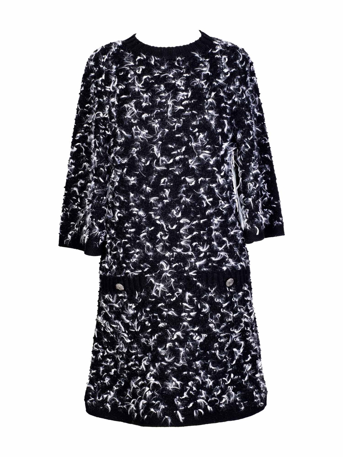 Chanel Dress or . This dress is in black and white knitted tweed with Chanel pewter chain buttons, featuring two button pockets. A gorgeous all season Chanel Dress.
