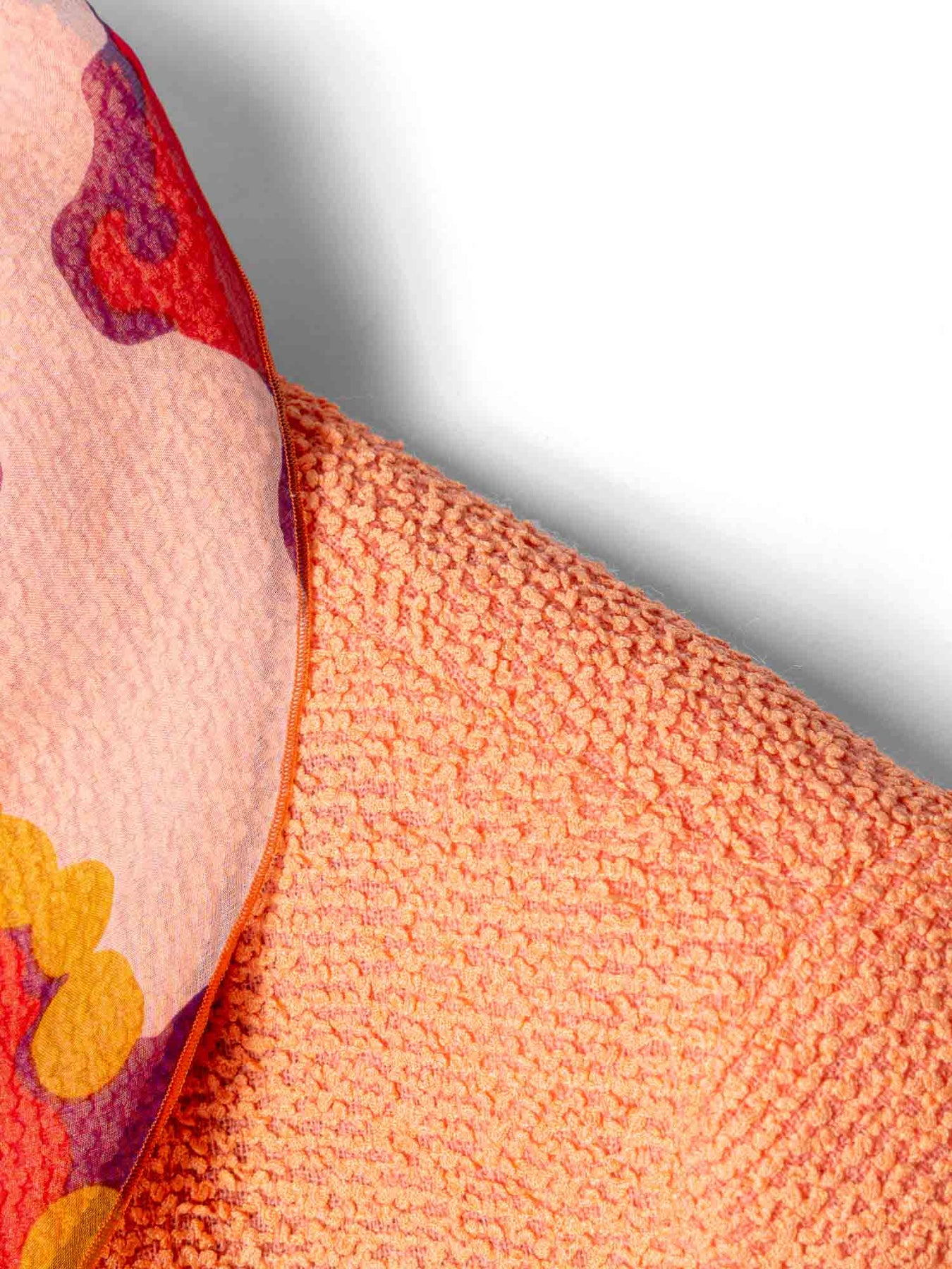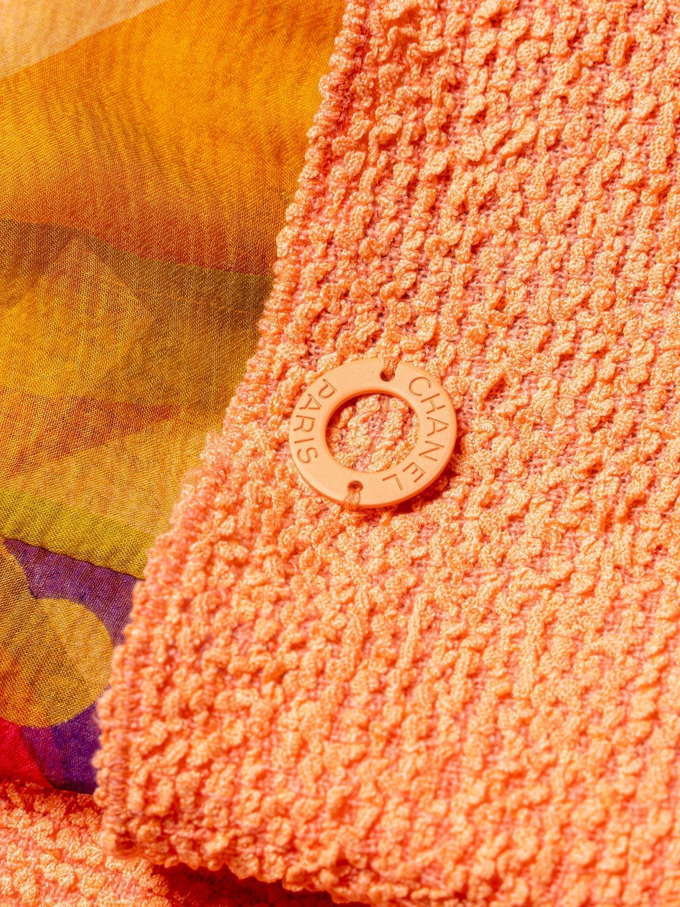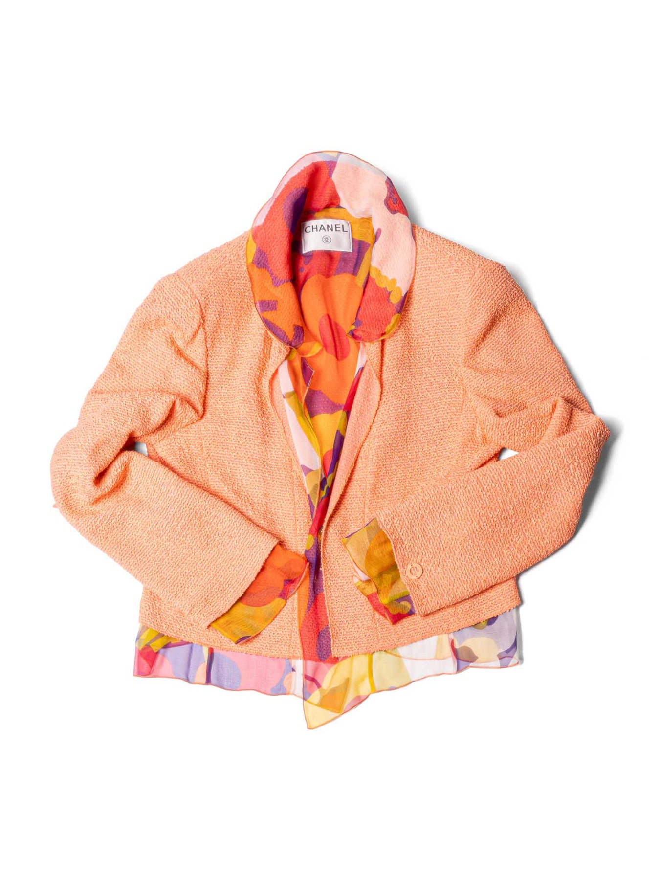 Chanel Jacket or . This beautiful jacket is in orange tweed with silk fringe throughout. It features  an intricate silk lining with beautiful shades of purple, orange, pink, and yellow.