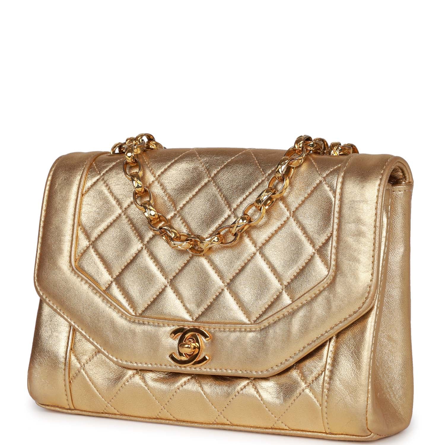 This Vintage flap bag is in gold metalltic lambskin leather in gold hardware, a front flap with signature CC logo turnlock and a gold chain link shoulder/crossbody strap.
