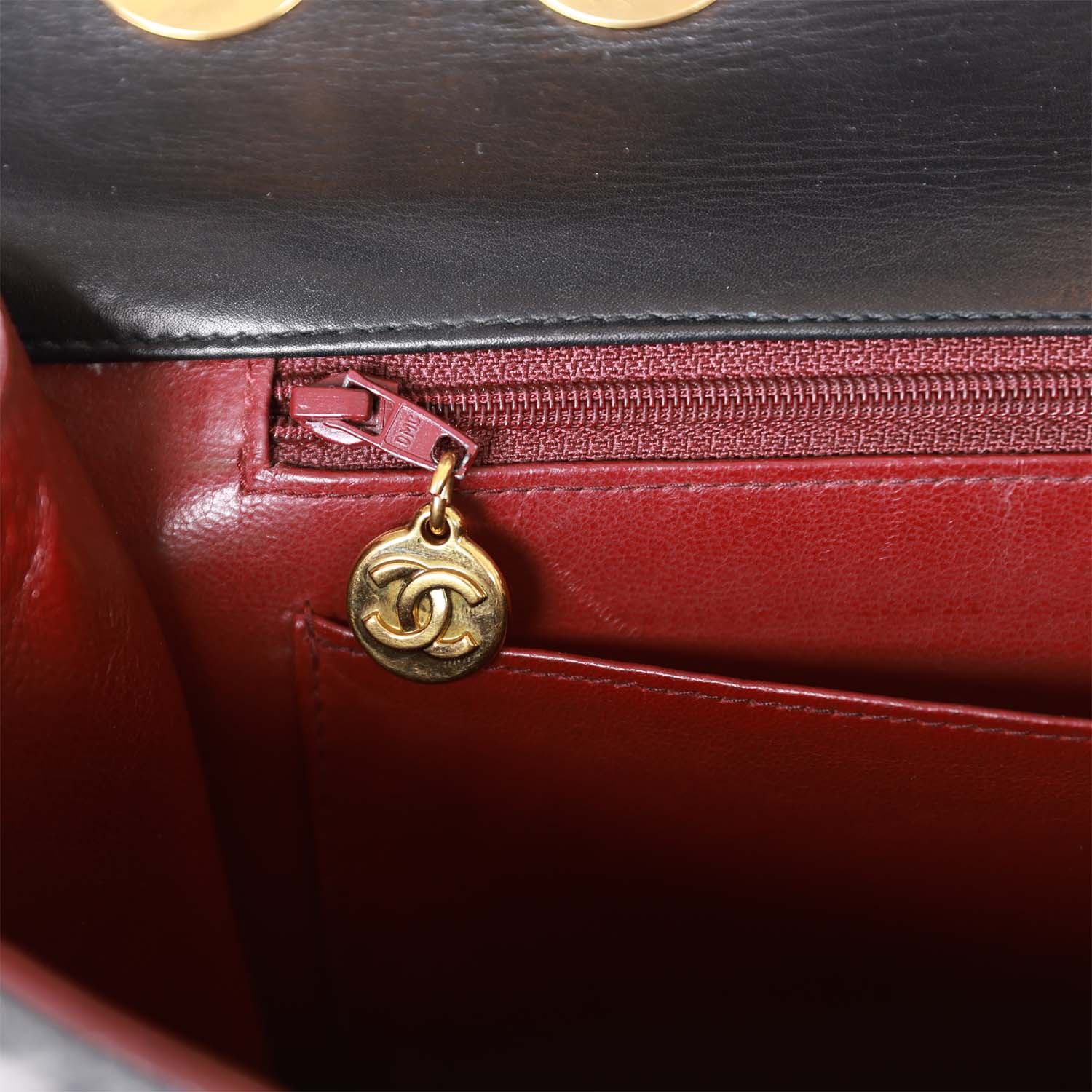 This Vintage Maxi Flap is in Black lambskin leather bag with gold hardware and features a signature CC turnlock closure, half moon back pocket and interwoven black and gold shoulder/crossbody strap.