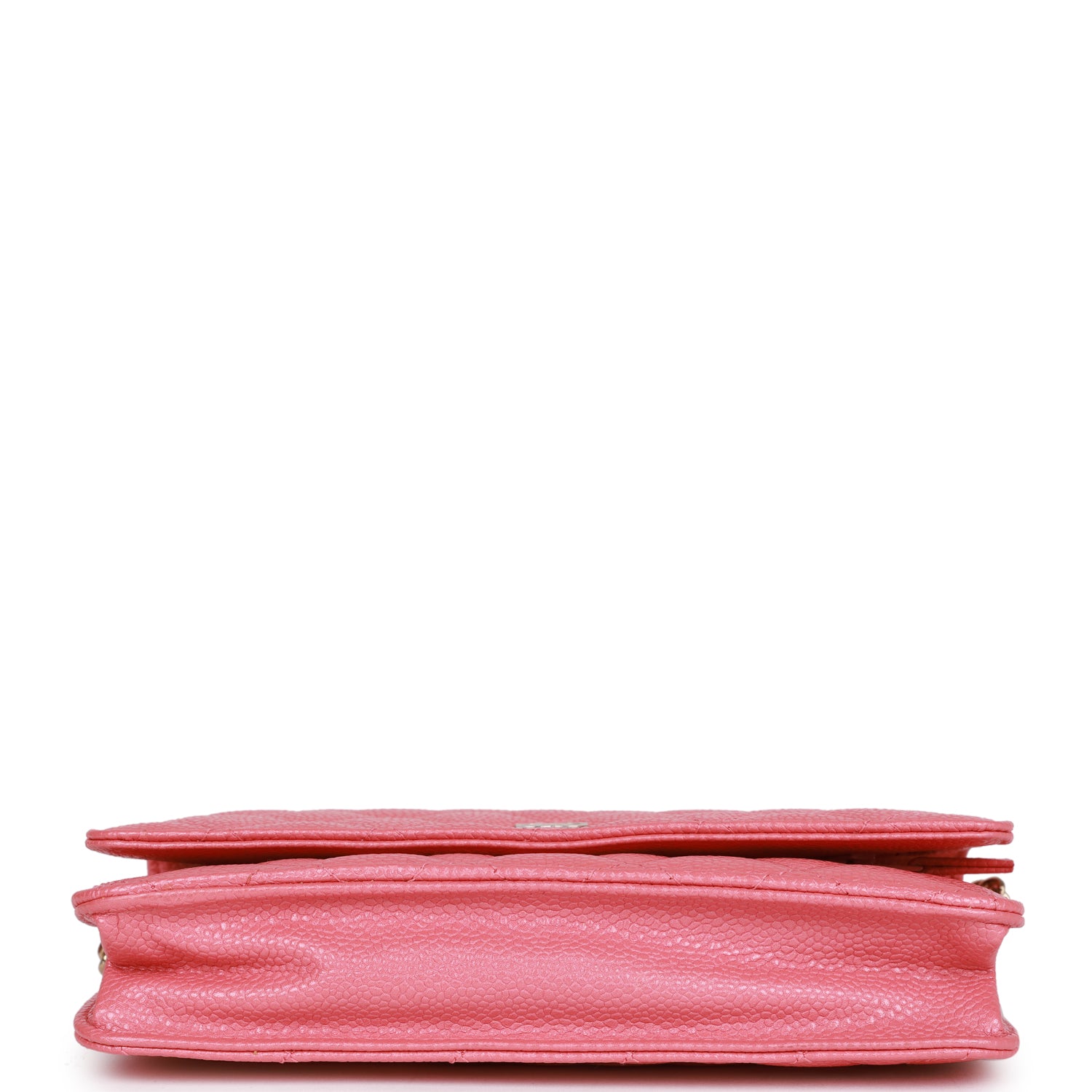 This Wallet on Chain is in Pink caviar with light gold tone hardware and has a front flap with CC emblem and magnetic snap closure, half moon back pocket and long light gold tone metal and pink leather chain.