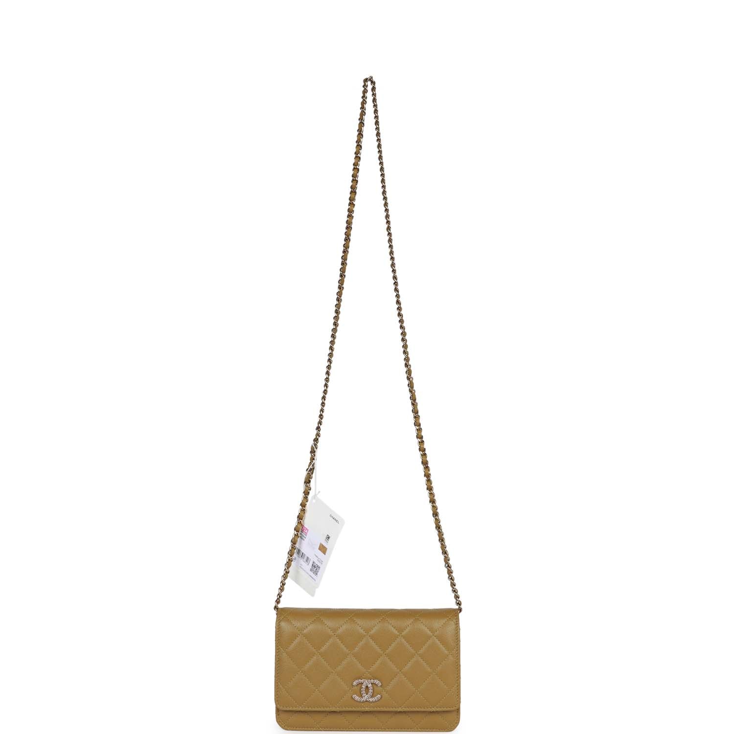 This Wallet On Chain is of Olive Green caviar leather with light gold tone hardware, has a front flap with faux crystal CC emblem, and a long light gold tone metal and olive green leather chain.