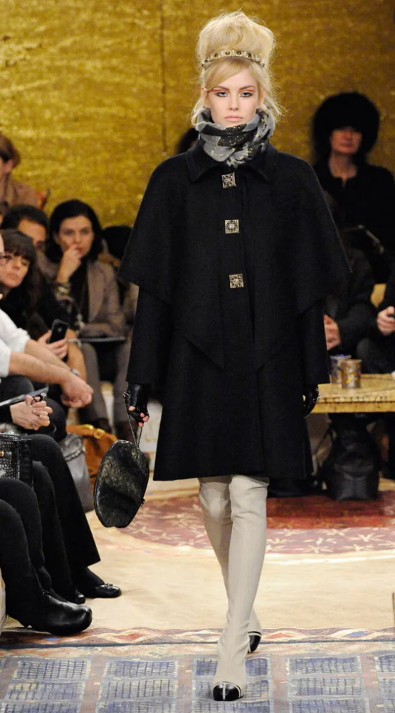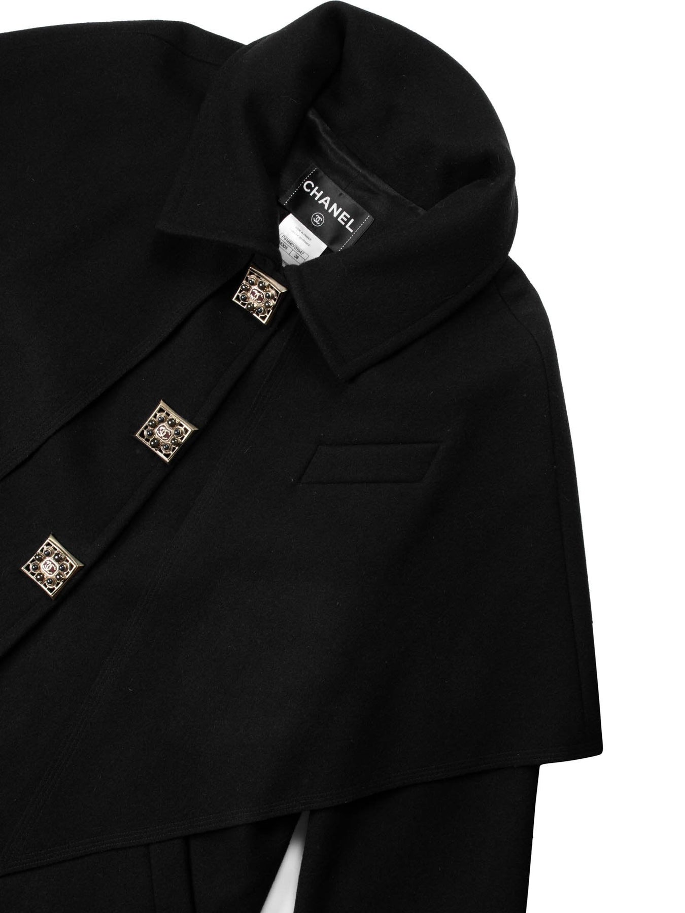 Chanel Coat or . This sensational Chanel coat is in lush black wool fabric featuring Gripoix brooch snap button closure, cape detailing, two front pockets and black silk lining. It sold out at full price as soon as it arrived to the Chanel stores, retailed for over 10K.