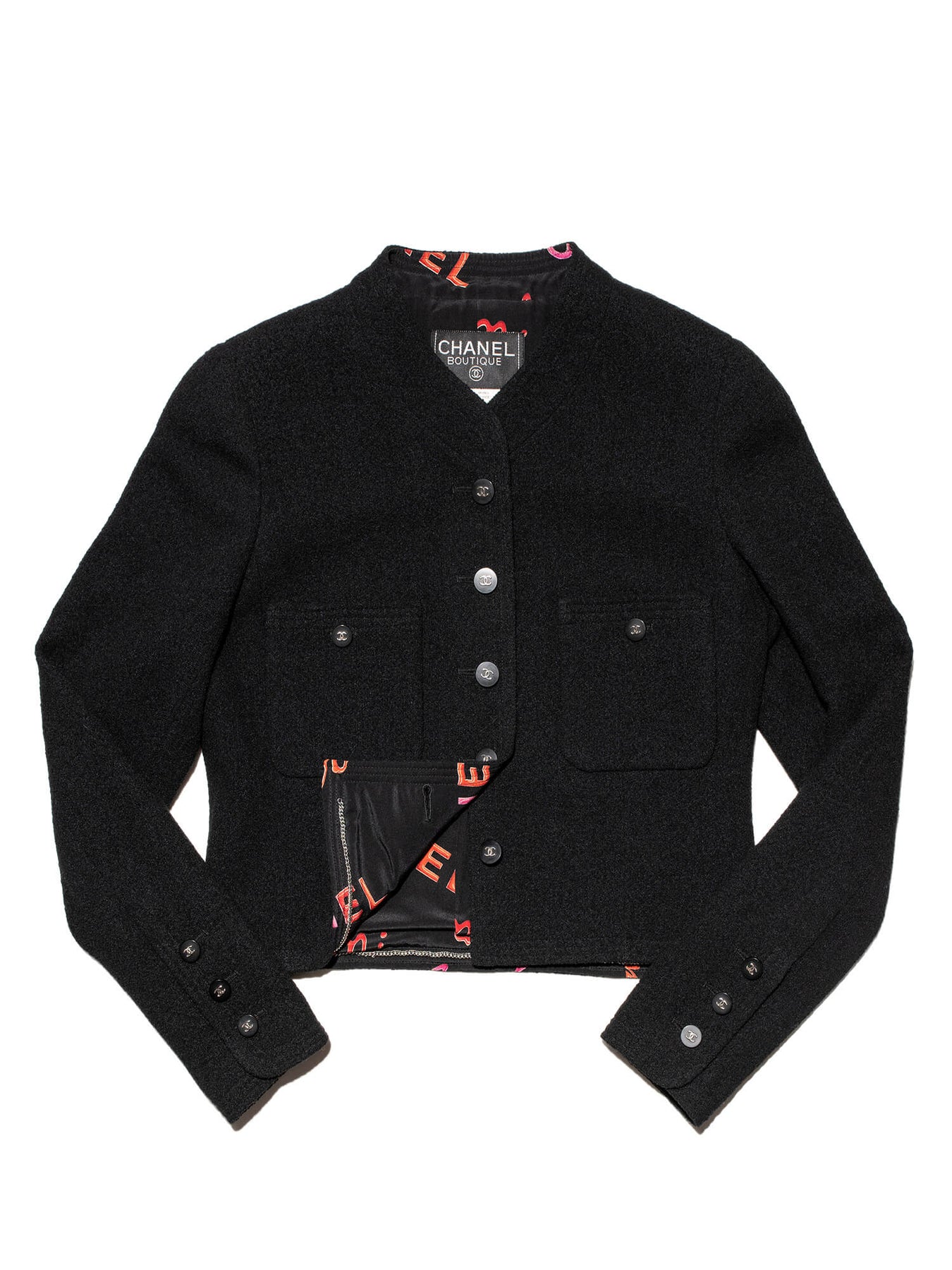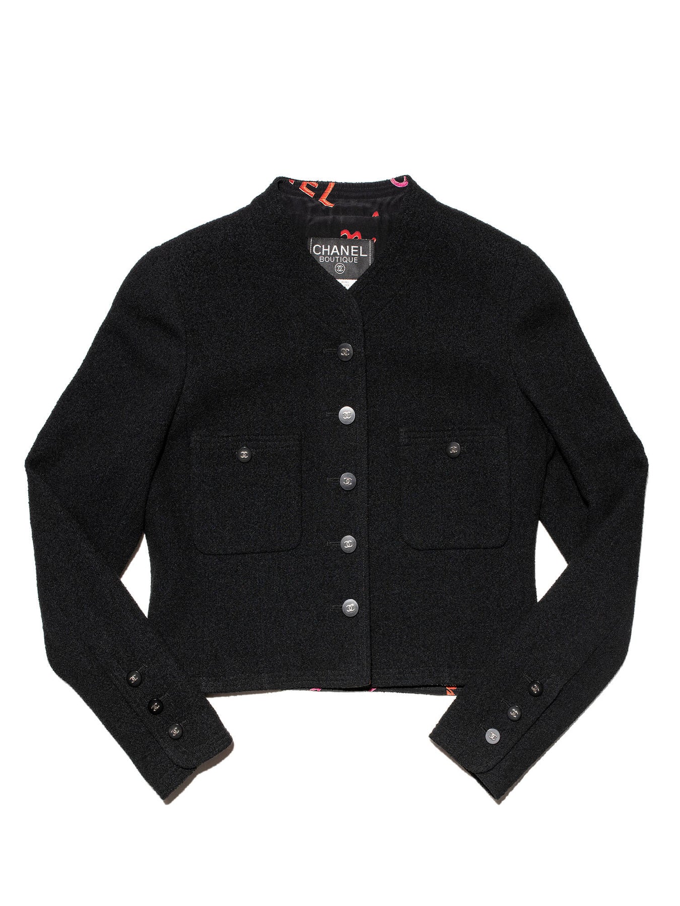 Chanel Jacket or . This Chanel Jacket is in black wool tweed with silver CC logo buttons on the cuffs, front pockets and button closure front. It features 2 front breast pockets, multicolor Chanel logo silk lining, and chain detailing on the hem.
