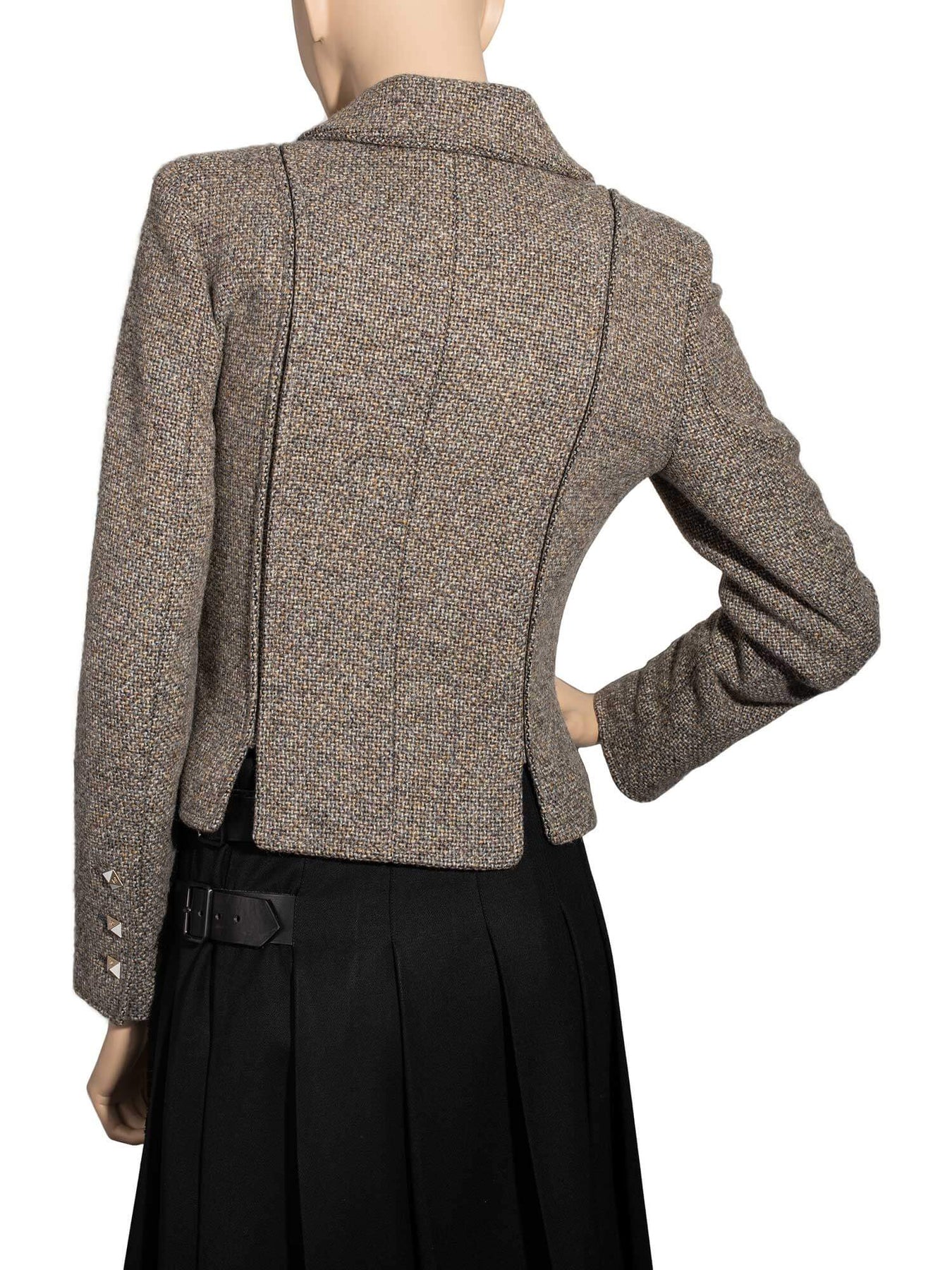 Chanel Tweed Jacket or . This Chanel Blazer is in beige wool tweed with beautiful square CC logo buttons in silver and gold. It features olive green silk lining and a flattering silhouette.