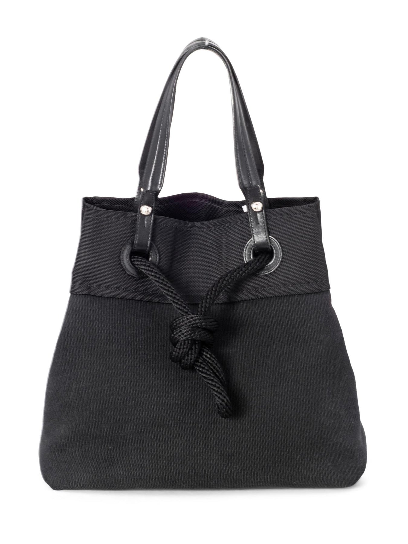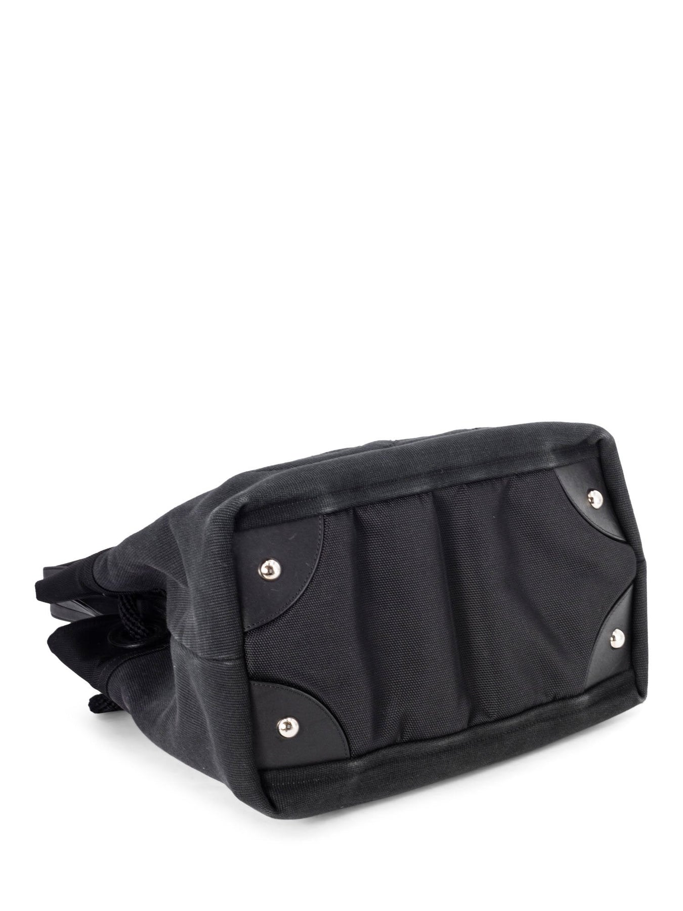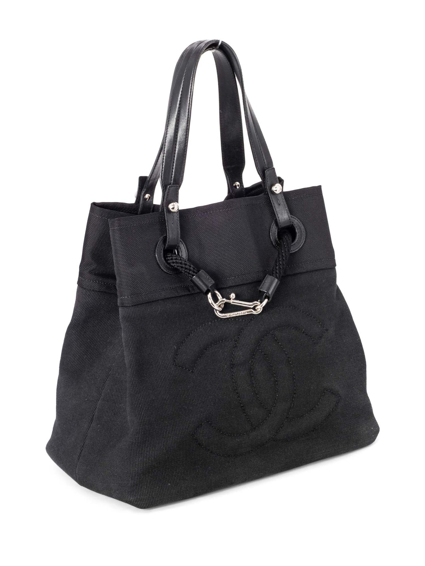 Chanel XL Drawstring Rope Bag or . It  is in black leather/canvas combo. It features double handle leather straps and boat rope closure, silver tone hardware, boat rope drawstring closure, boating hook keychain detail Interior, black satin lining Interior, center zippered pocket, and two additional interior pockets.