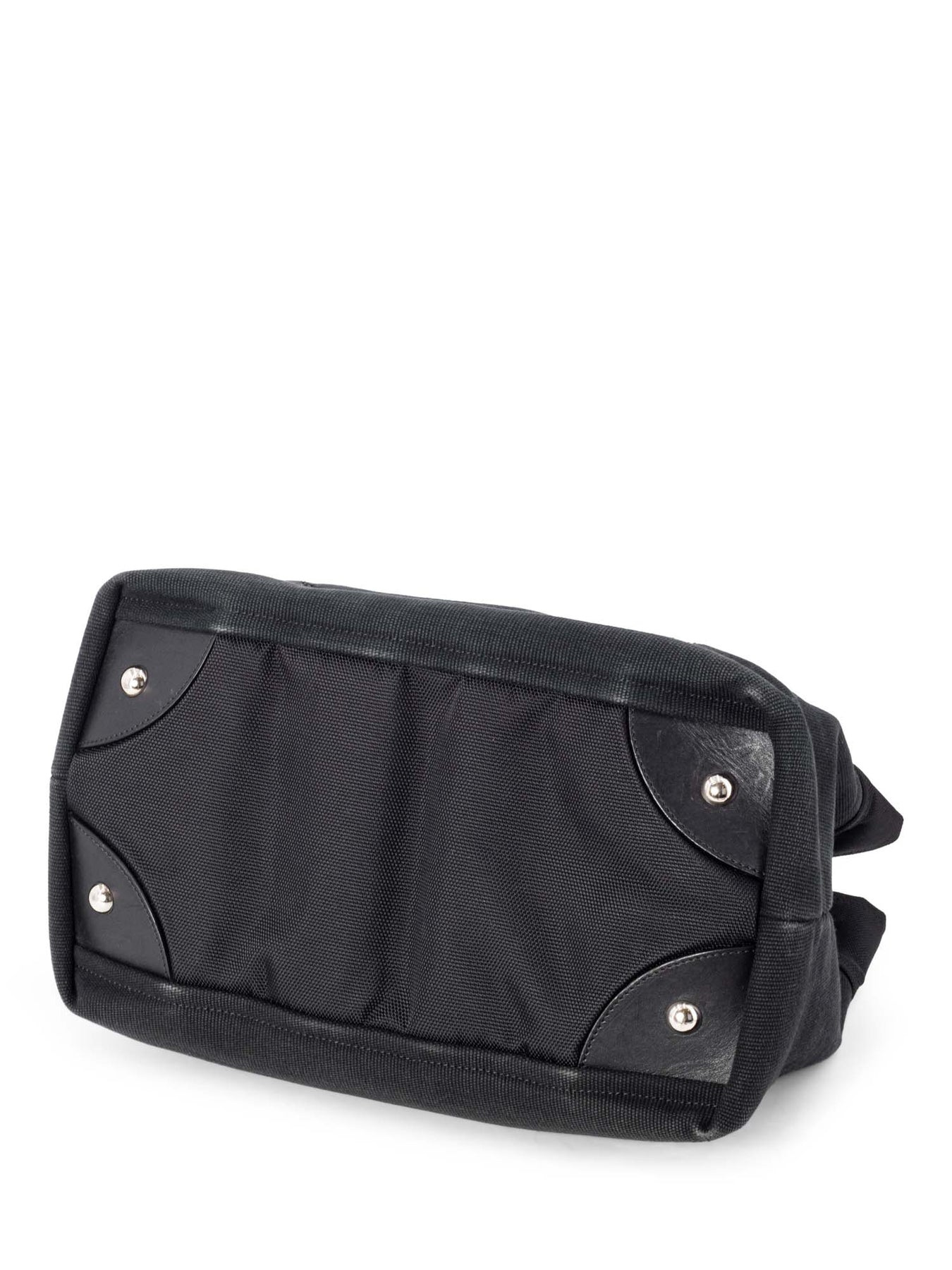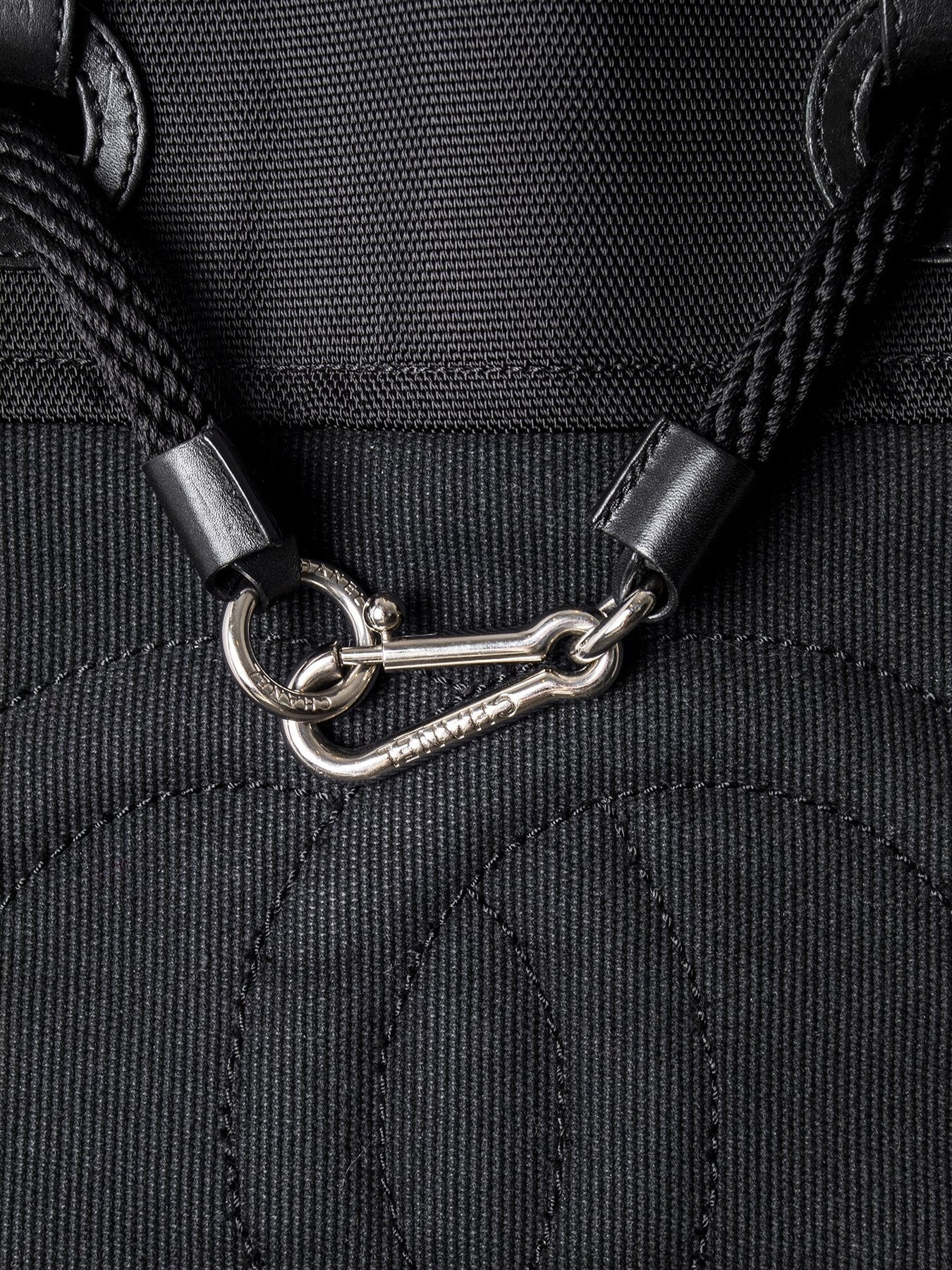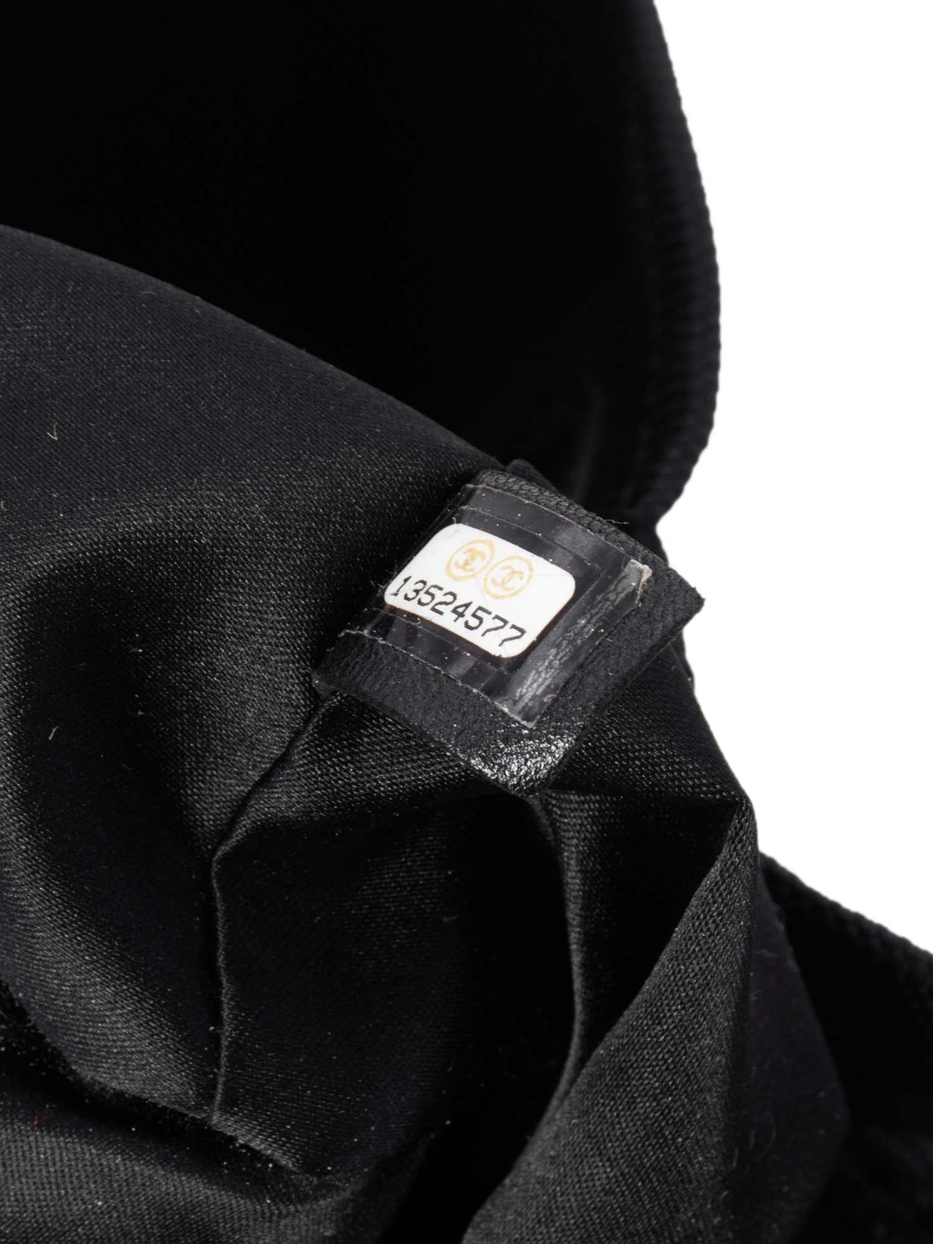 Chanel XL Drawstring Rope Bag or . It  is in black leather/canvas combo. It features double handle leather straps and boat rope closure, silver tone hardware, boat rope drawstring closure, boating hook keychain detail Interior, black satin lining Interior, center zippered pocket, and two additional interior pockets.
