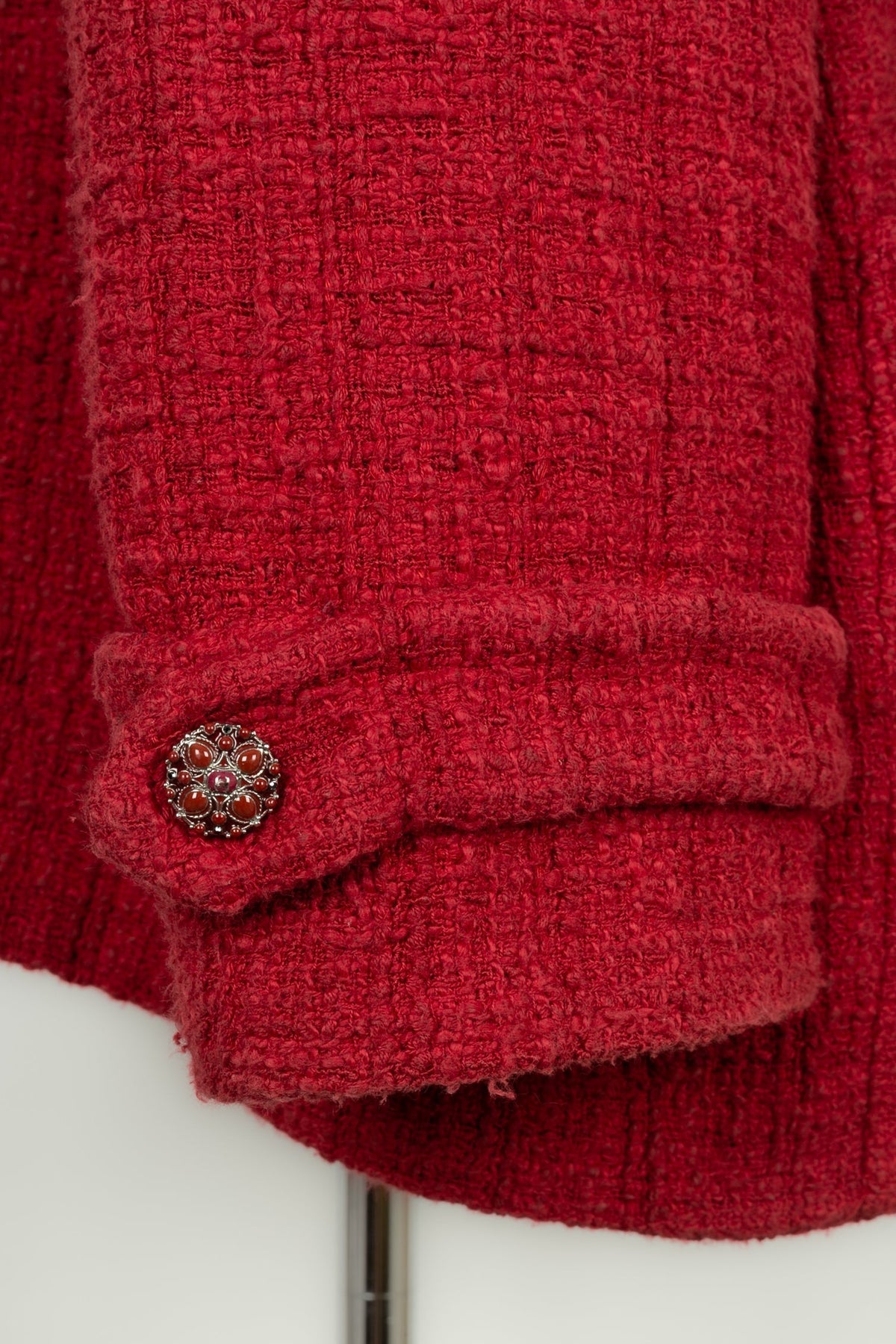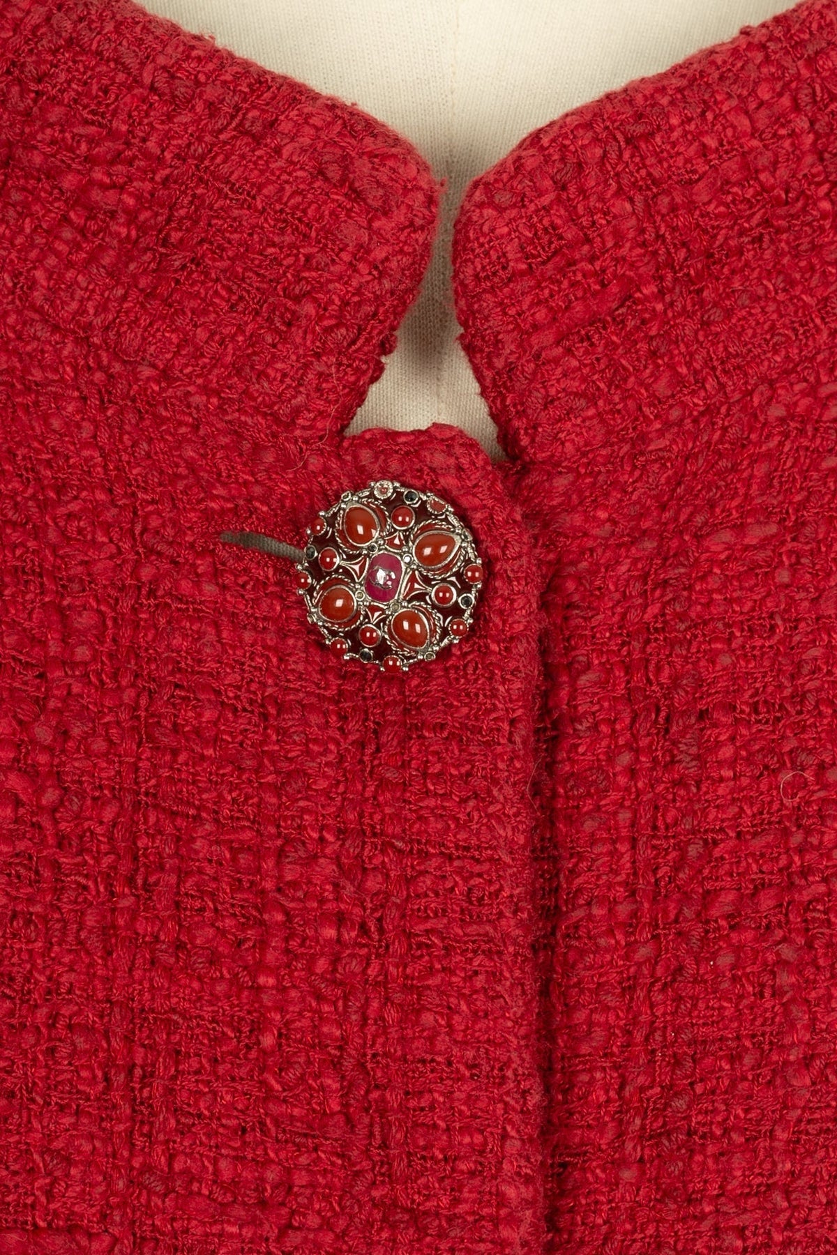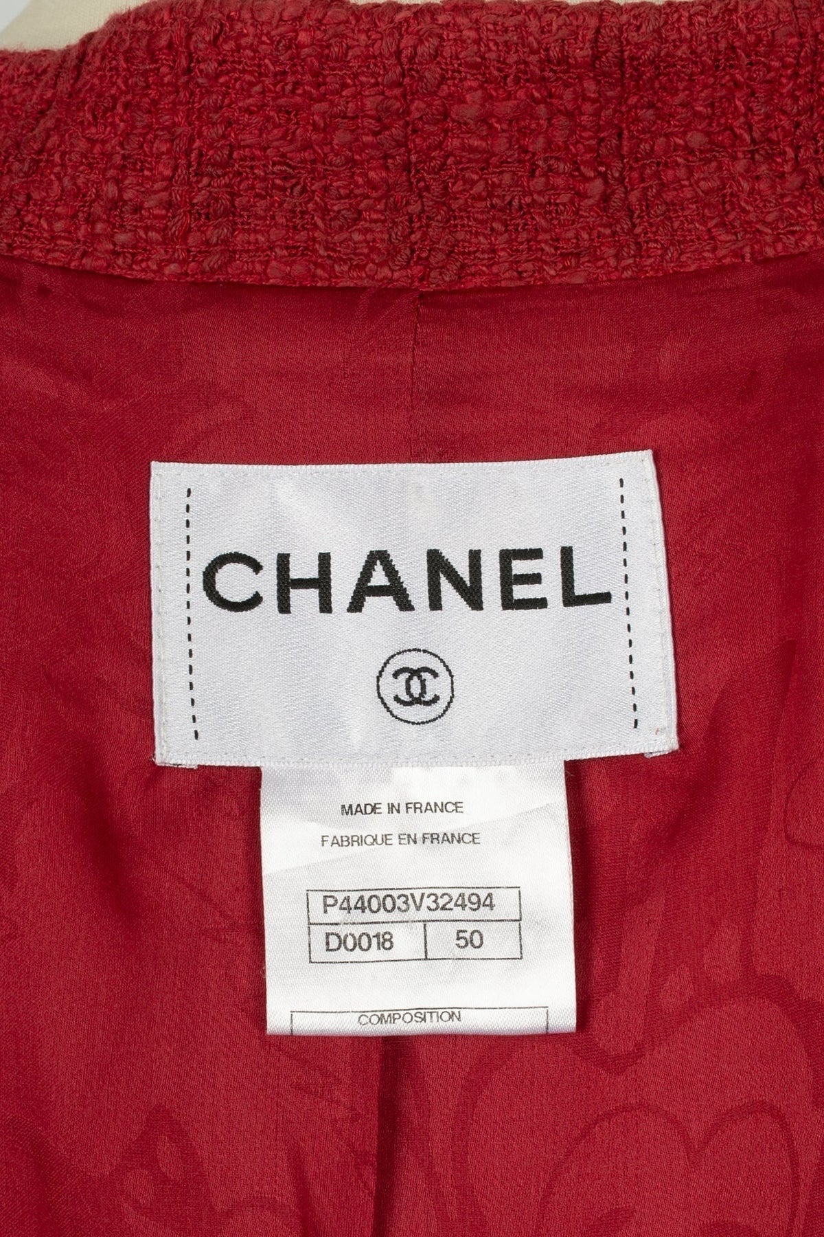 CHANEL -(Made in France) Veste rouge en tweed de coton et doublure en soie. Taille 50FR.