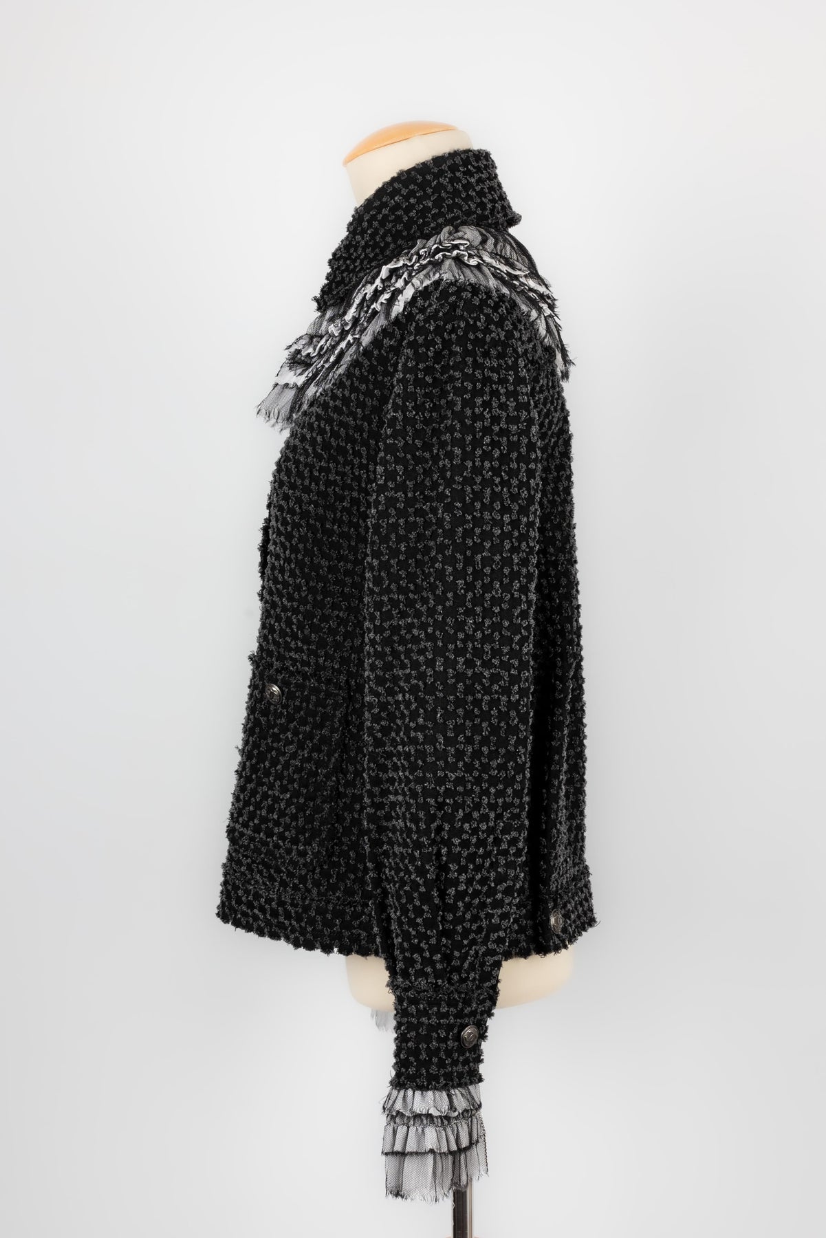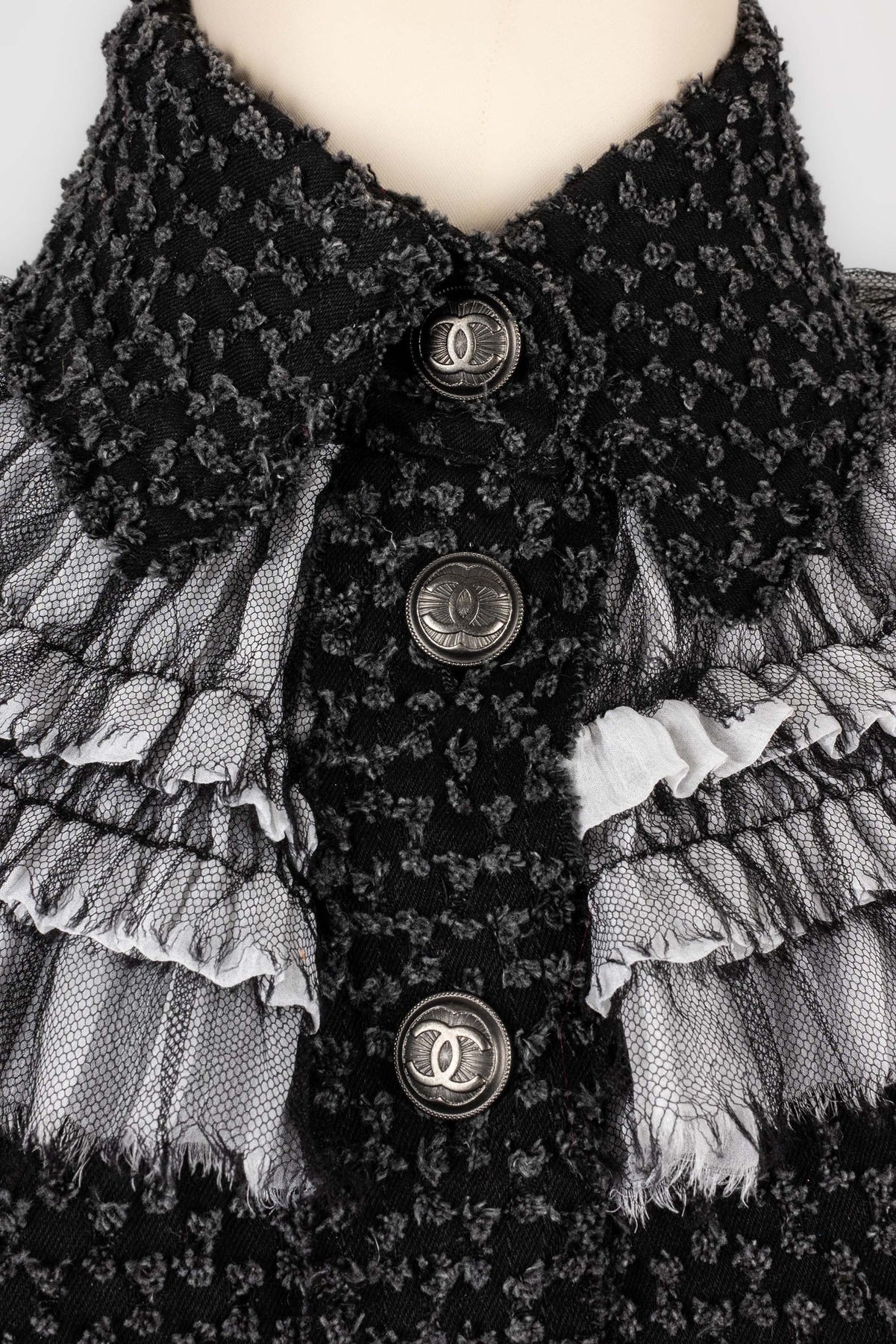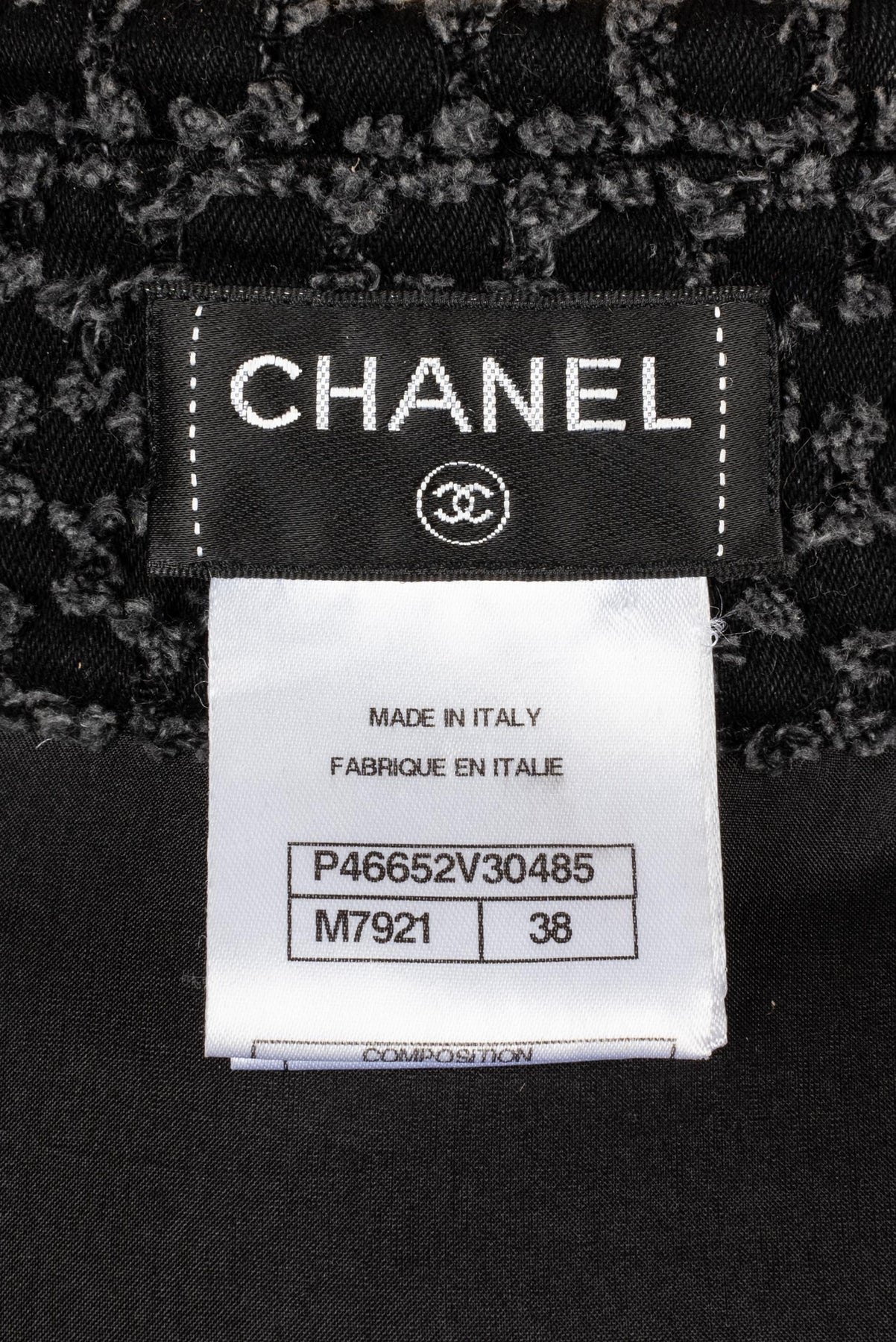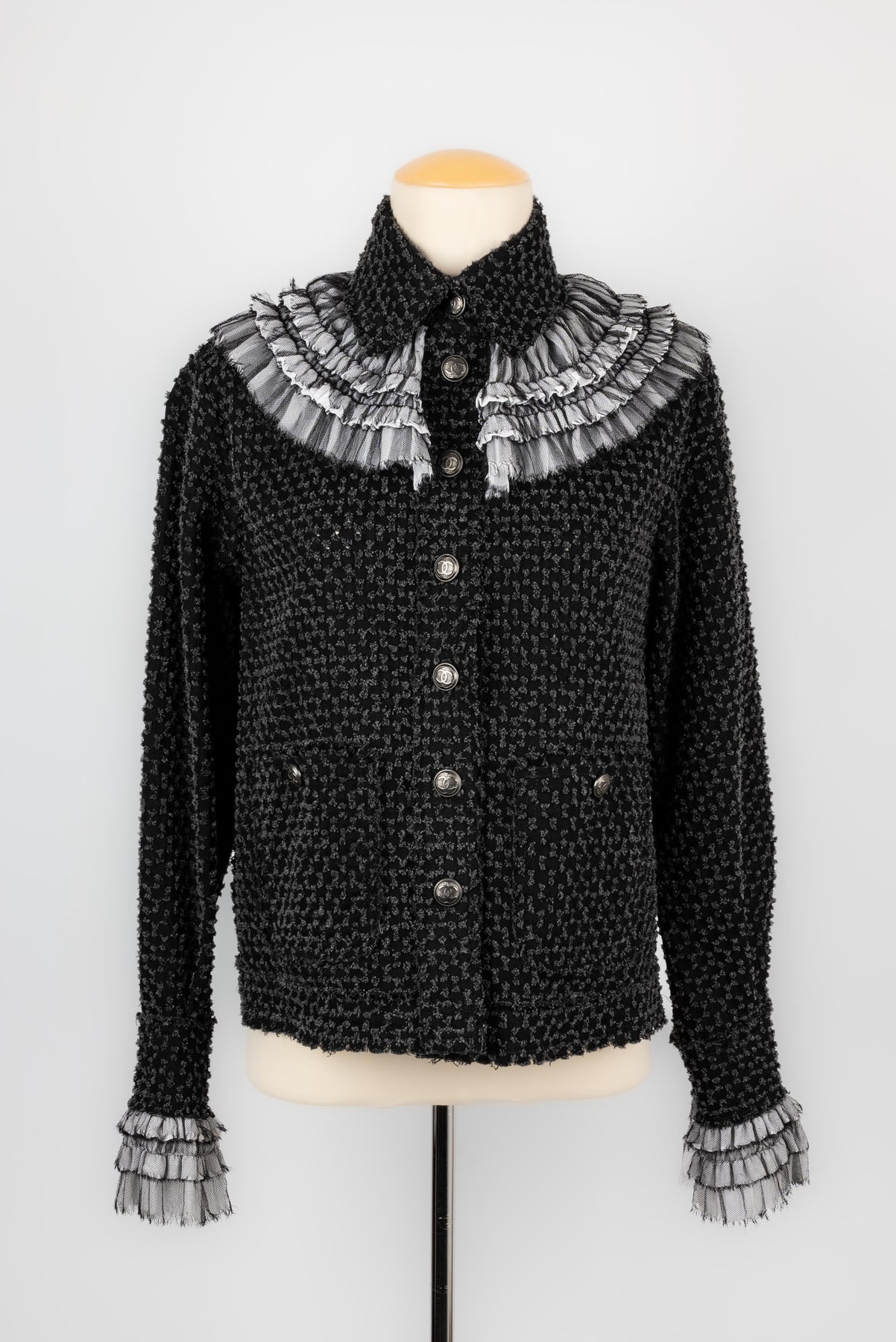 CHANEL - (Made in Italy) Veste en tweed de coton, bas de manches et tour de col en soie. Taille 38FR.