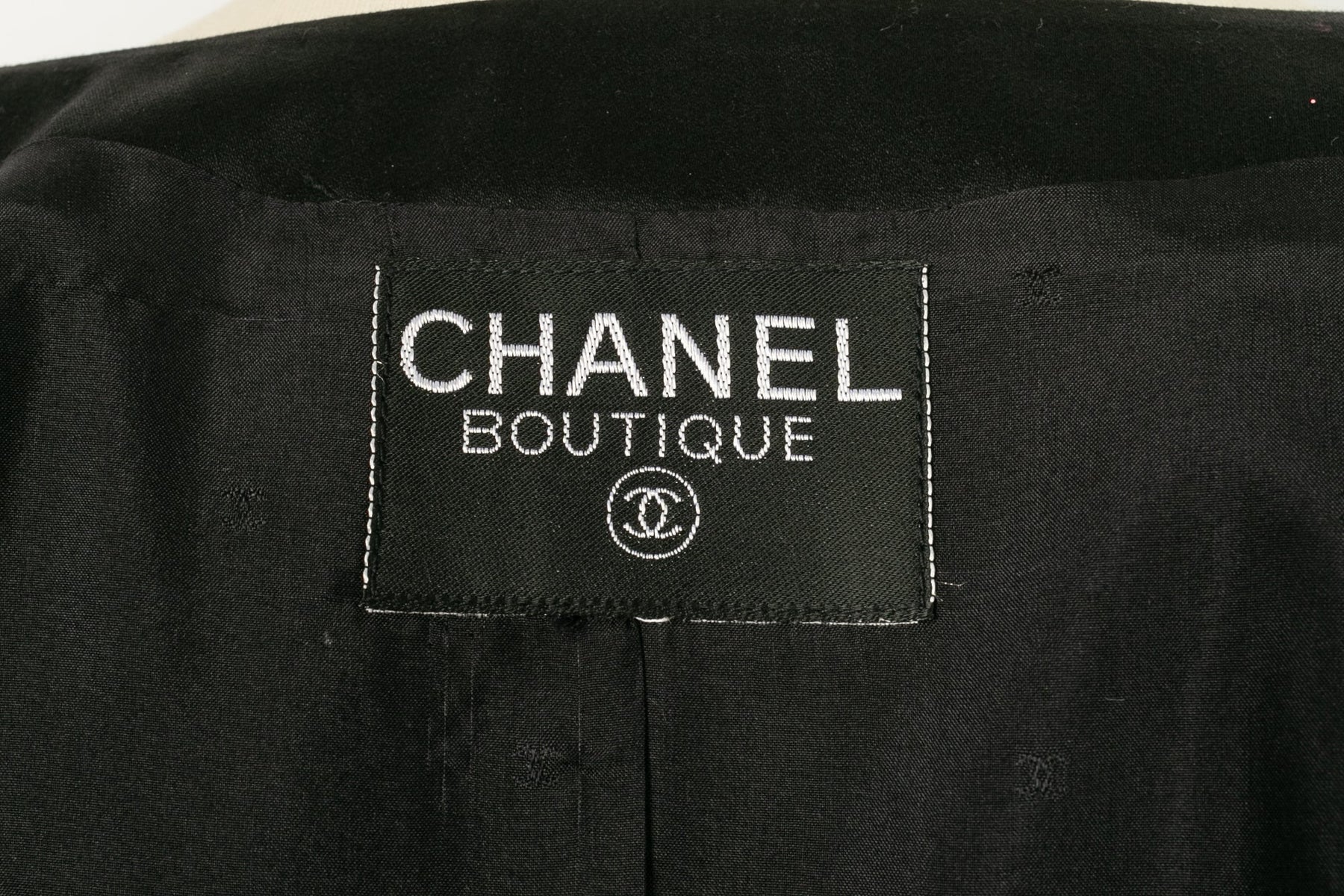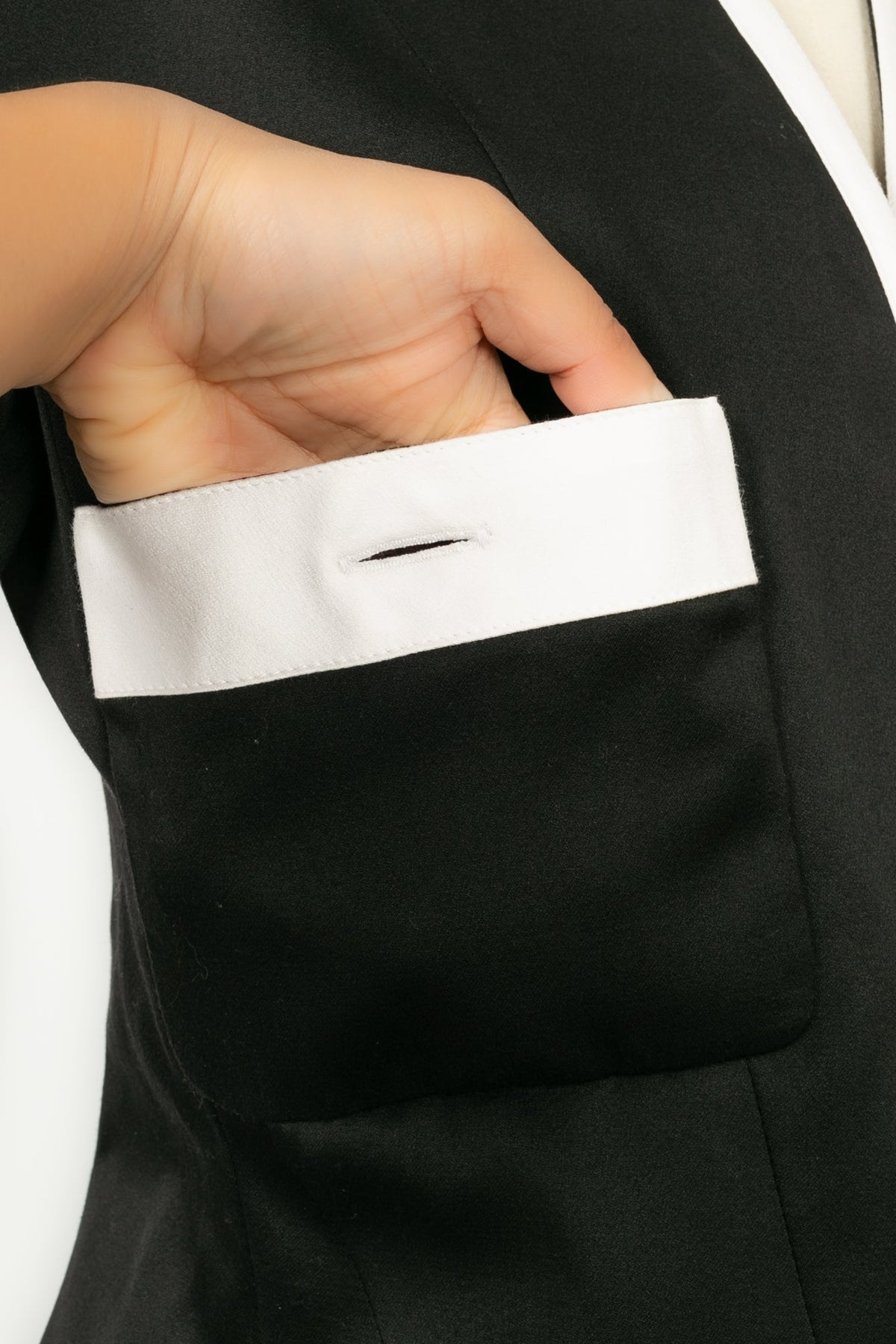 CHANEL -Veste à manches courtes en satin noir bordé de satin blanc. Pas de taille indiquée, elle convient à un 40FR/42FR.