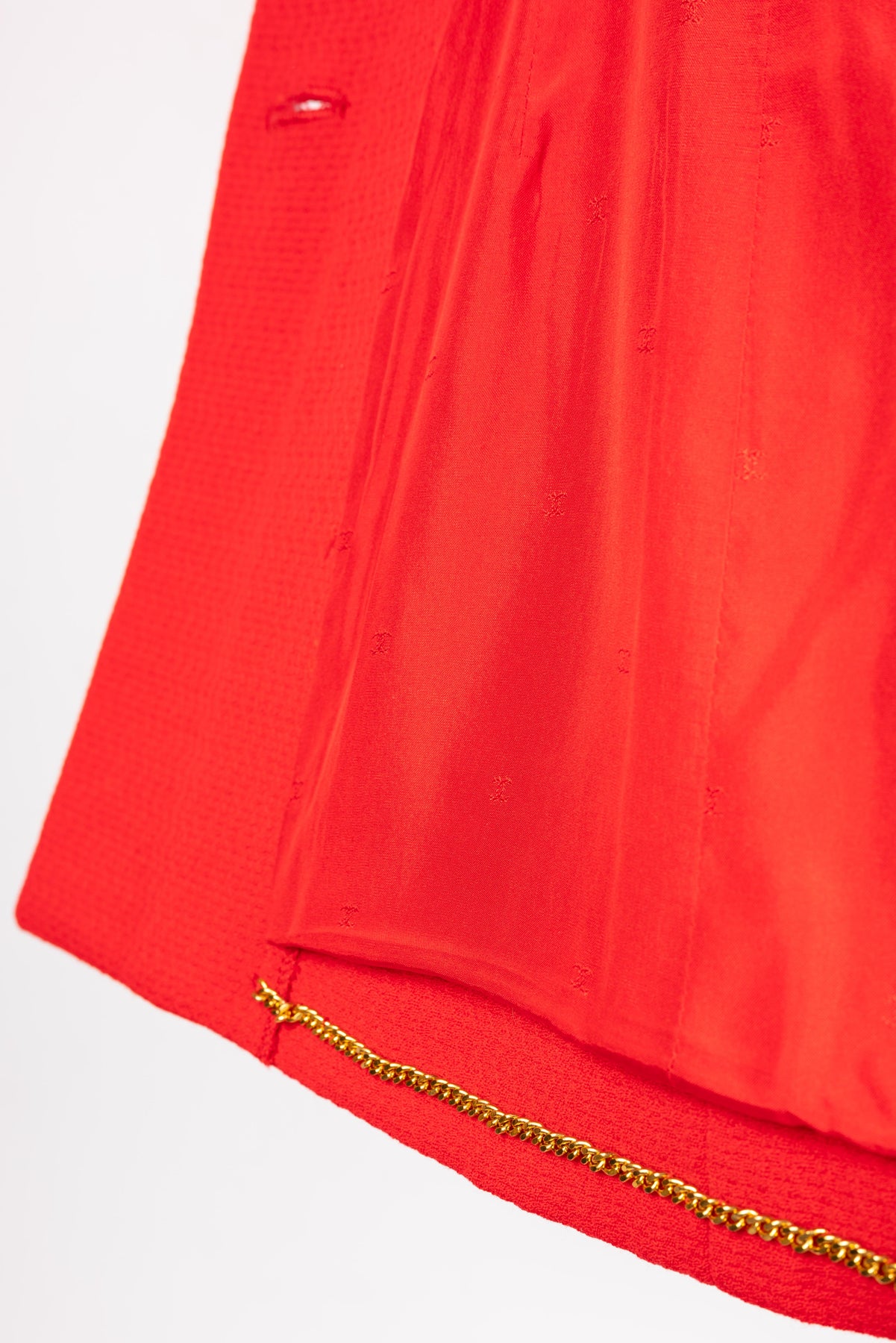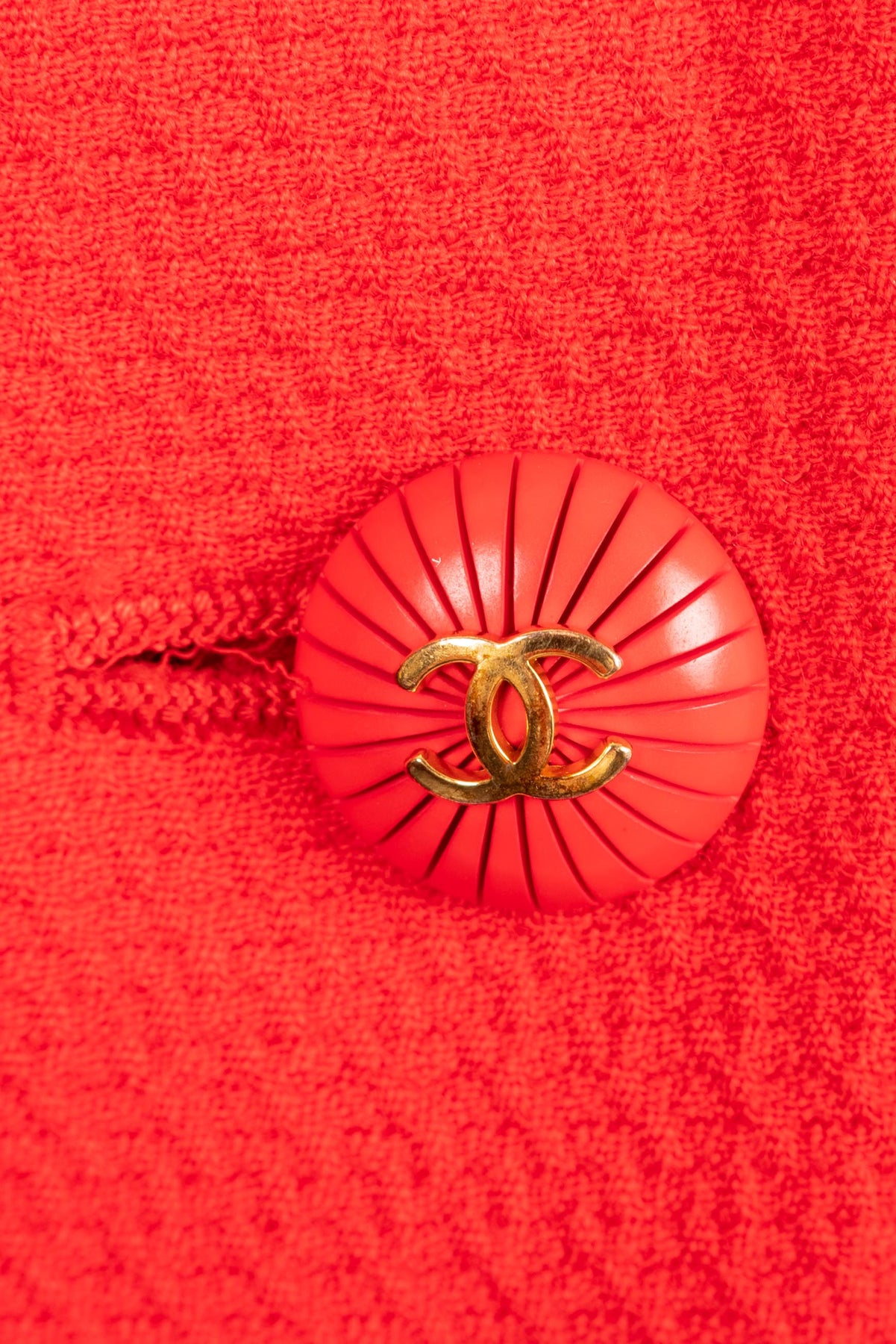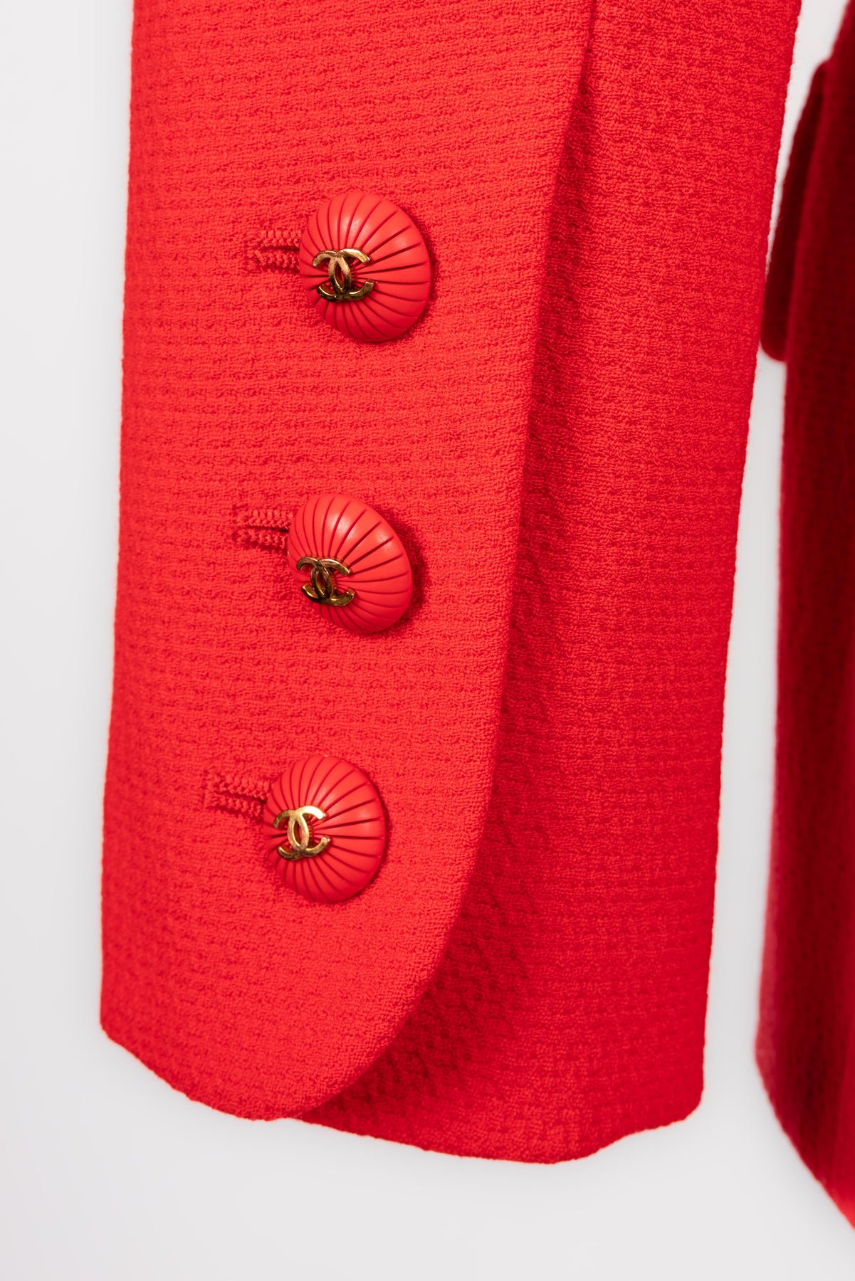 CHANEL - (Made in France) Veste en laine rouge, boutons en résine et métal doré. Doublure en soie. Taille 40FR. Collection Printemps/Eté 1993.