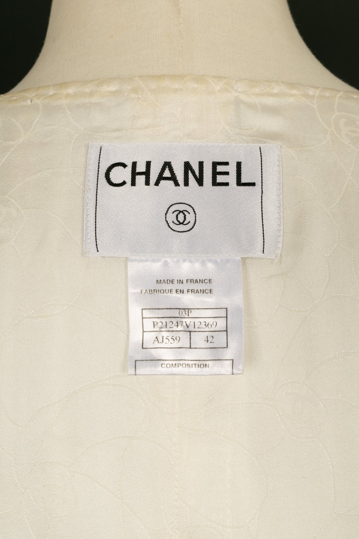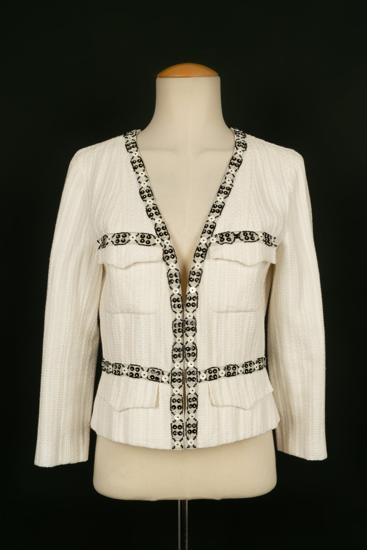 CHANEL -(Made in France) Veste en coton et lin blanc brodée de perles et paillettes. Doublure en soie. Taille 42FR. Collection Printemps/Eté 2003. A signaler, présence de taches sous les aisselles.