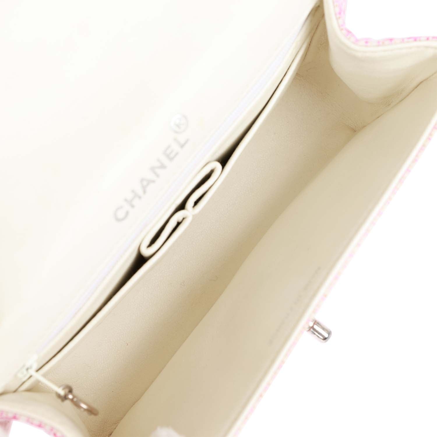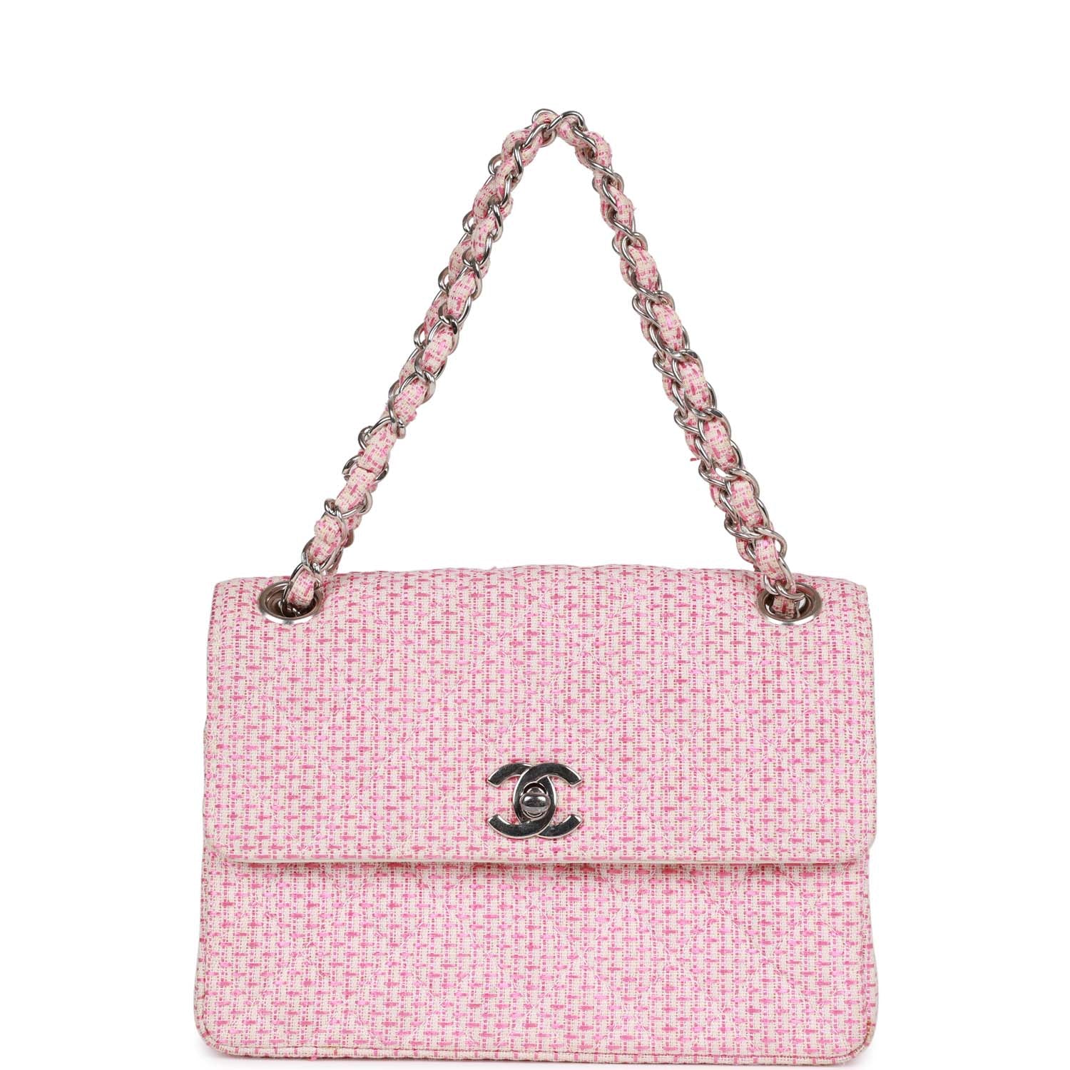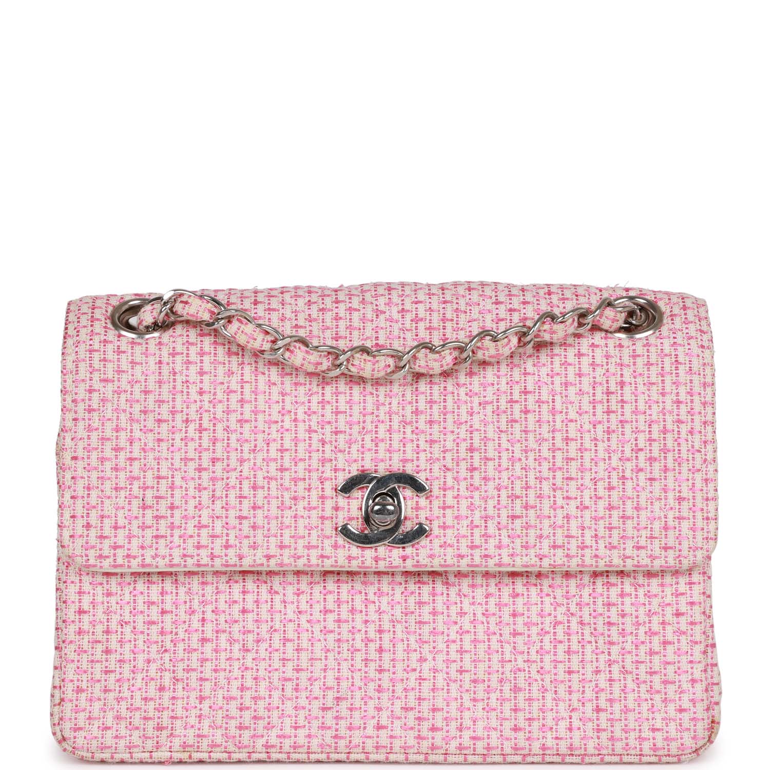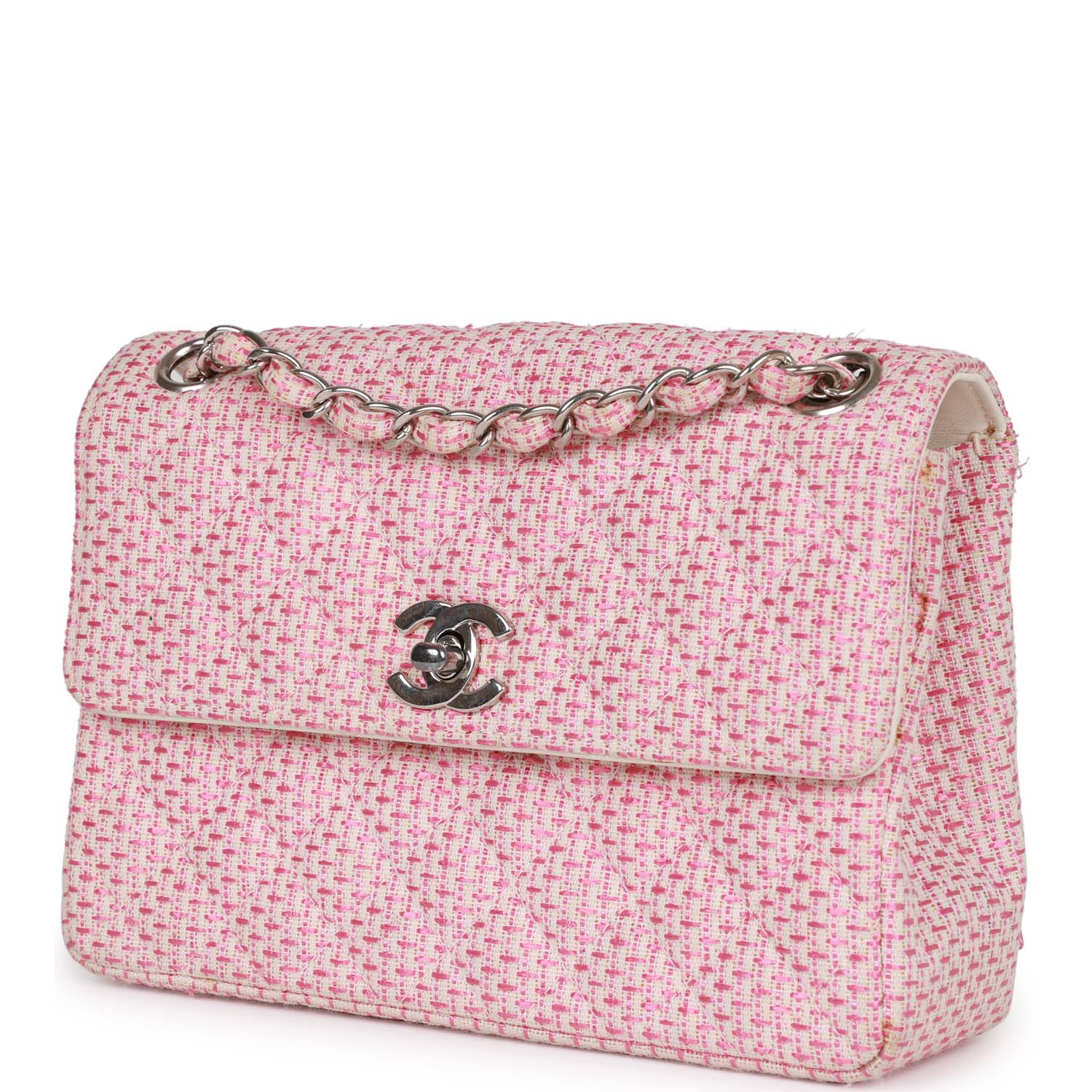 This Vintage Mini Flap Bag is in Pink and White tweed boucle with silver hardware and has a front flap with signature CC turnlock closure and an interwoven silver plated chain link and pink and white tweed shoulder/crossbody strap.