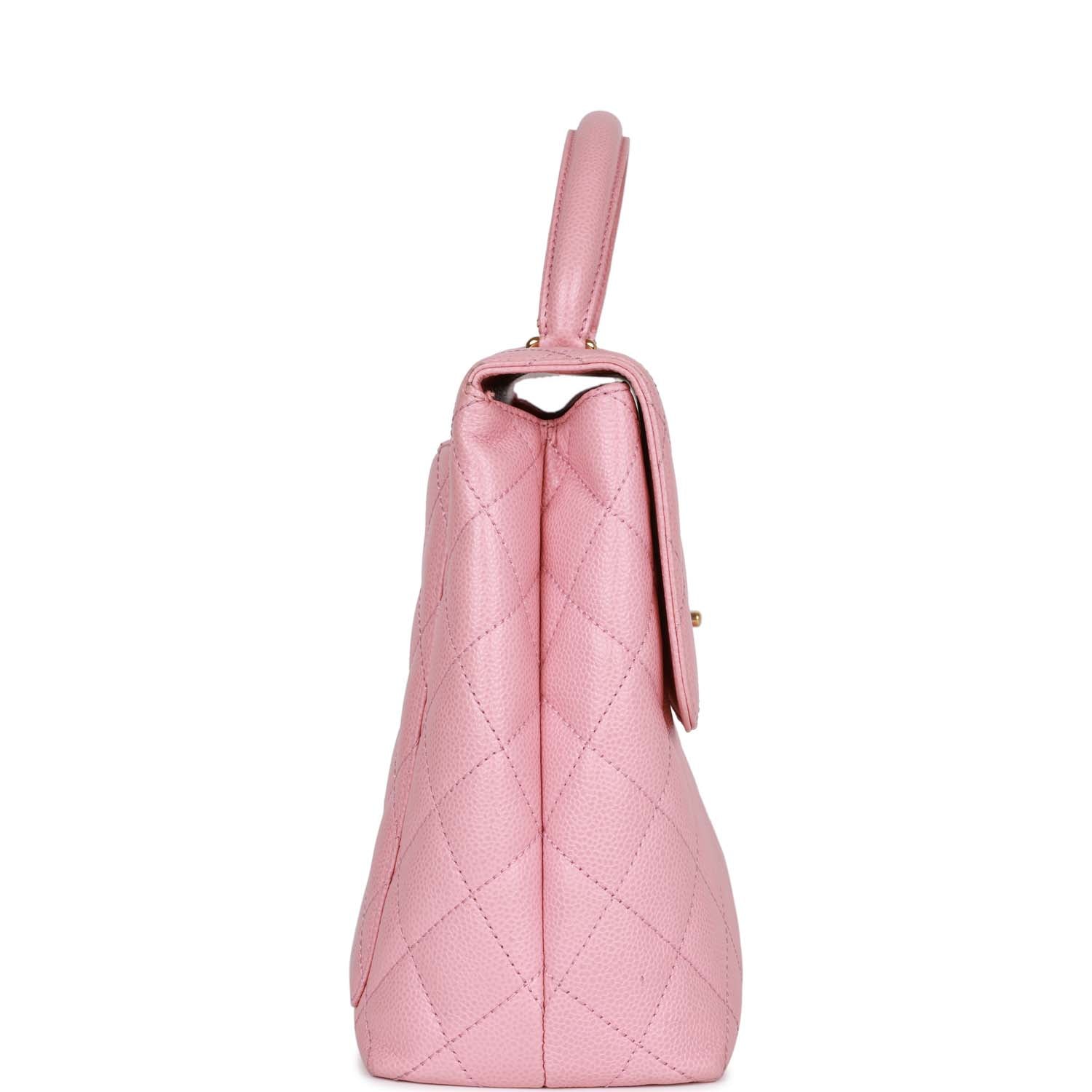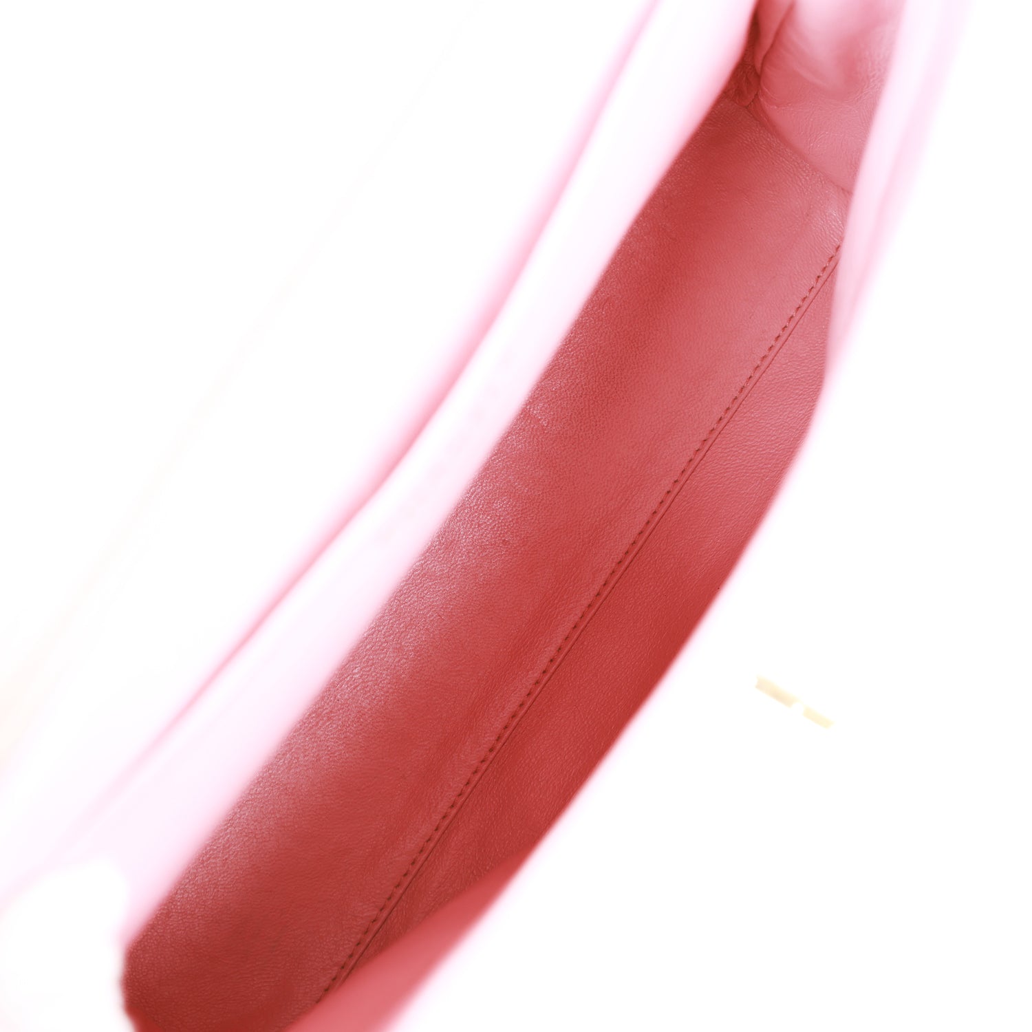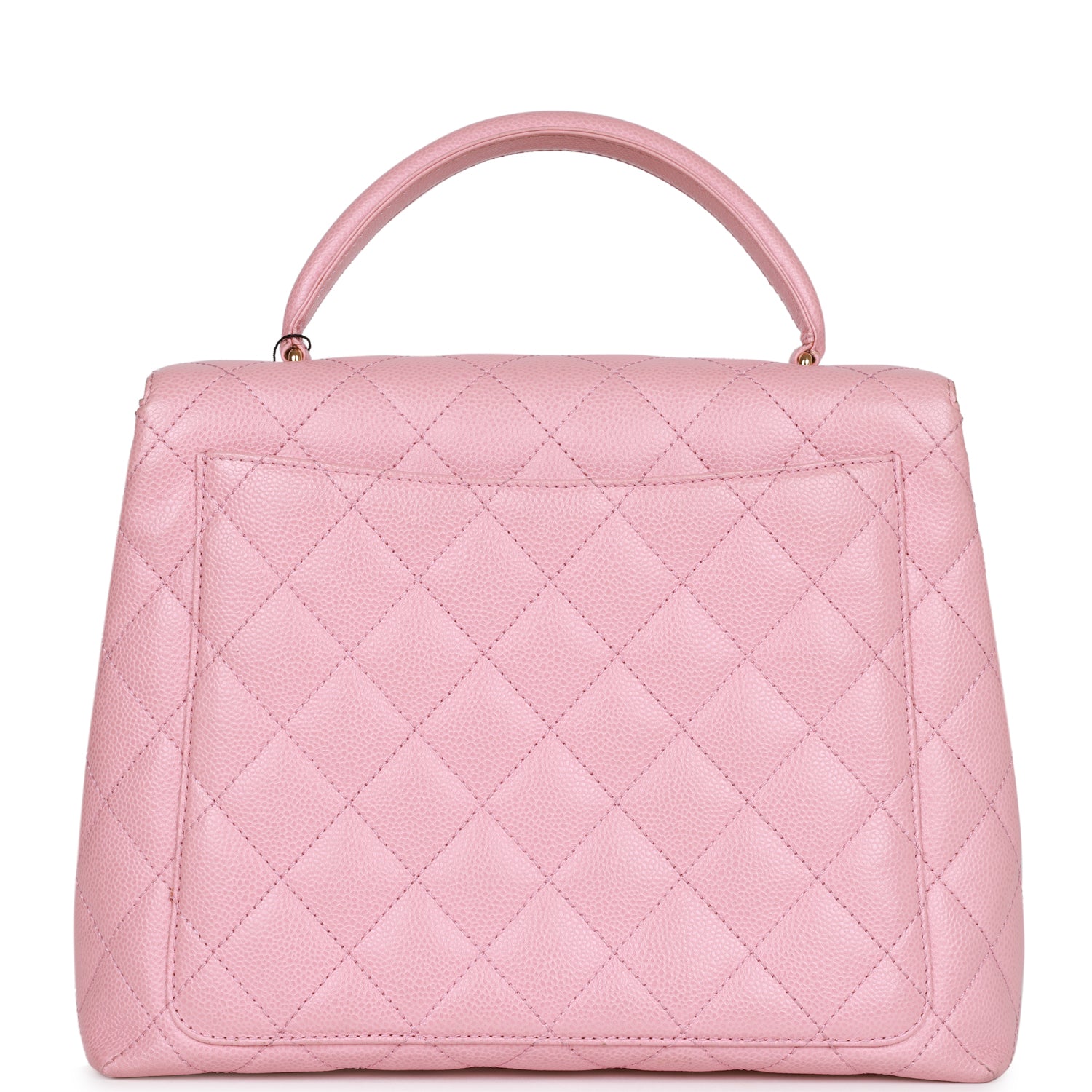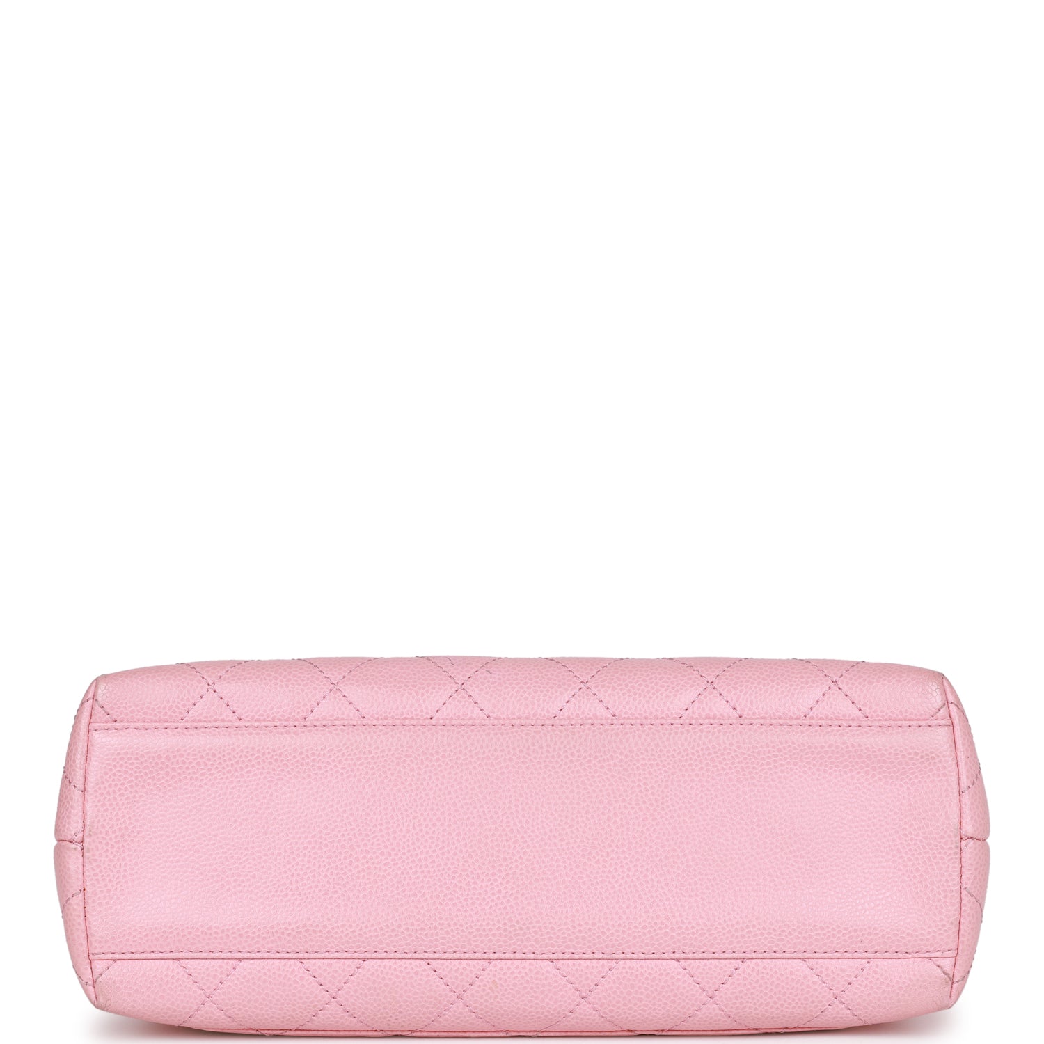 This Vintage Kelly Flap Bag is in Pink caviar leather with gold hardware, featuring the signature CC turnlock closures with front flap, half moon back pocket and a pink rolled top handle.