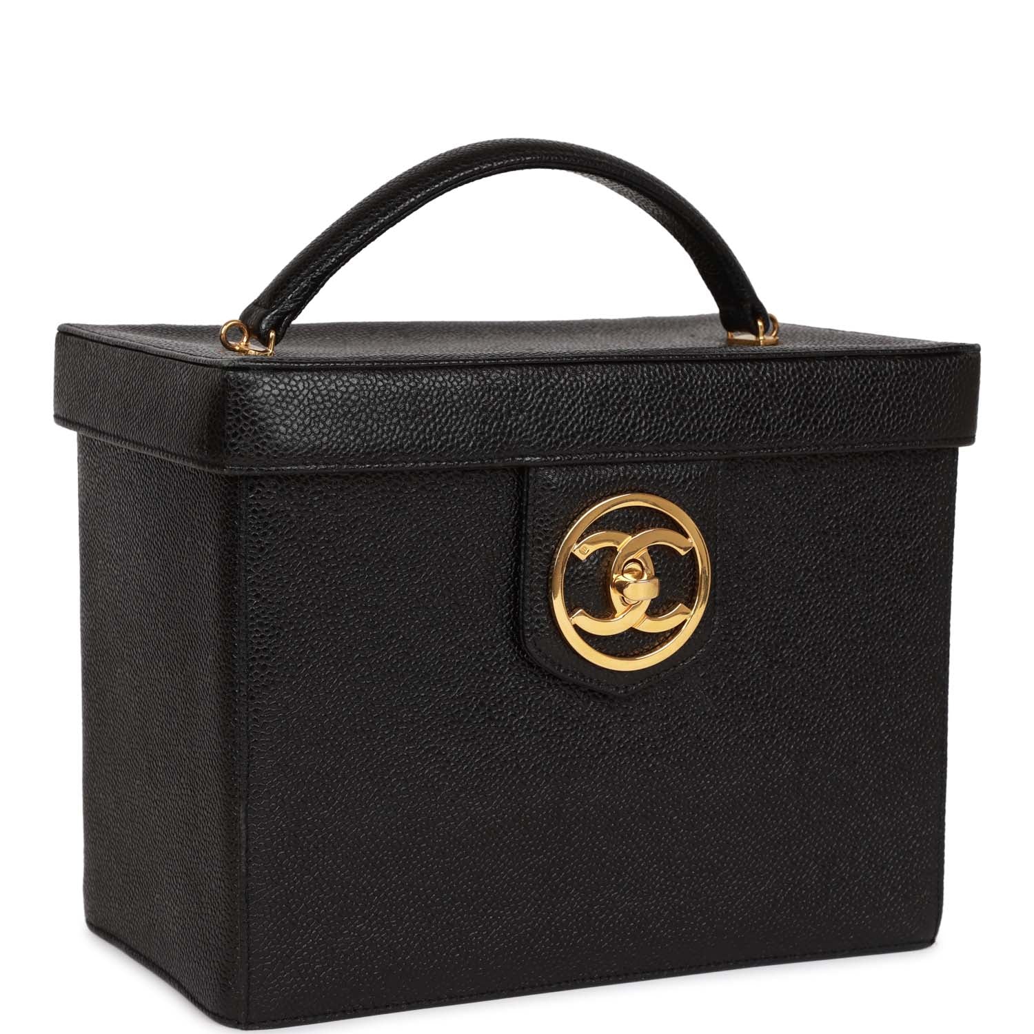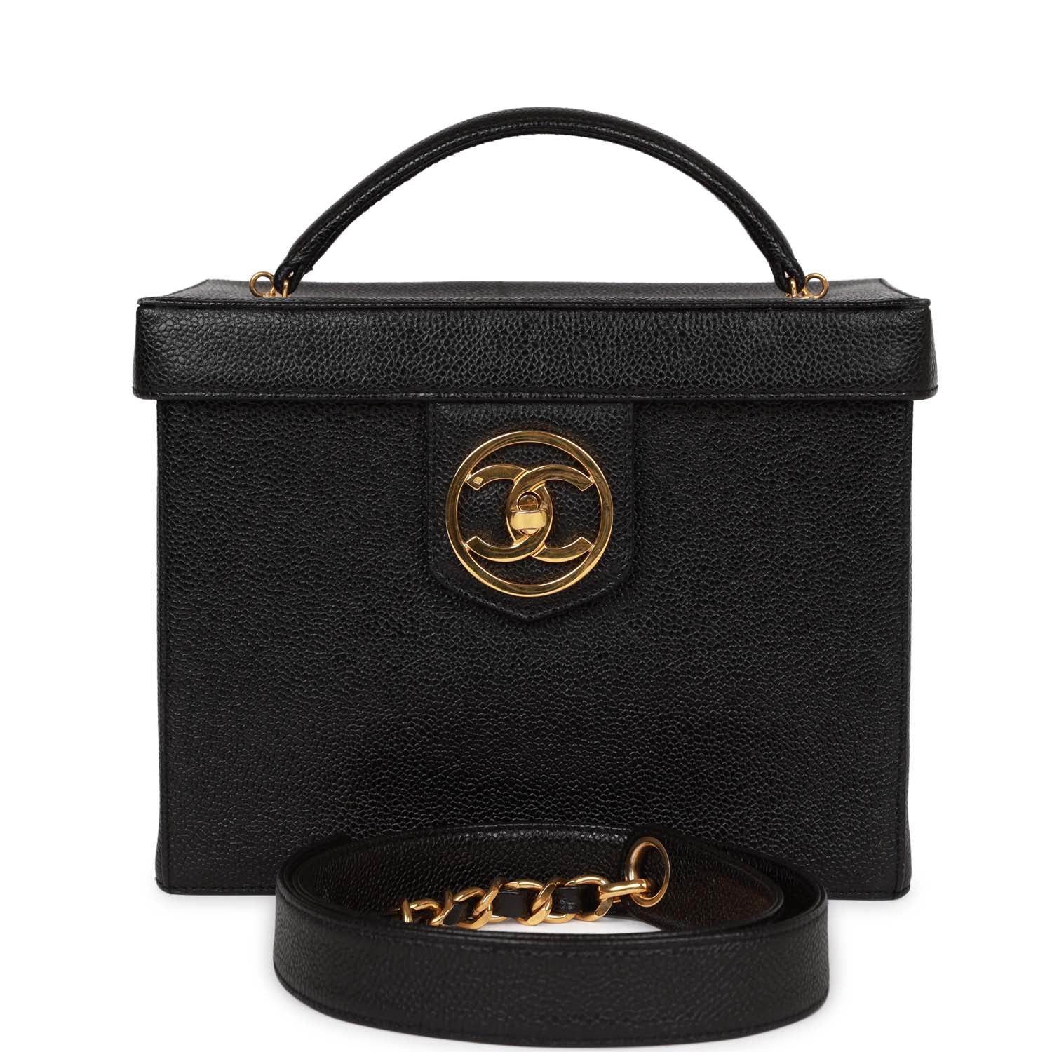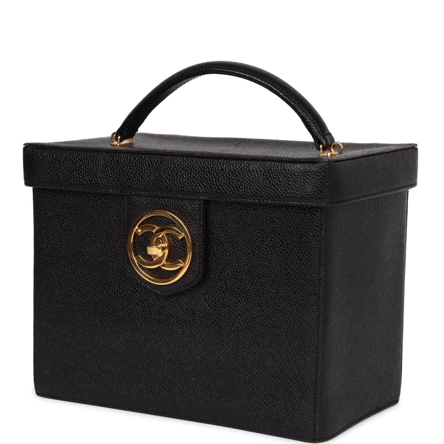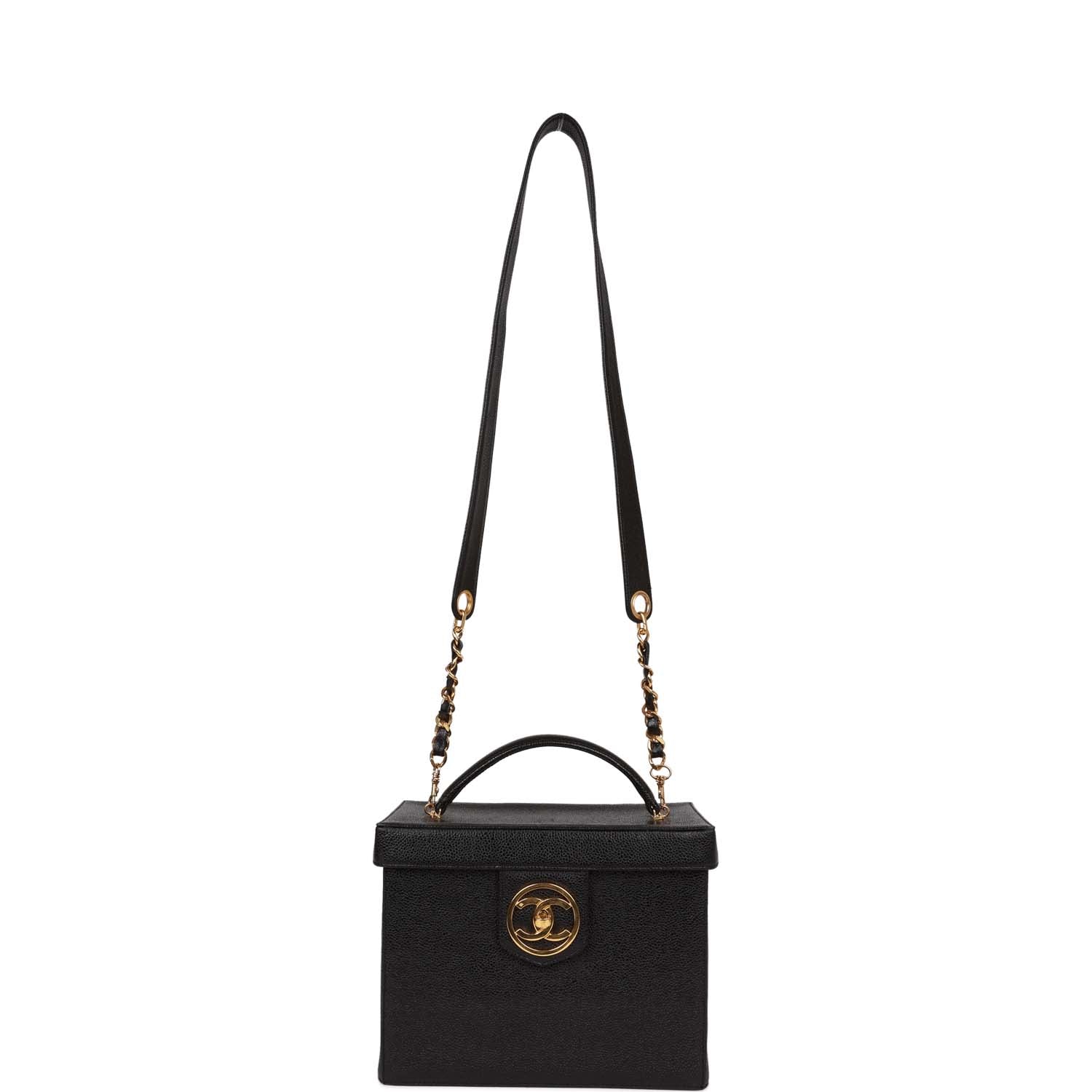 This Vintage Large Vanity Bag is in Black quilted caviar leather with gold hardware, a signature CC turnlock closure with a top lid, and a removable black leather and chain strap.
