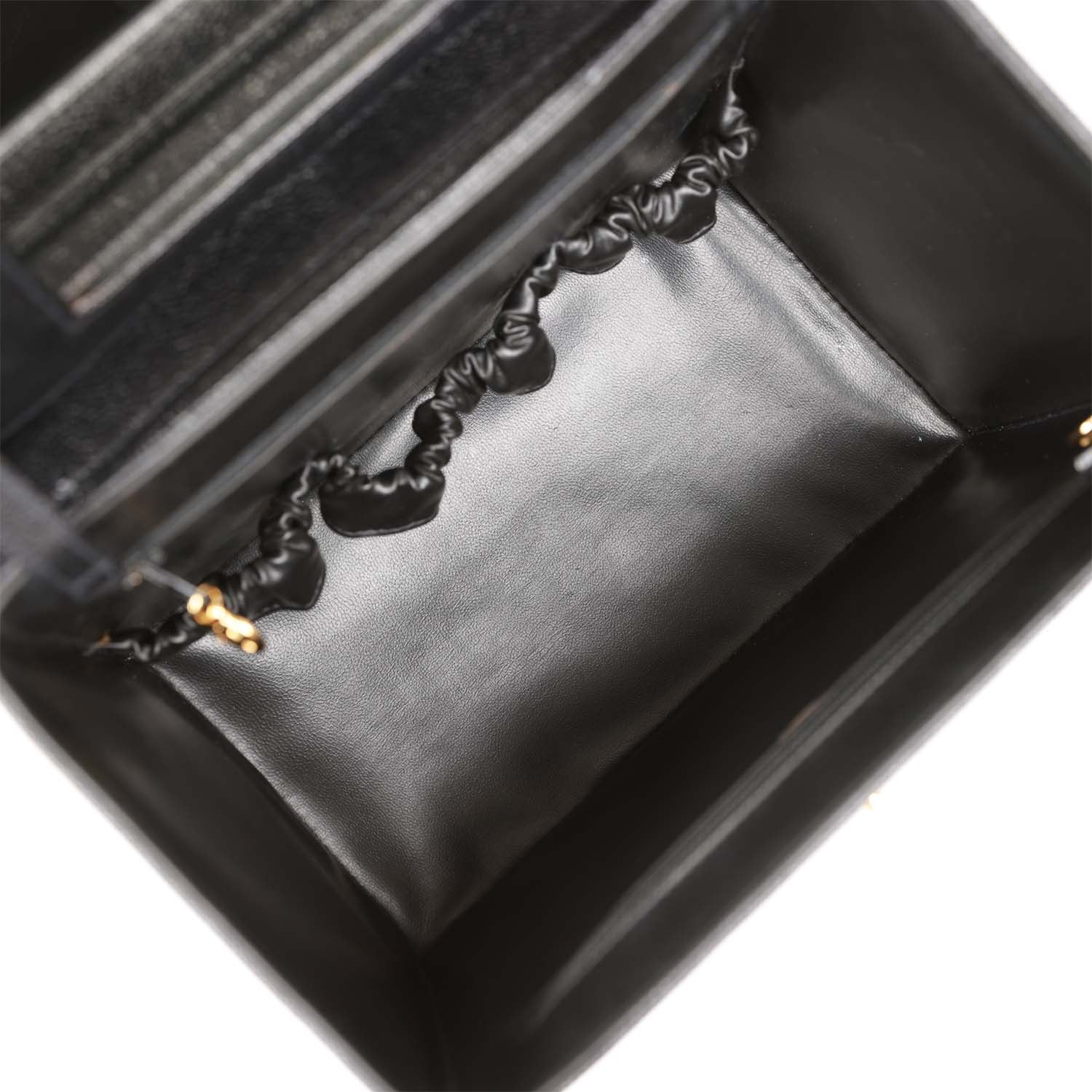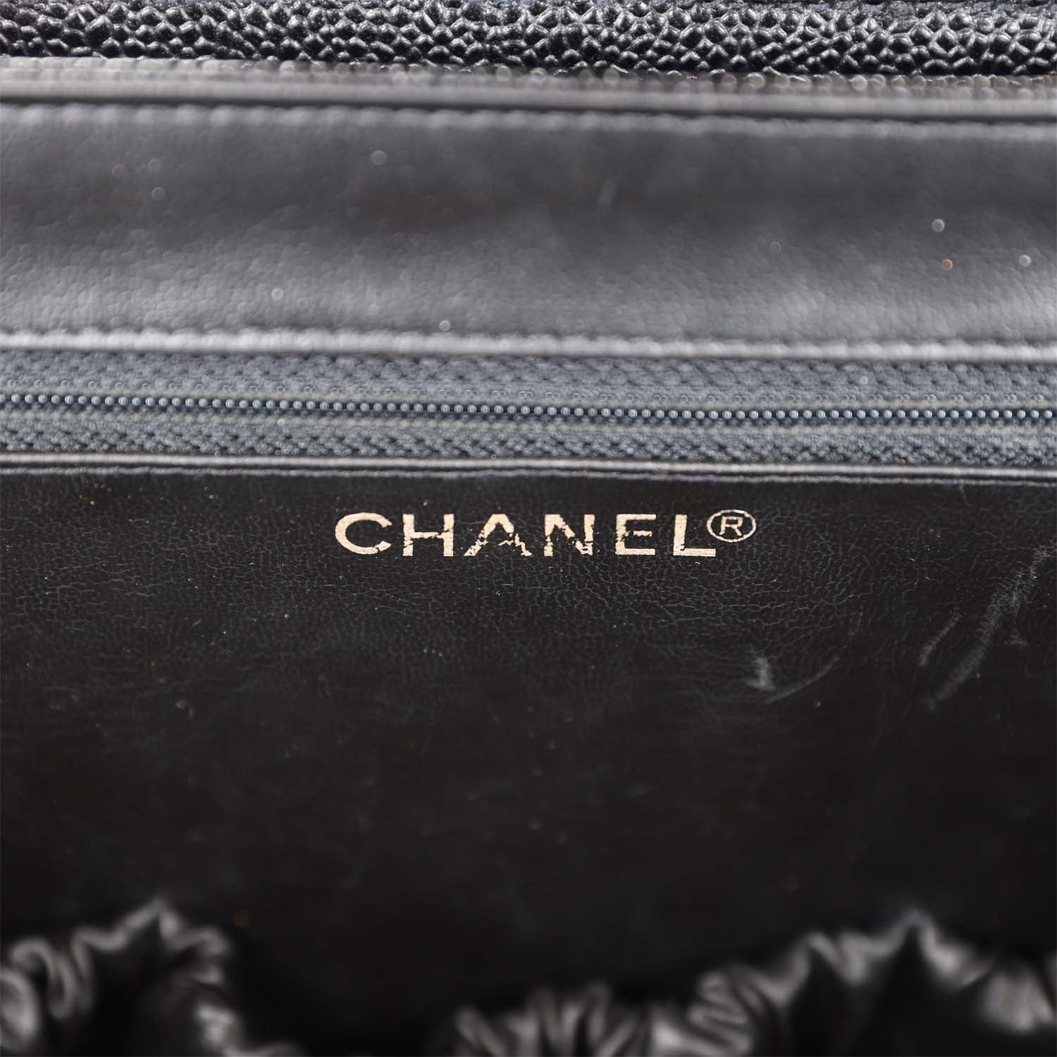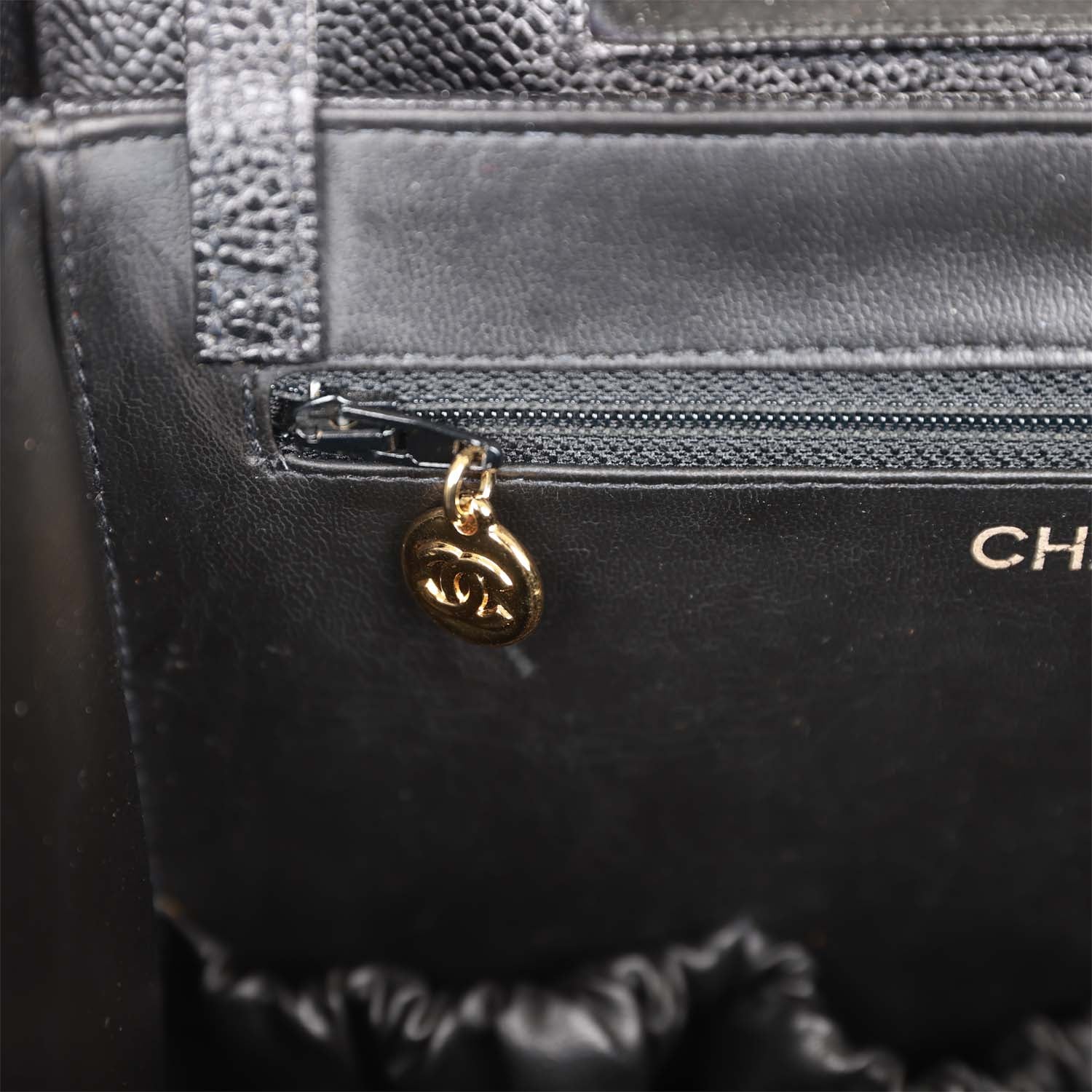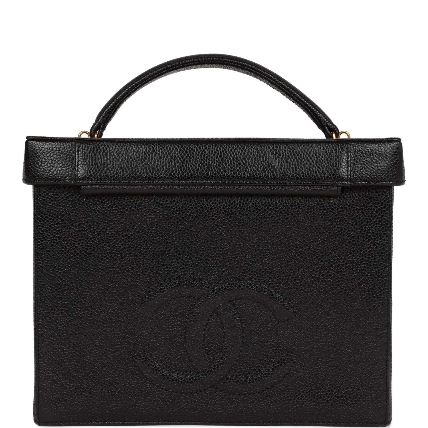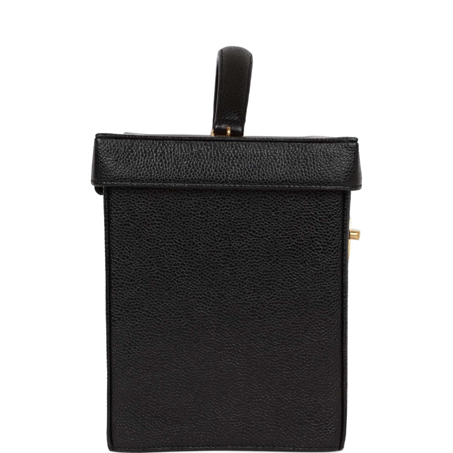This Vintage Large Vanity Bag is in Black quilted caviar leather with gold hardware, a signature CC turnlock closure with a top lid, and a removable black leather and chain strap.