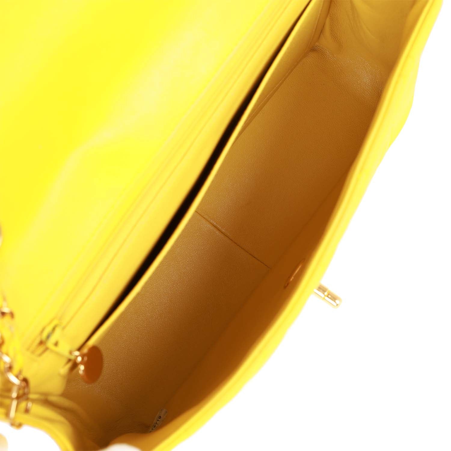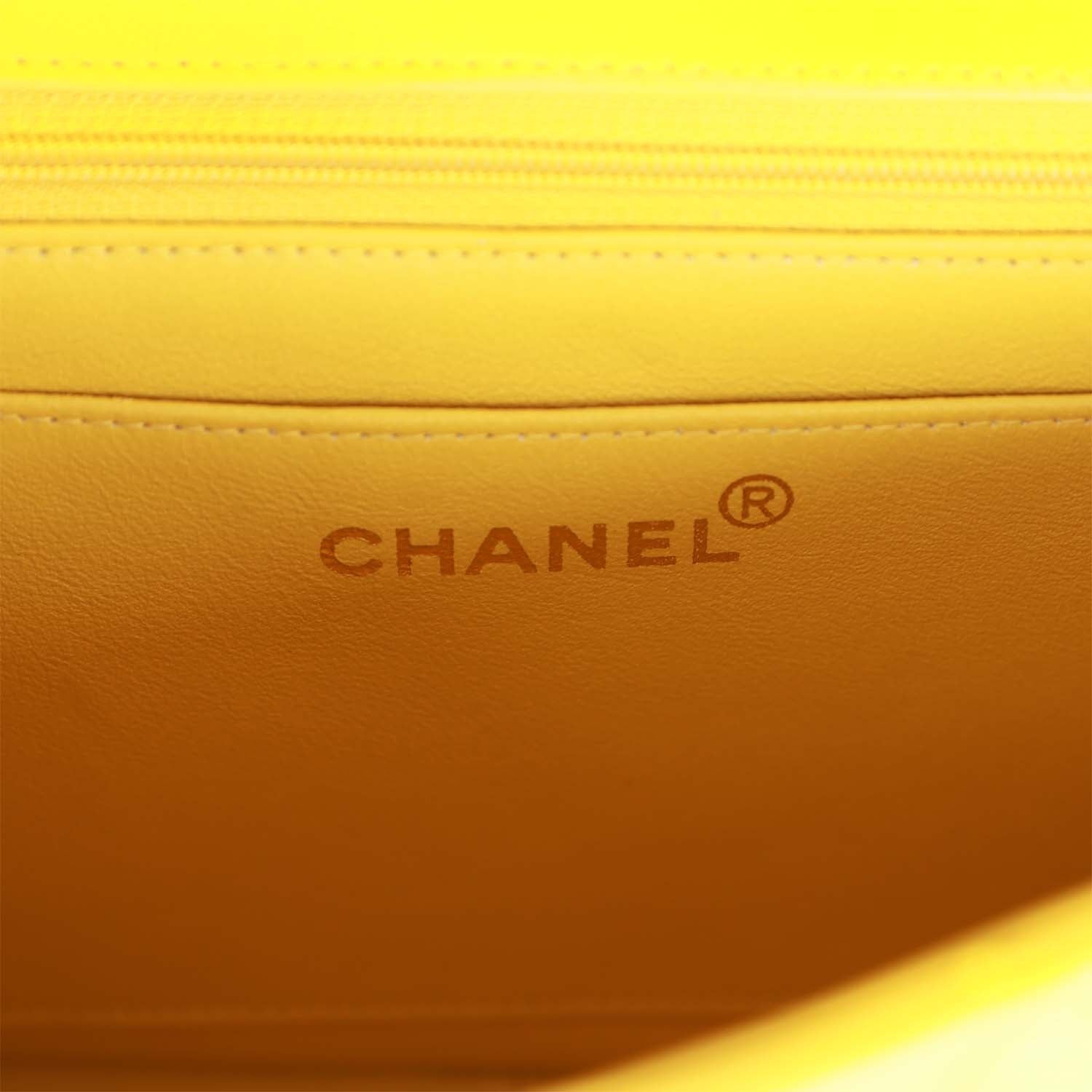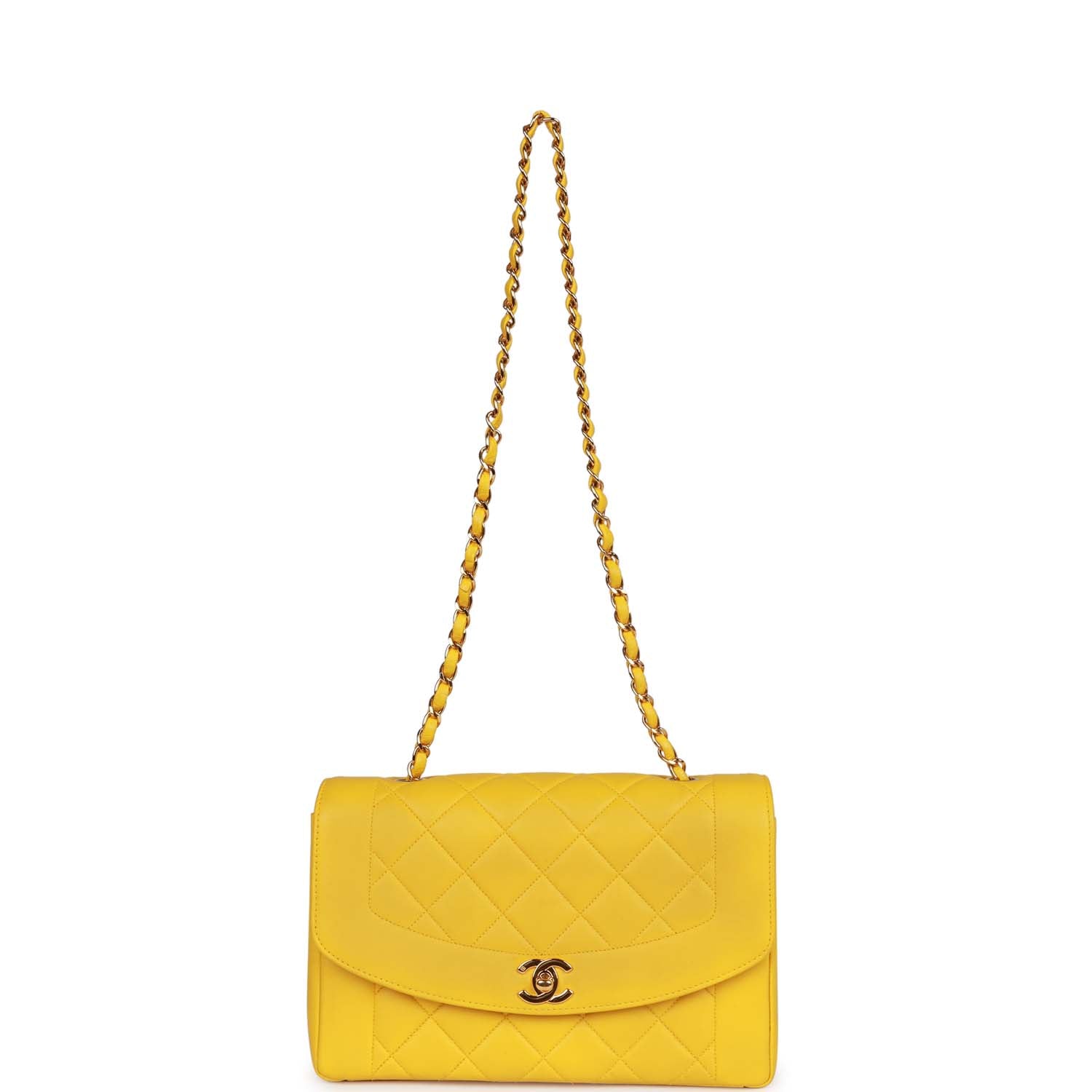 This Vintage Chanel Medium Diana flap bag is in yellow lambskin leather with gold hardware featuring a front flap with classic gold plated CC turnlock closure and an interwoven gold chain link shoulder/crossbody strap.
