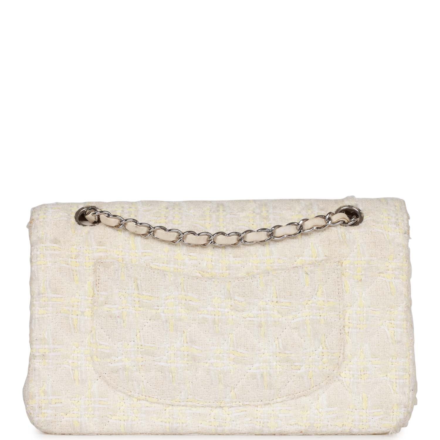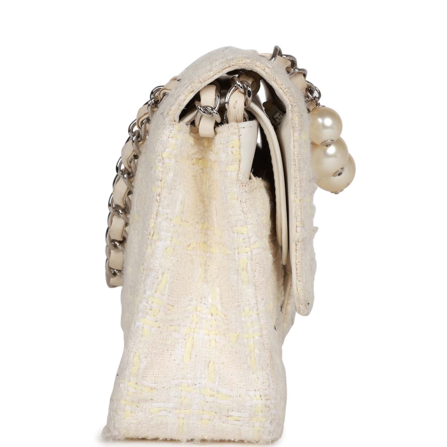 This Medium Flap bag is in White tweed boucle fabric with silver hardware and features a front flap with signature CC turnlock closure and an adjustable interwoven silver tone chain link and white leather shoulder strap with dangling faux pearls.