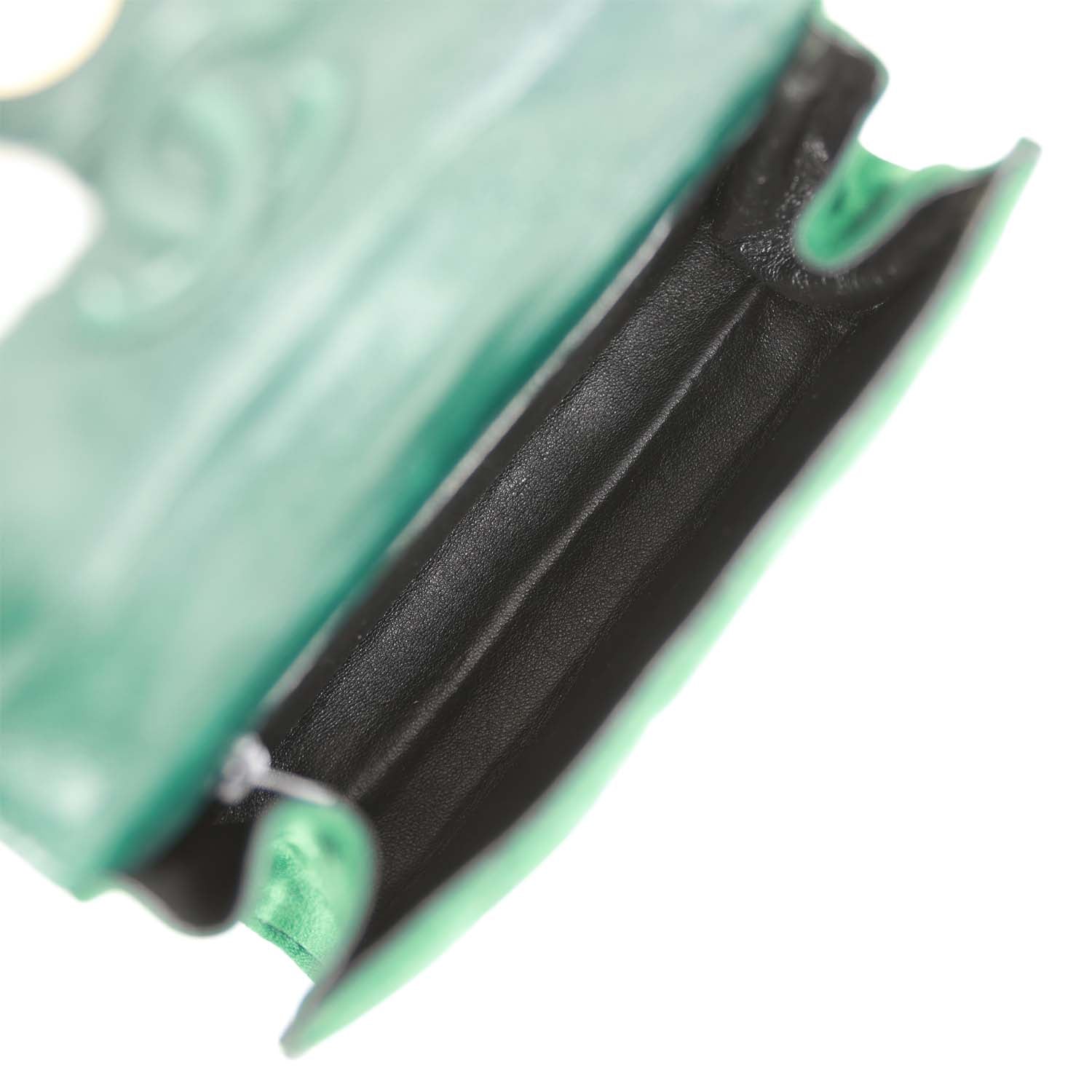 This Vintage Mini Camellia Flap Bag in Green quilted satin with gold hardware, featuring a front flap with snap closure, Chanel Flower decal, and a gold chain link shoulder/crossbody strap.