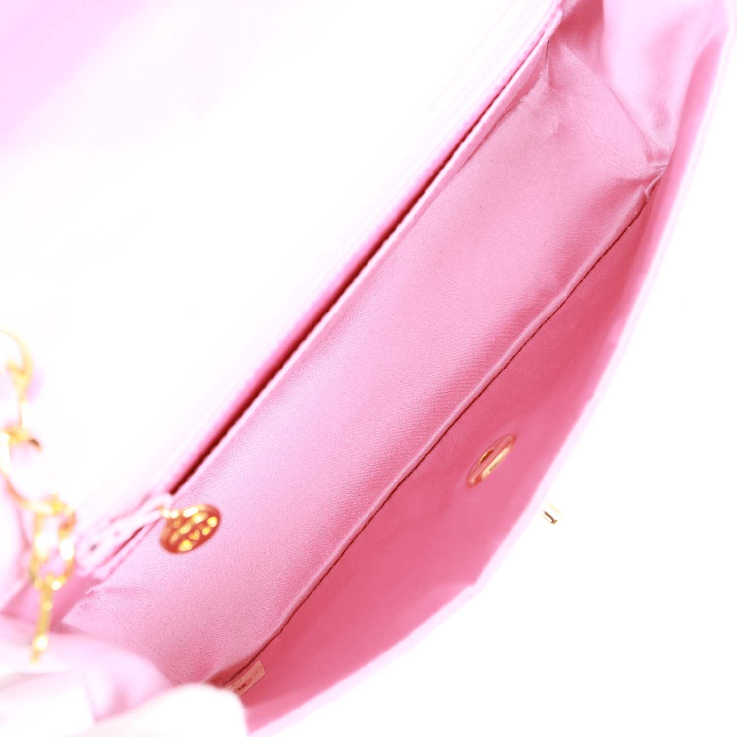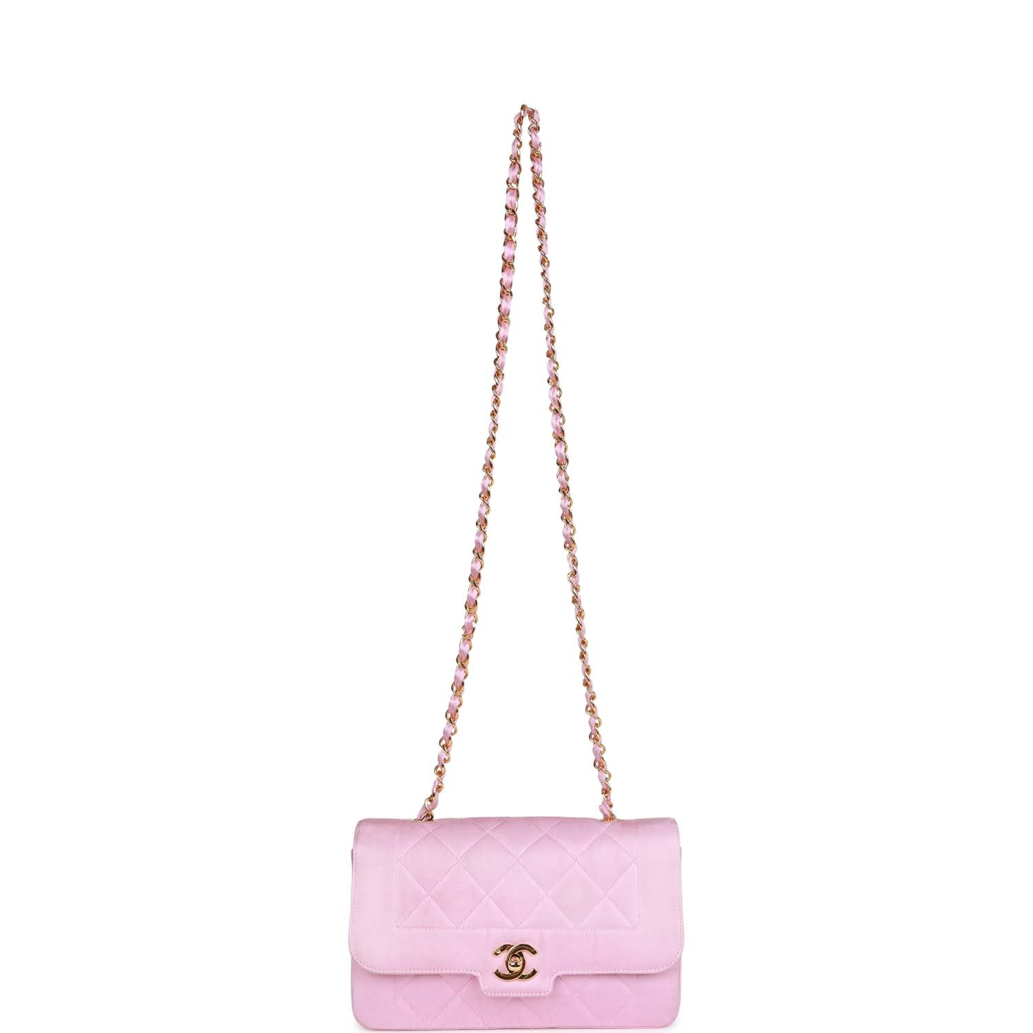 This Vintage Small Flap bag is in Pink satin fabric with gold tone hardware and features a front flap with signature CC turnlock closure, and an interwoven gold tone chain link and pink leather shoulder strap.