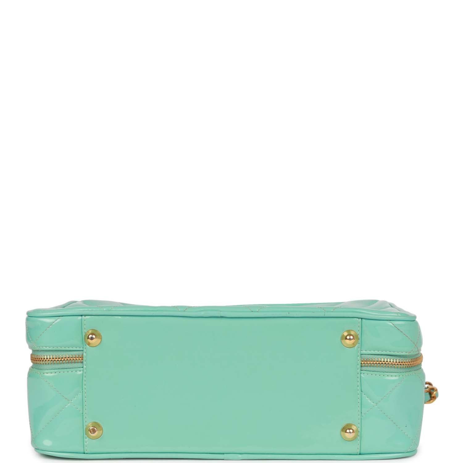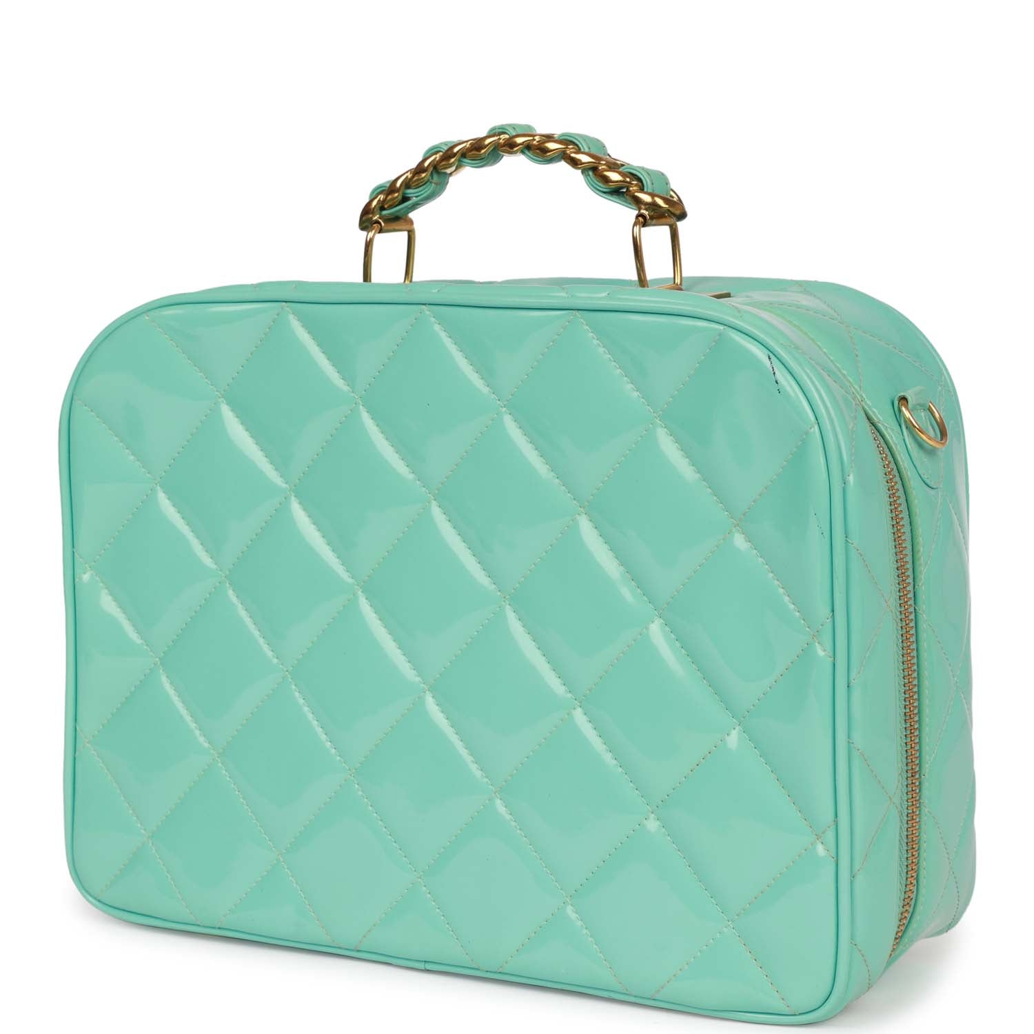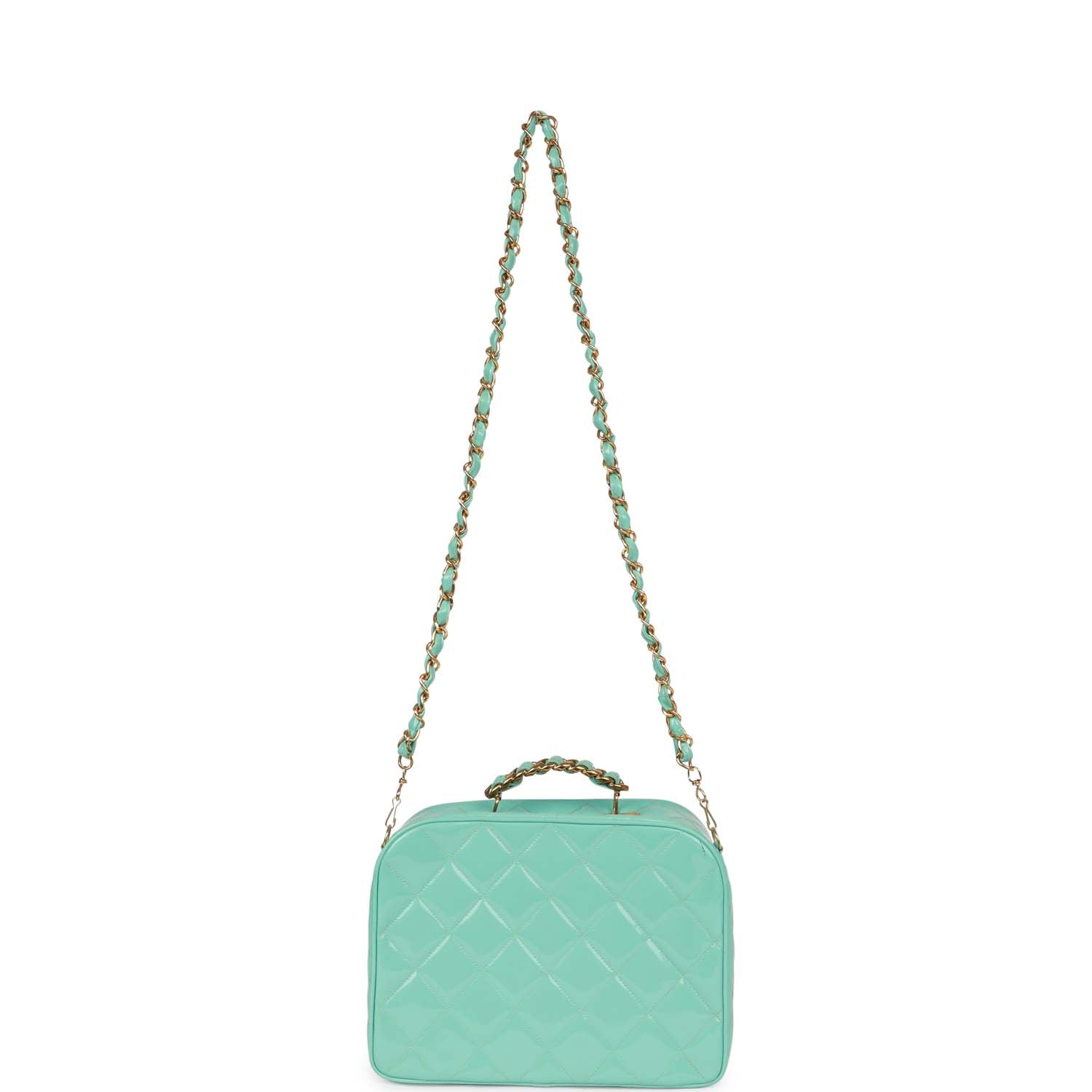This Vintage Vanity Case Bag is in Turquoise quilted patent leather with gold hardware, a zip around closure, an interwoven leather and gold plated chain link top handle, and a detachable interwoven leather and gold plated chain link shoulder strap.