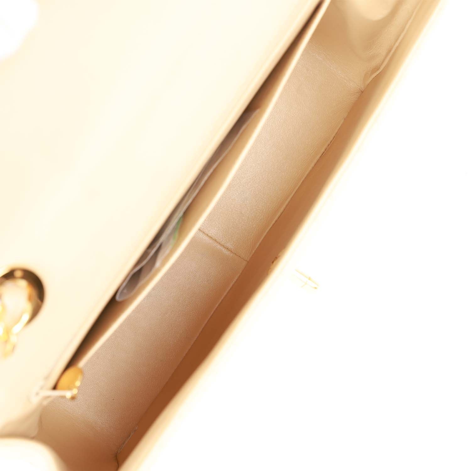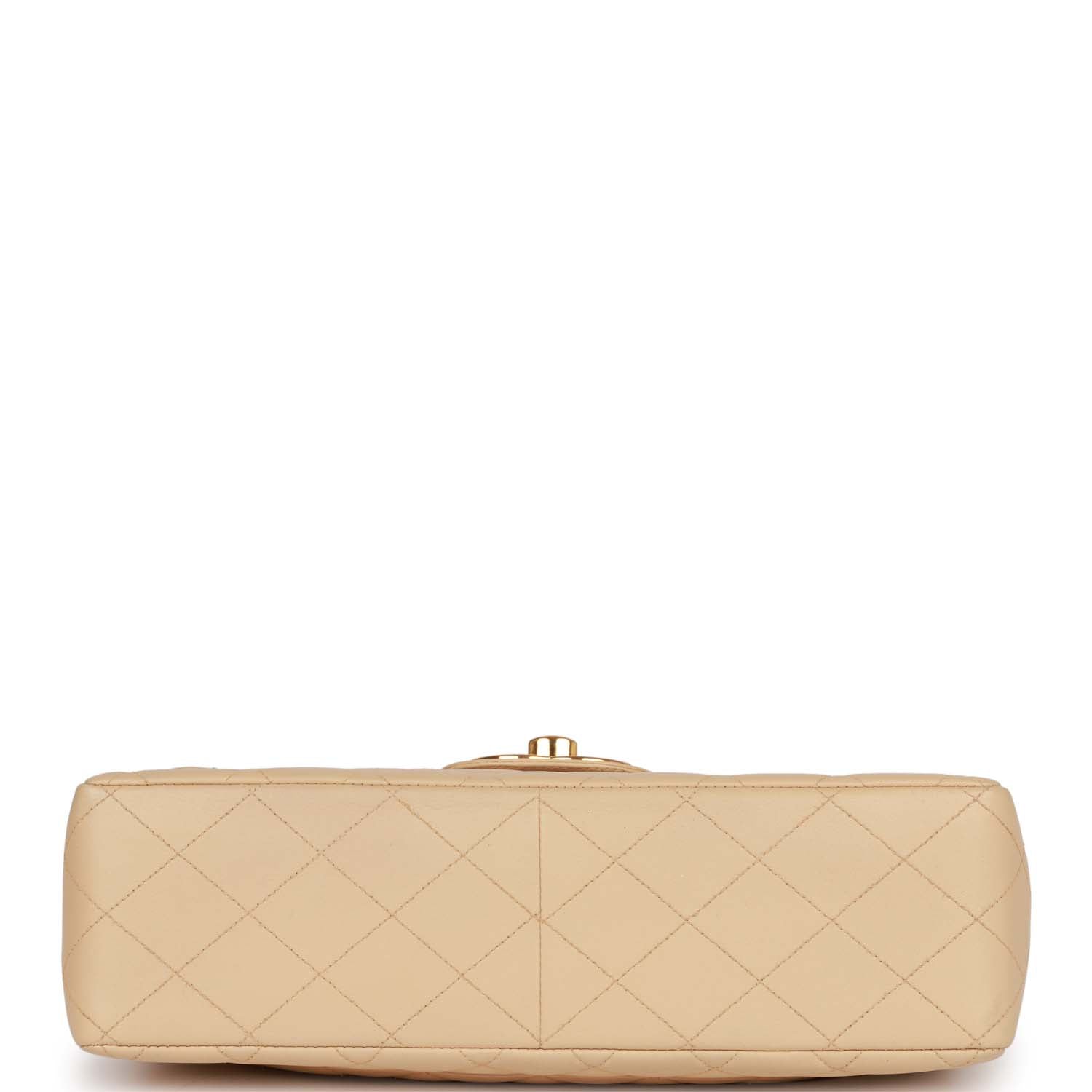 This Vintage XL Jumbo Flap is in beige lambskin leather bag with gold hardware and features a signature CC turnlock closure, half moon back pocket and interwoven beige and gold shoulder/crossbody strap.