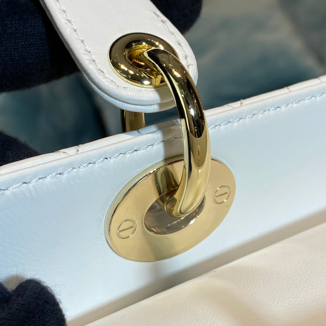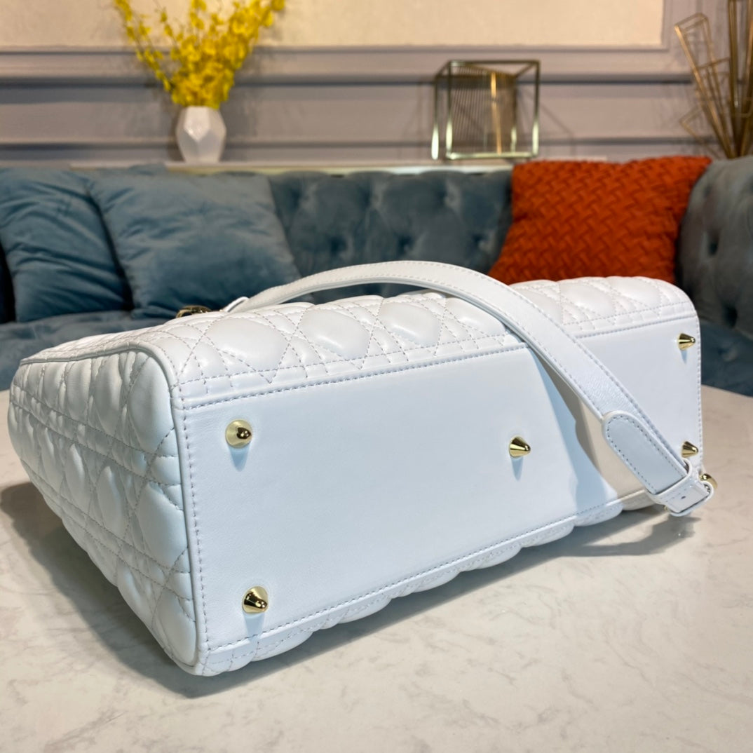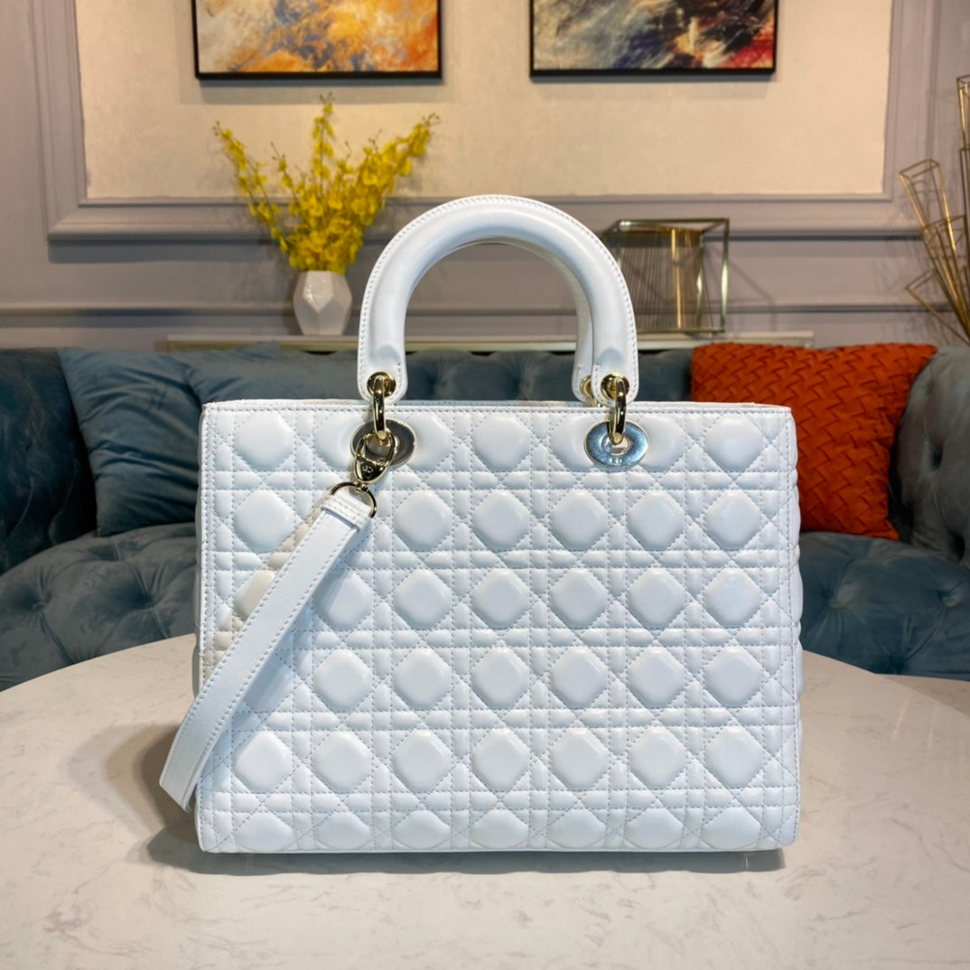 The Lady Dior handbag epitomizes the House's vision of elegance and beauty. Sleek and refined, the timeless yet relevant style is crafted in white ultramatte calfskin with Cannage stitching, creating the instantly recognizable quilted texture. The tonal metal 'D.I.O.R.' charms offer an elegant allure. Featuring a thin, removable leather shoulder strap, the large Lady Dior bag can be carried by hand, worn over the shoulder or crossbody.
