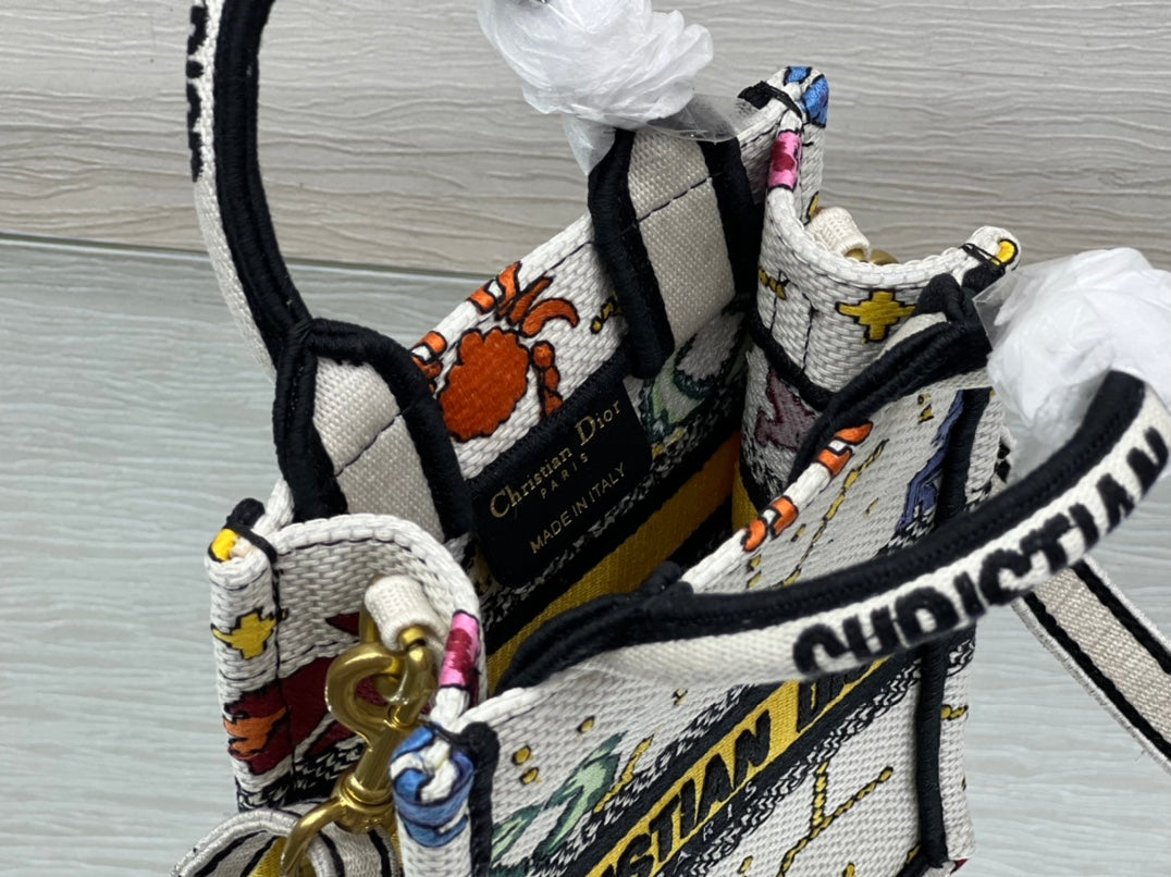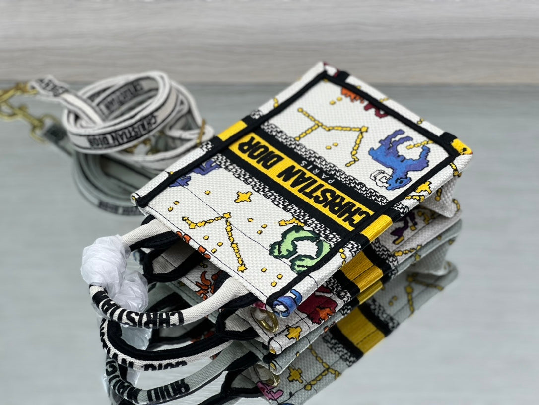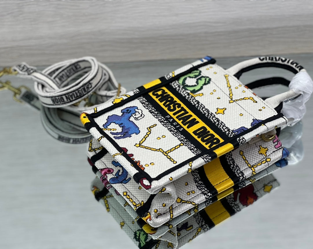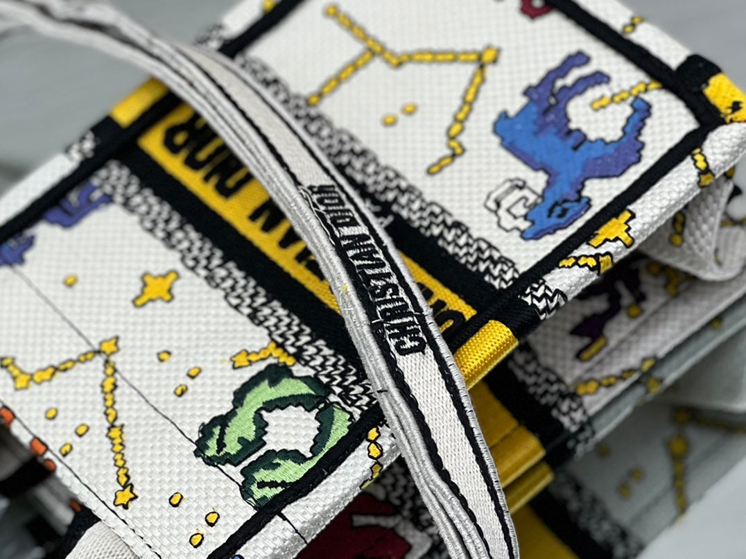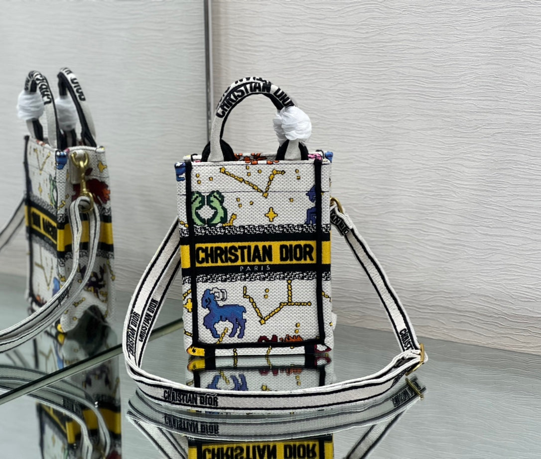 ?ÿMaria Grazia Chiuri's phone bag enriches the iconic Dior Book Tote line with an ideal example of the House's savoir-faire. The yellow style is entirely embroidered with the multicolor Dior Pixel Zodiac motif, offering a new take on astrological signs in a whimsical and colorful universe. Enhanced by the 'CHRISTIAN DIOR PARIS' signature on the front, the miniature bag will accommodate a phone as well as the small daily essentials. Completed by an adjustable and removable embroidered shoulder strap, the modern accessory can be carried by hand, worn over the shoulder or crossbody.