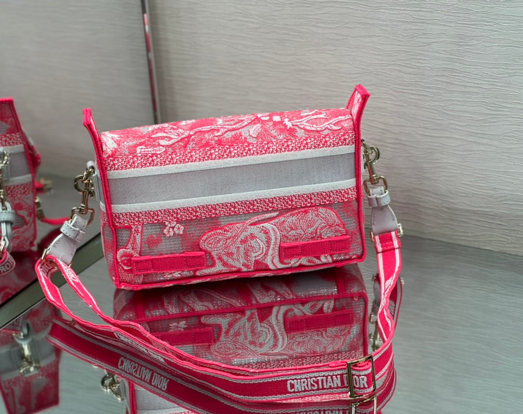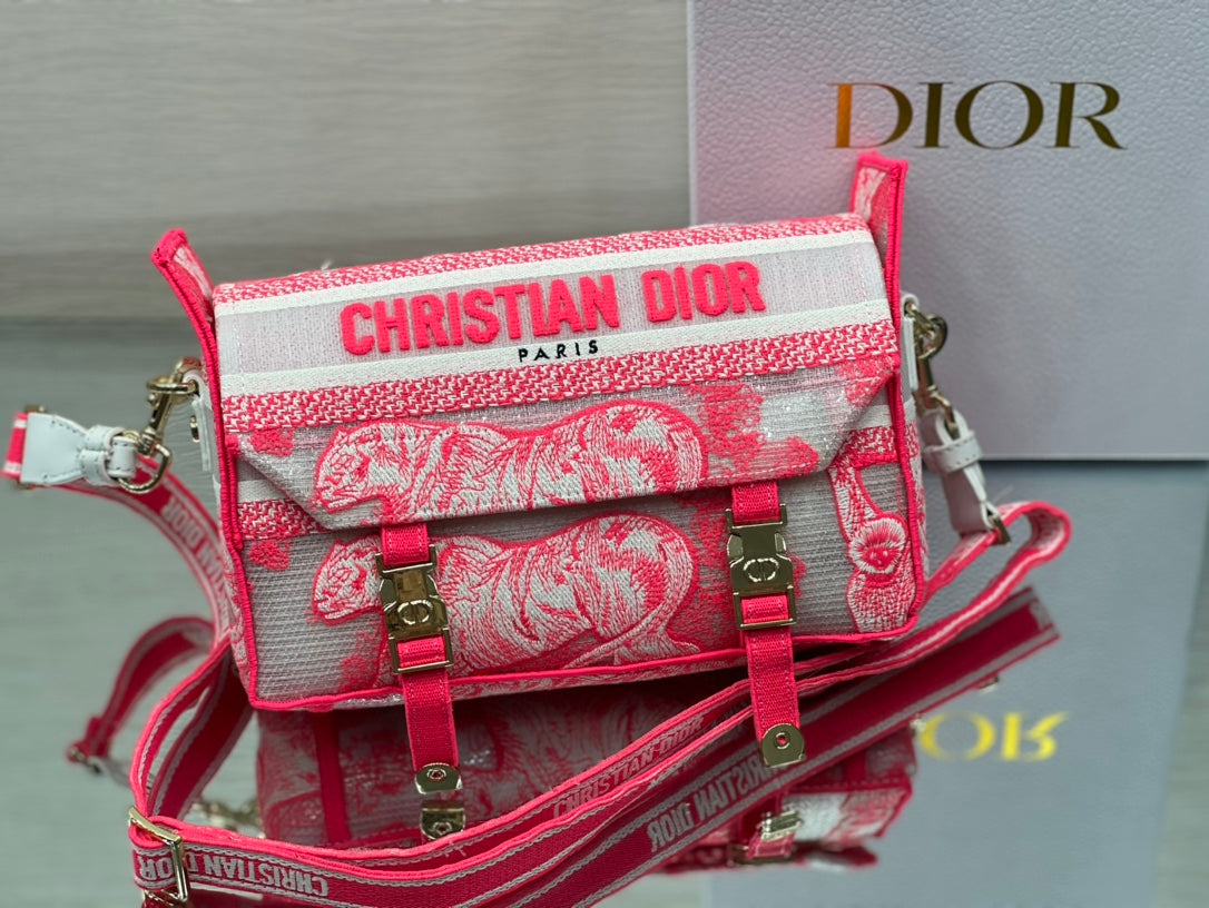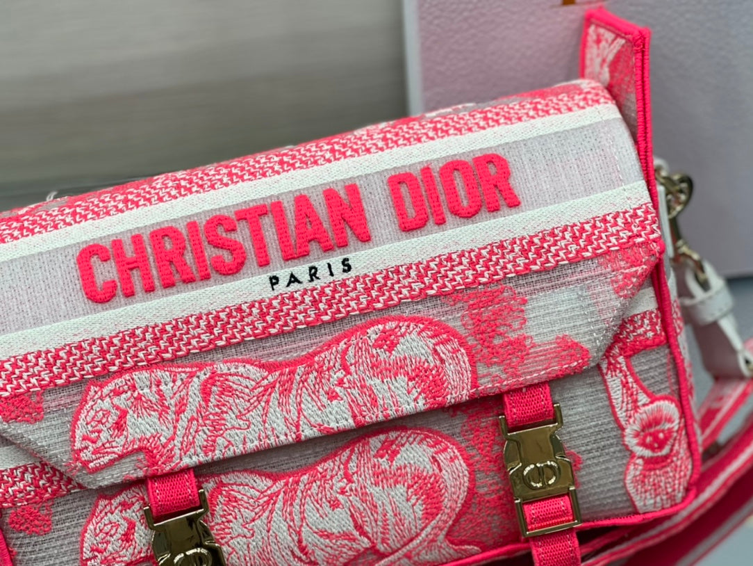 Maria Grazia Chiuri has updated the classic messenger bag by adding signature Dior details for a relaxed and modern look. Part of the Dioriviera capsule collection, the small bag is crafted in transparent canvas with a fluorescent pink Toile de Jouy motif. A 'CHRISTIAN DIOR PARIS' signature flap, as well as sportswear-inspired 'CD' buckles complete the design. Equipped with an adjustable and removable shoulder strap, the compact messenger bag can be over the shoulder or crossbody.