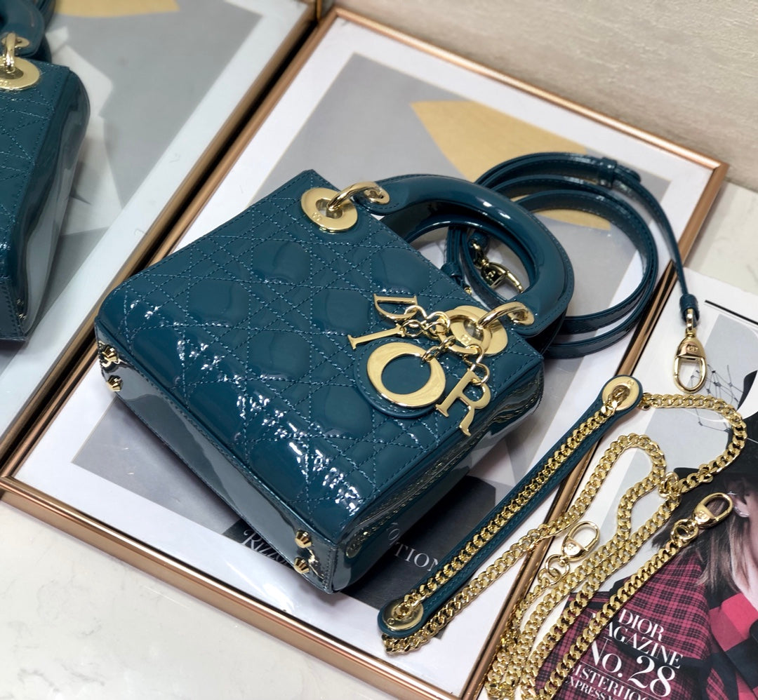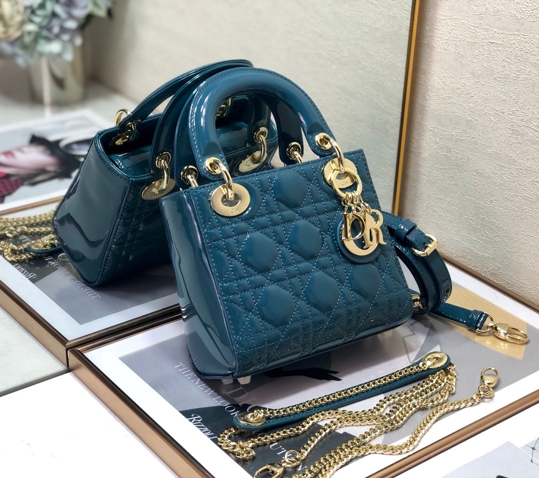 The Lady Dior My ABCDior bag epitomizes Dior's vision of elegance and beauty. Sleek and refined, the timeless and modern style is crafted in steel blue patent calfskin with Cannage stitching, creating the instantly recognizable quilted texture. Pale gold-finish metal 'D.I.O.R.' charms further embellish its silhouette with an elegant allure. The small style features a thin, removable leather shoulder strap and can be carried by hand, over the shoulder or crossbody.