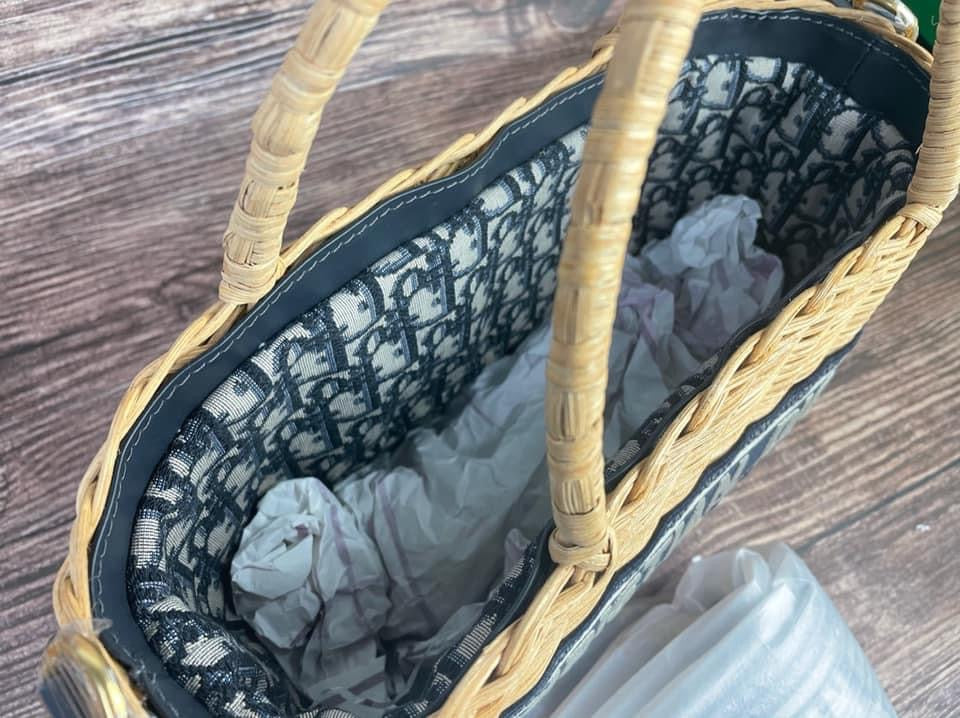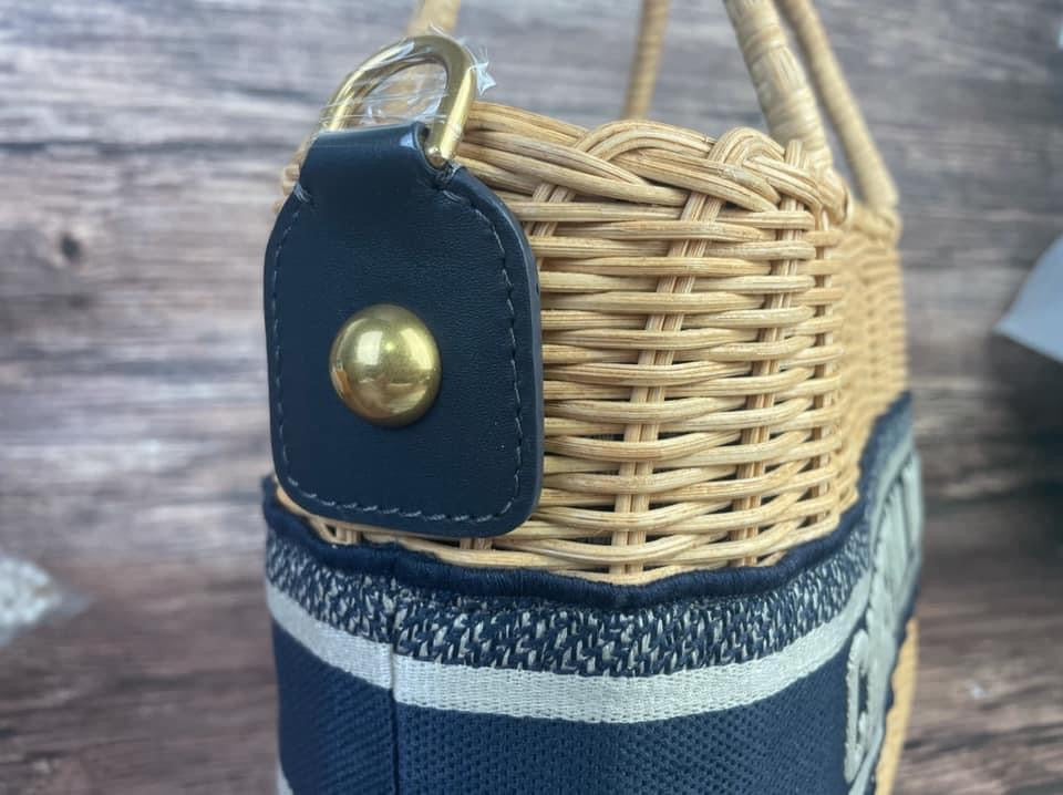 The Dior Wicker basket is a timeless creation traditionally crafted in natural hand-woven wicker and exemplifies Dior's savoir-faire. The design features a blue Dior Oblique jacquard interior pouch with zipped pocket and a drawstring closure. Inspired by the hallmark Dior Book Tote, it showcases a band embroidered with the 'CHRISTIAN DIOR' signature, while the wide embroidered shoulder strap allows it to be over the shoulder or crossbody.