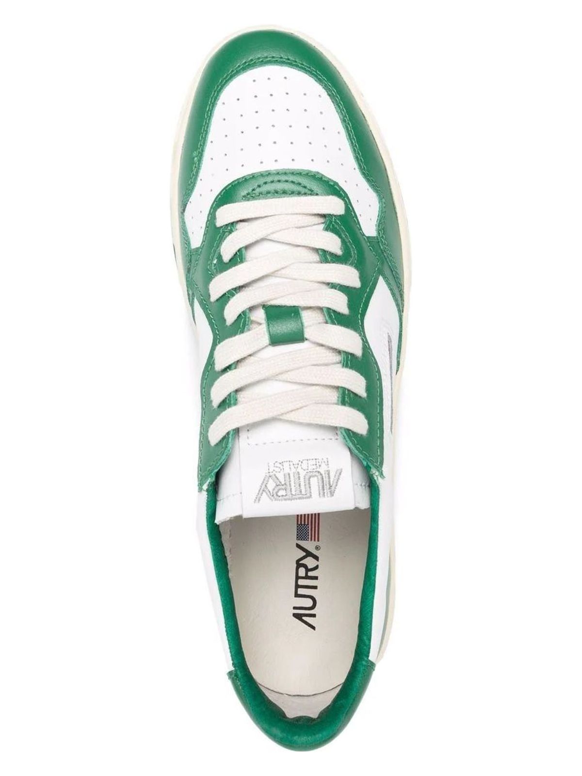 Step up your sneaker game with these low-top Medalist sneakers in green and white leather. With a rubber sole, lace-up closure, and perforated toe, these kicks are as stylish as they are comfortable. Plus, the Autry blue logo on the side, logo on the tongue, and embossed logo at the back add a cool, retro vibe to any outfit.