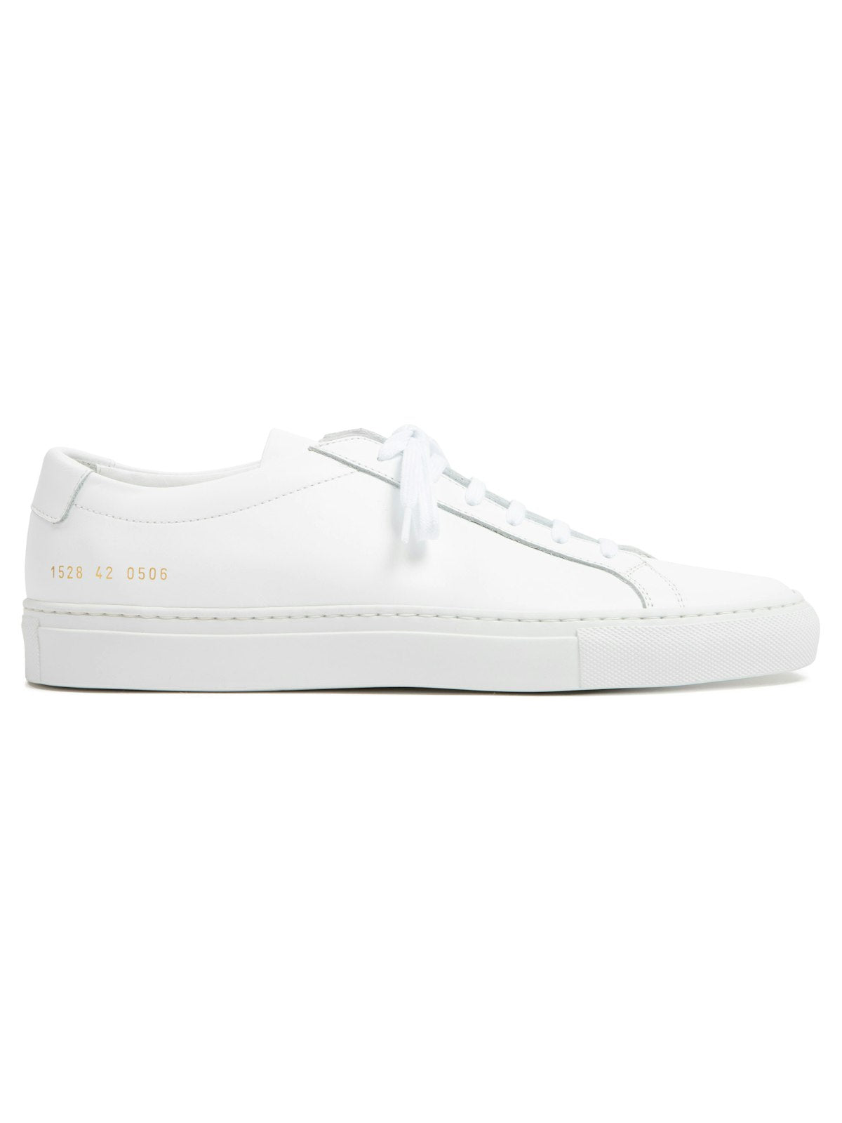 Step up your sneaker game with these classic lace-up sneakers from Common Projects. Made with high-quality white leather and a comfortable flat rubber sole, these sneakers are perfect for everyday wear. Plus, the unique serial number print at the heel adds a touch of individuality to your look.