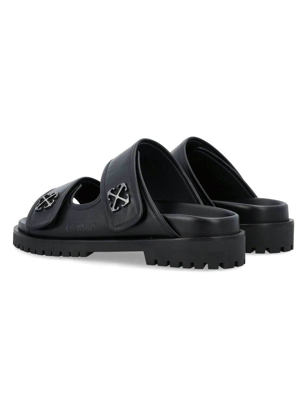 Step up your shoe game with the Leather Metal Arrow Sandal by Off-White. These sandals feature double velcro straps and a sleek silver-tone arrow detail, perfect for adding a touch of edge to any outfit. With a comfortable flat rubber sole and open toe design, these sandals are a must-have for both style and comfort.