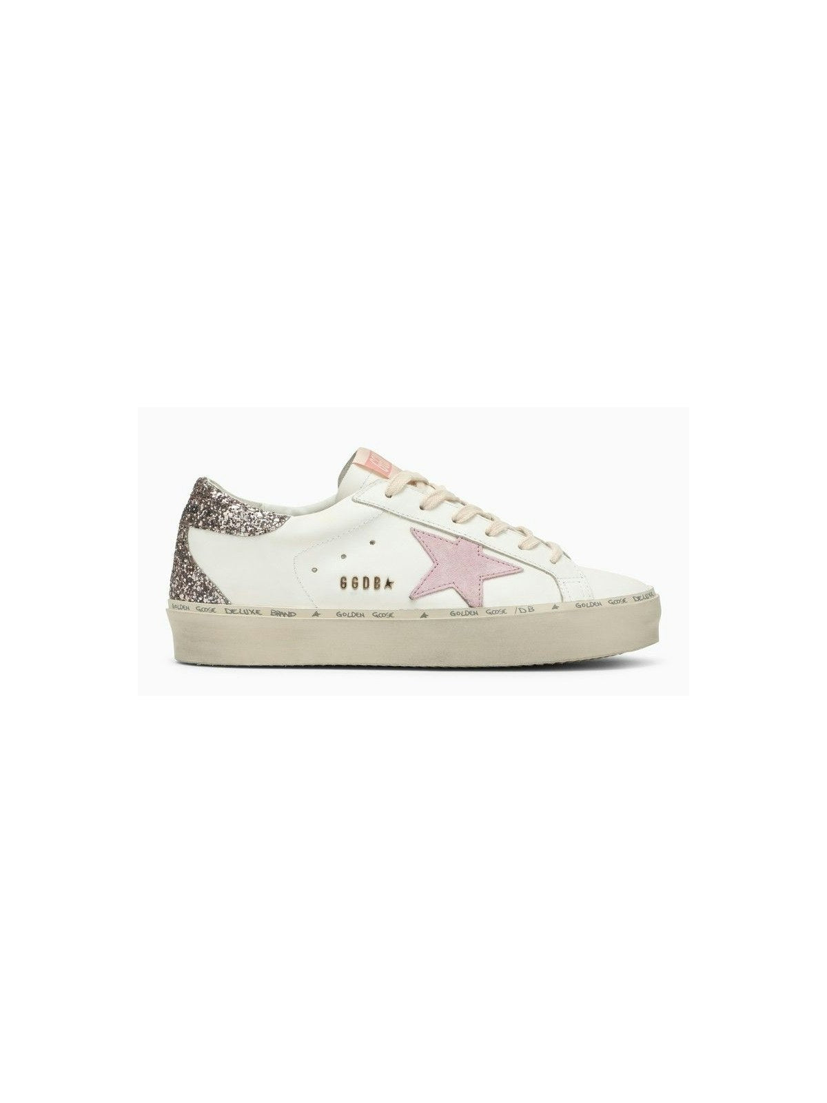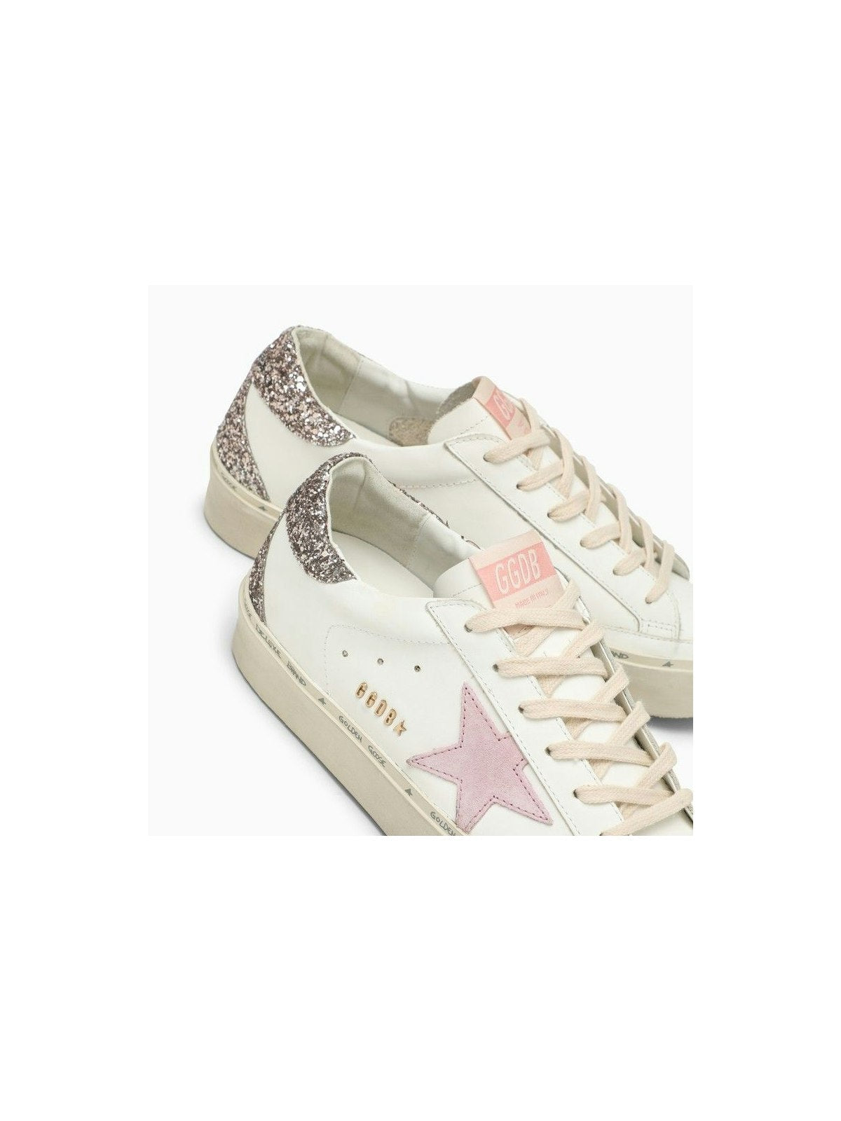 Step up your sneaker game with these deluxe low top sneakers. The pink star patch and silver glittered heel add a fun, vintage touch to these white leather kicks. With suede detailing, lace-up closure, and a flat rubber sole, these sneakers are both stylish and comfortable.