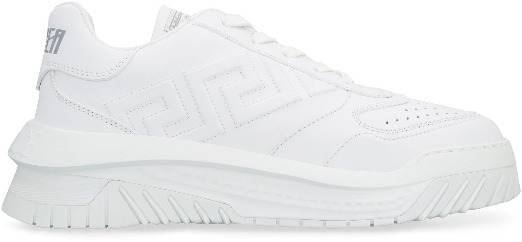 Elevate your sneaker game with these luxurious ODISSEA leather sneakers from Versace. Emblazoned with the iconic tone-on-tone embossed Greca motif, these sneakers are a true statement piece for those who appreciate the finer things in life. The fabric logo patch on the tongue, front lace-up closure, and perforations on the toe add subtle yet stylish details, while the lettering print on the heel tab and rear embossed logo showcase the brand's impeccable attention to detail.