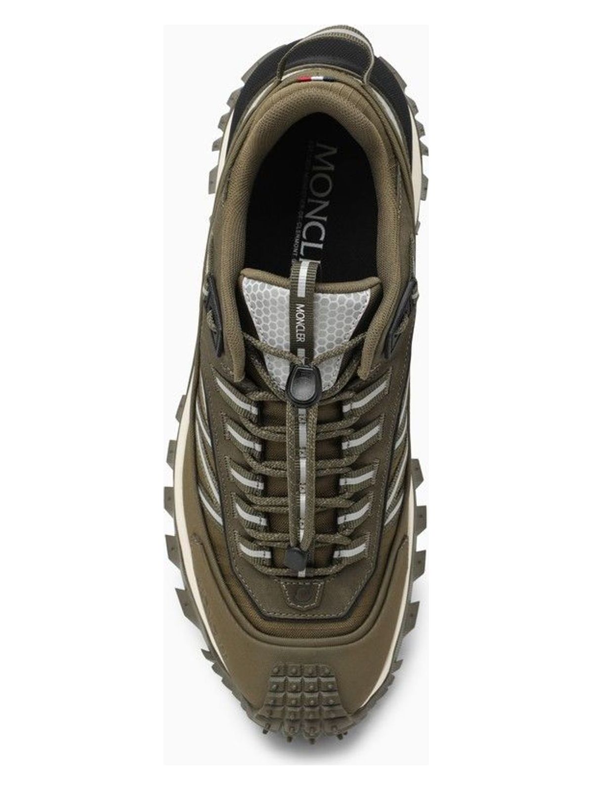 Step up your style game with these green fabric and leather low top trainers. These shoes feature a wide tone-on-tone rubber sole, drawstring front fastening, contrasting logo, and a padded tongue, making them both stylish and comfortable for everyday wear.