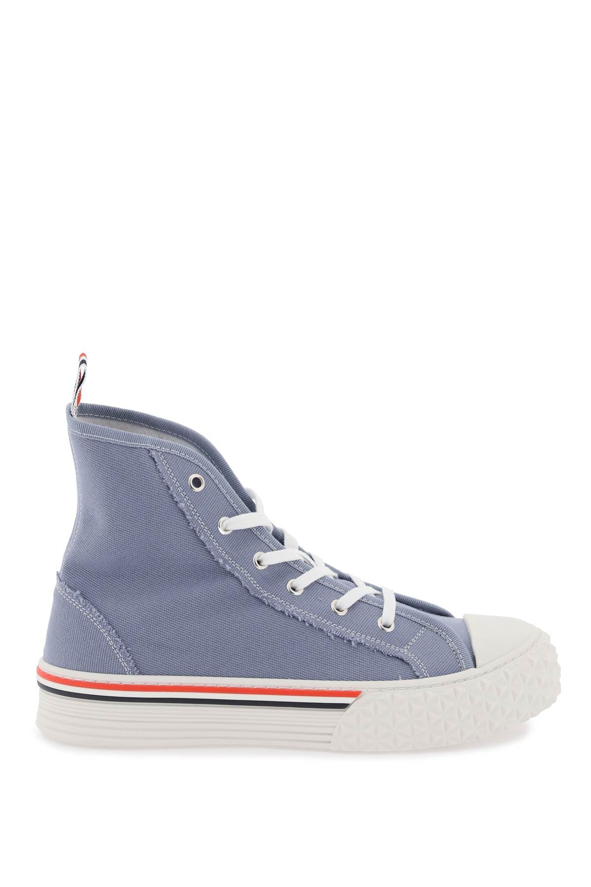 Elevate your street style with these THOM BROWNE TARTAN SOLE SNEAKERS. Crafted from premium cotton canvas, these sneakers feature a tricolor loop tab, textured rubber covered toe, and a sleek logo patch on the tongue. The unlined interior with a removable leather insole provides ultimate comfort, while the rubber sole with tartan motif adds a unique touch to these classic sneakers. Perfect for those who appreciate luxury designer fashion, these sneakers are a must-have addition to your collection.