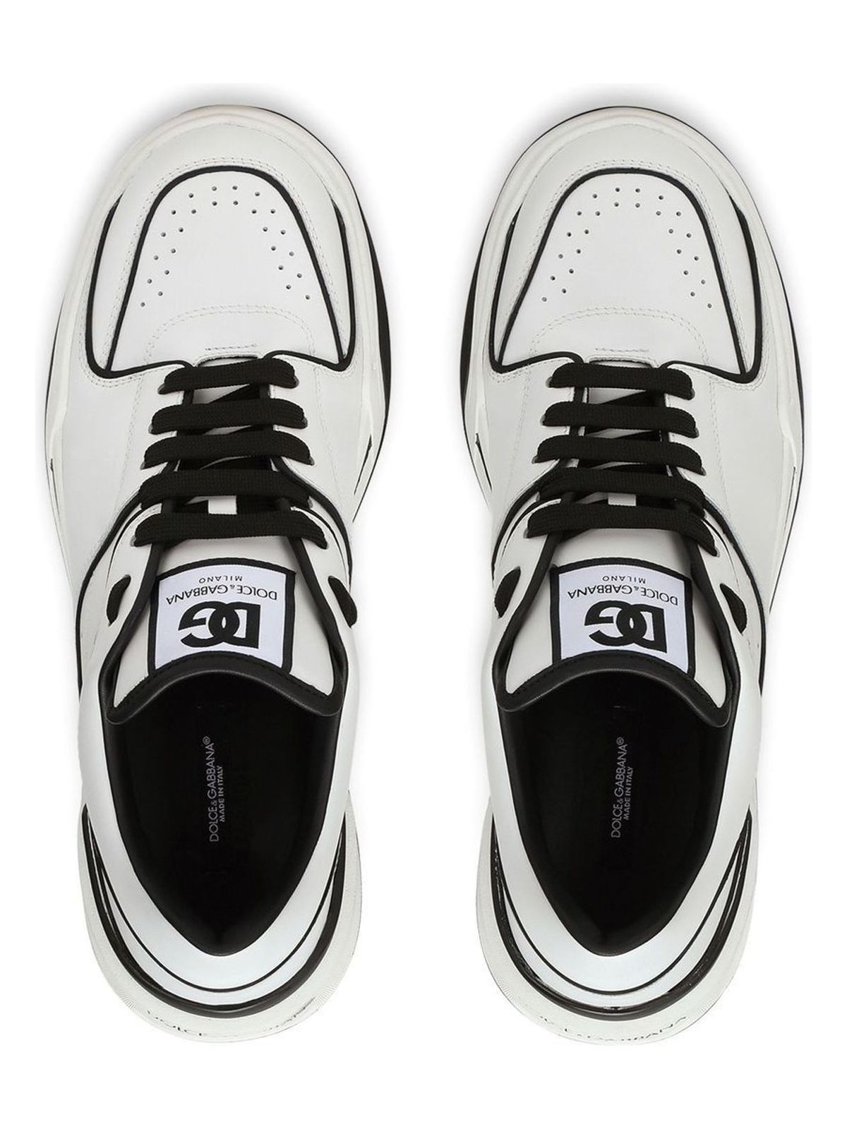 Step out in style with these white leather sneakers featuring black profiles and details from Dolce & Gabbana. With a rounded toe, laces, padded tongue with logo, and a rubber sole, these sneakers are the perfect combination of comfort and luxury.