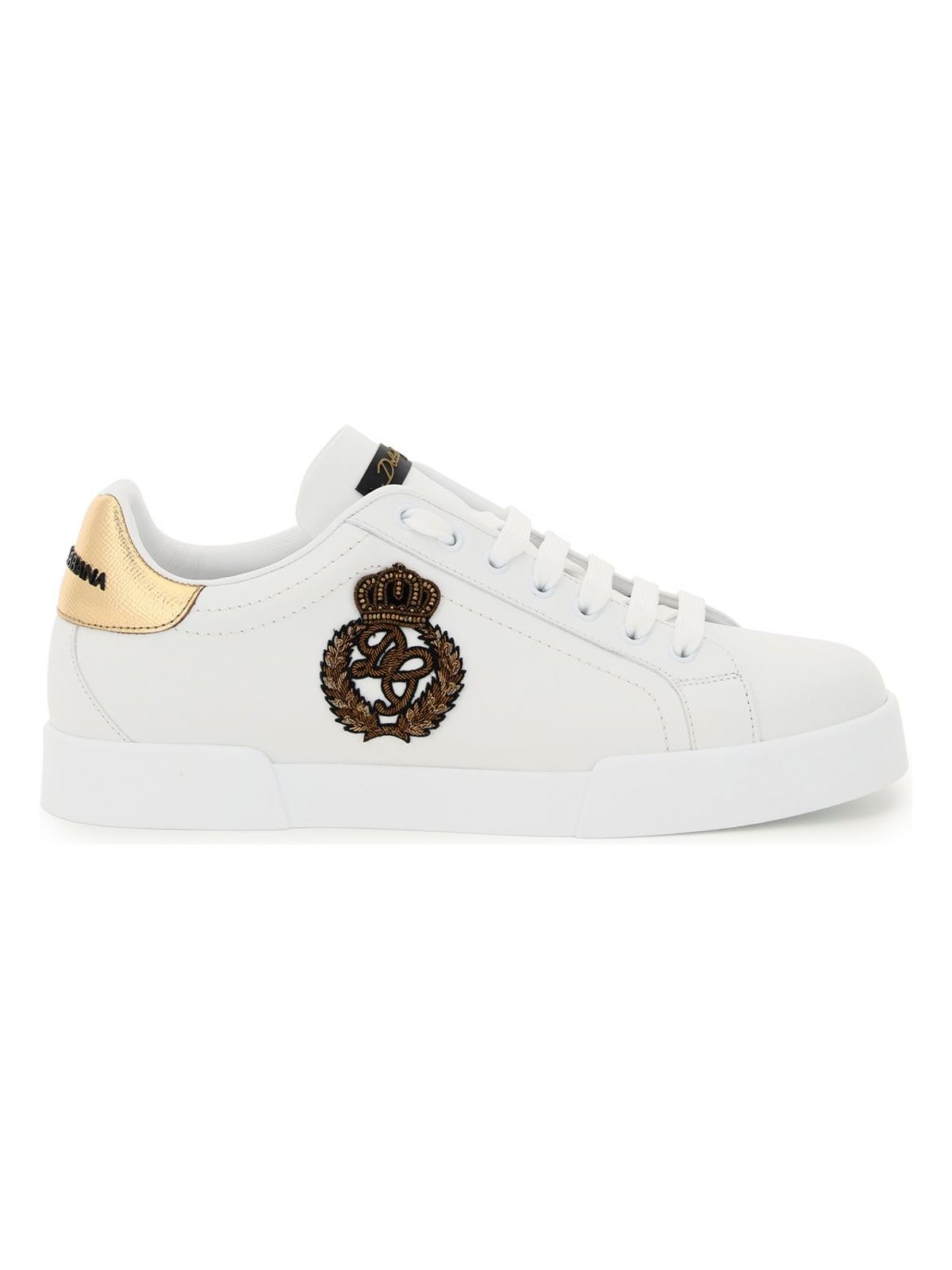 THE TIMELESS WHITE SNEAKER BY DOLCE & GABBANA IS REWORKED WITH GOLD INSERTS AND A PATCH THAT ADD AN ELEGANT TOUCH TO THIS SPORTSWEAR SHOE.
