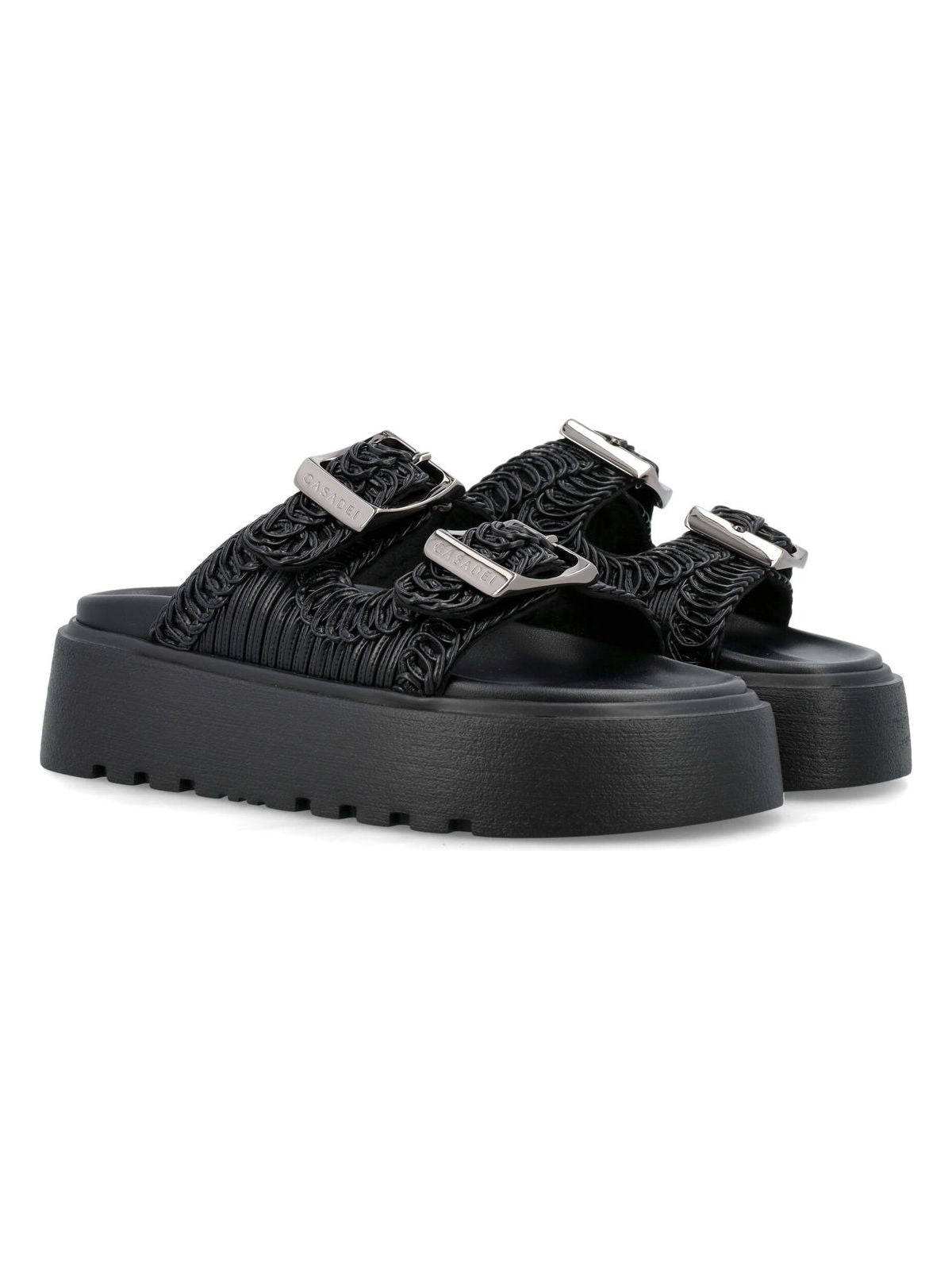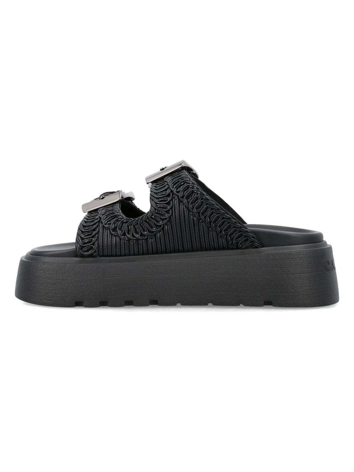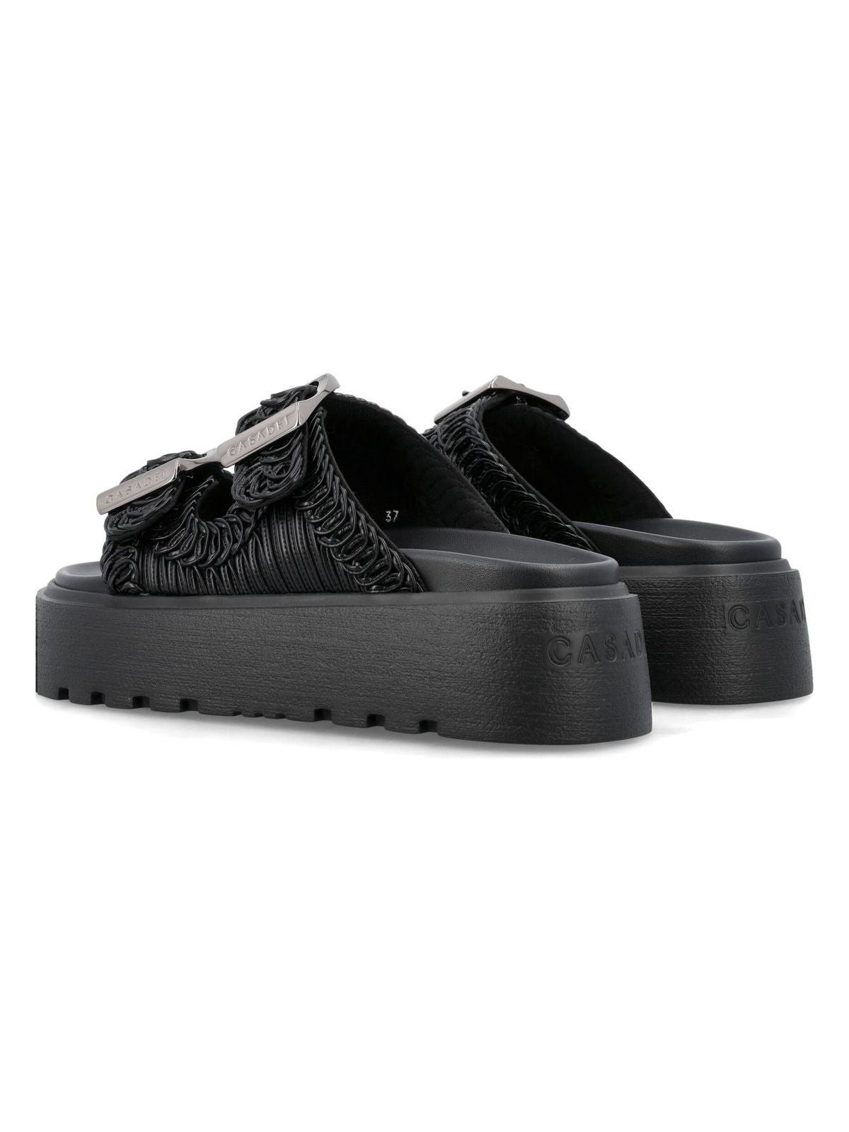 Step out in style with these slip-on mules that feature a unique decorative upper texture and a high sole for a trendy look. The two buckle closure adds a touch of edginess to this effortlessly cool pair of shoes.