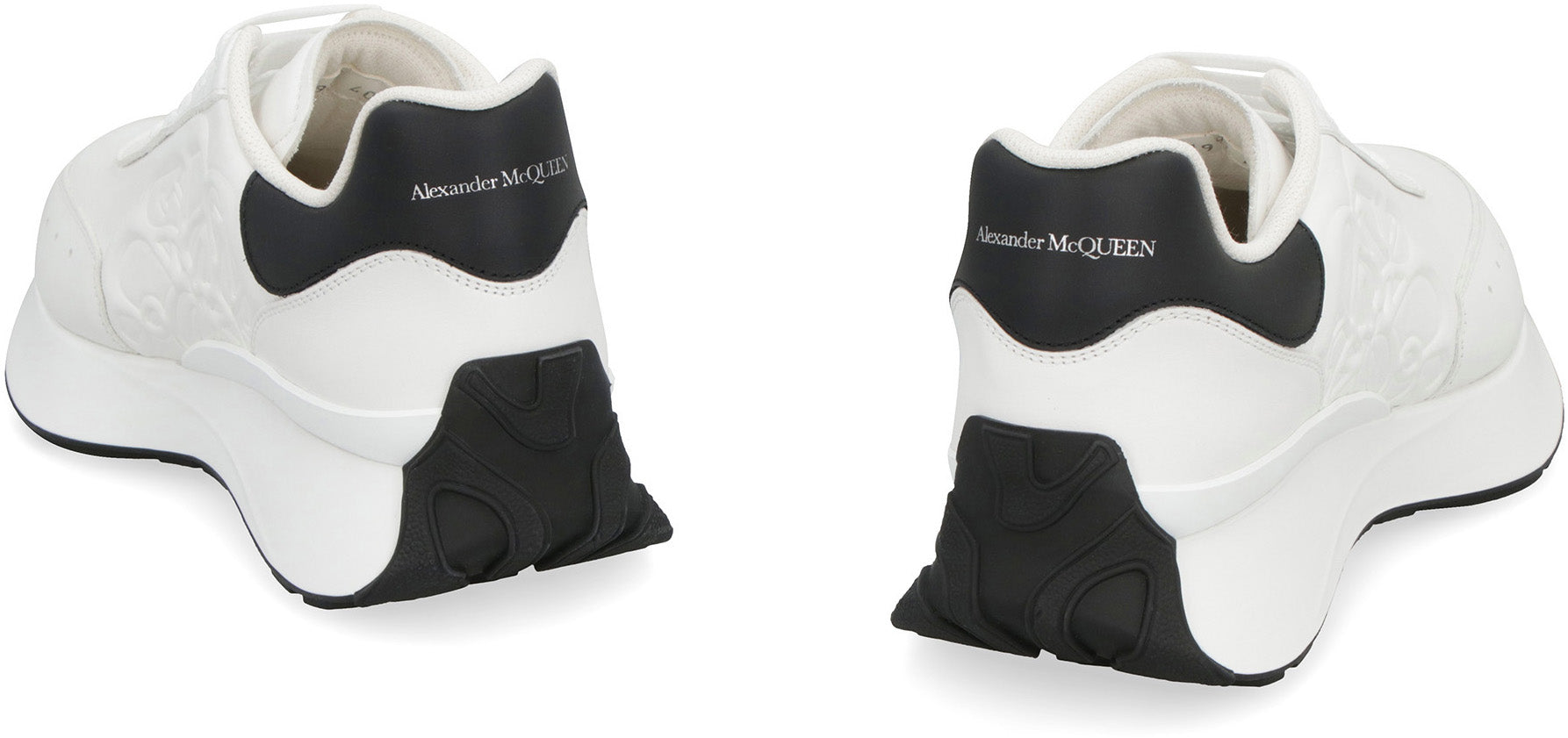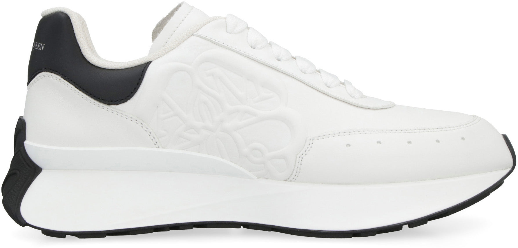 Elevate your sneaker game with these stunning SPRINT RUNNER SNEAKERS from Alexander McQueen. Crafted from luxurious nappa leather, these sneakers feature an embossed monogram on the outer side and a contrasting heel with the brand's iconic lettering logo. The large flat laces, signature tongue, and removable insole provide comfort and style, while the two-tone oversized rubberized runner sole adds a bold and modern touch to this must-have pair.