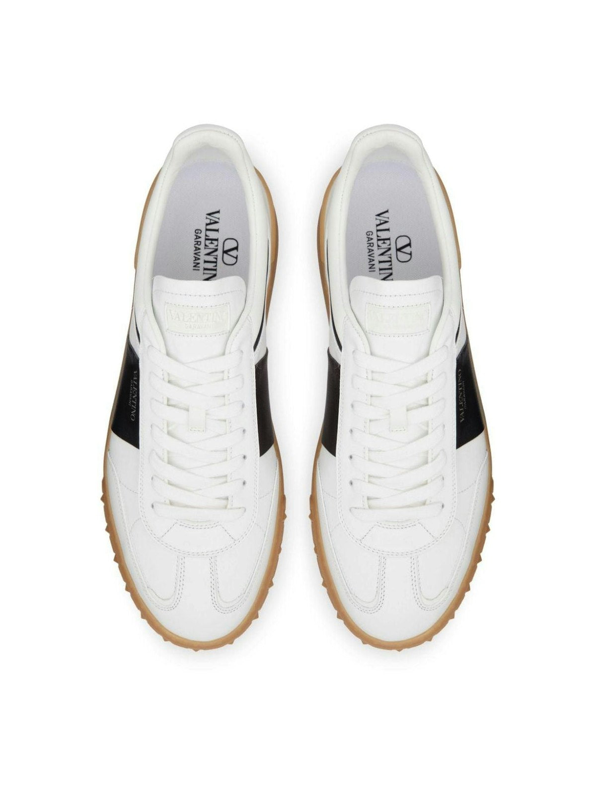 Step out in style and comfort with these low top upvillage sneakers. Made with white nappa calfskin and side black bands, these sneakers feature a lace-up closure, Valentino Garavani logo on the tongue and band, and a rubber sole with stud detailing. Perfect for adding a touch of casual sophistication to any outfit.
