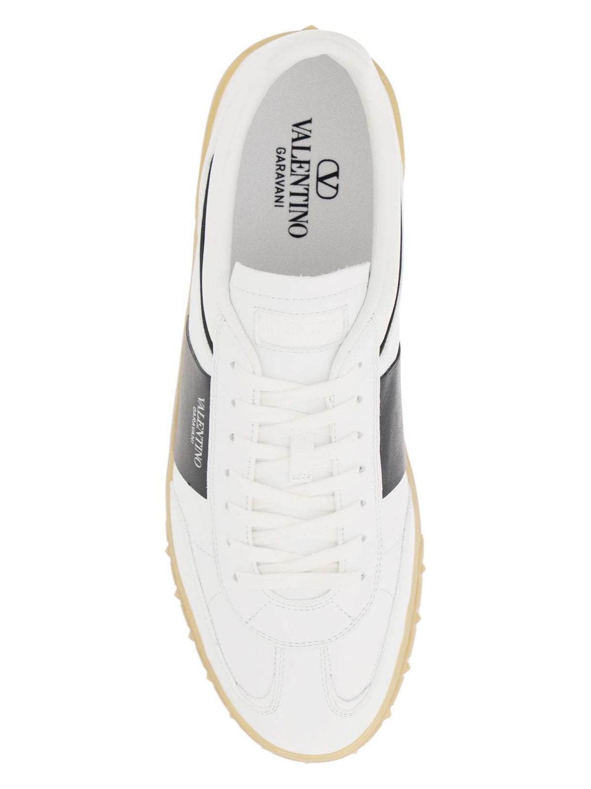 Step up your sneaker game with these Nappa leather low top Upvillage sneakers from Valentino Garavani. The padded leather ankle and iconic contrasting side band featuring a laminated logo add a touch of luxury to this casual style. With a rubber inlay, embossed logo on the tongue, and removable fabric insole, these sneakers offer both comfort and style. Plus, the rubber sole with embossed studs on the toe and replacement laces included make these sneakers a must-have for any fashion-forward individual.