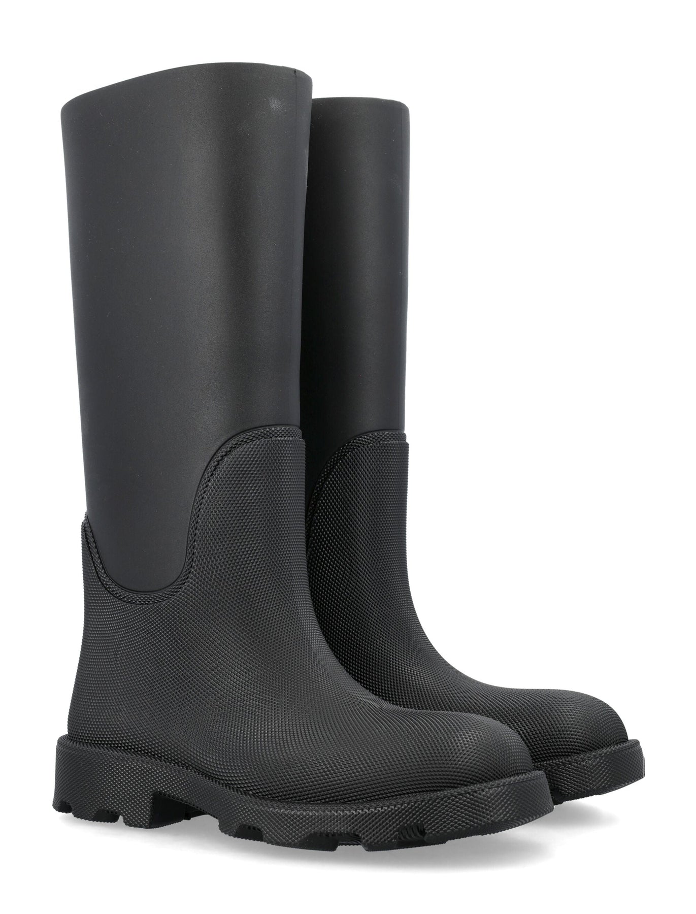 Unleash your inner fashion rebel with these high-top boots from Burberry London. Crafted with a rubber upper and sole, these boots feature a squared toe and studded rubber details for an edgy, yet sophisticated look. The 3.5cm heel adds just the right amount of height, making these boots perfect for all-day wear.