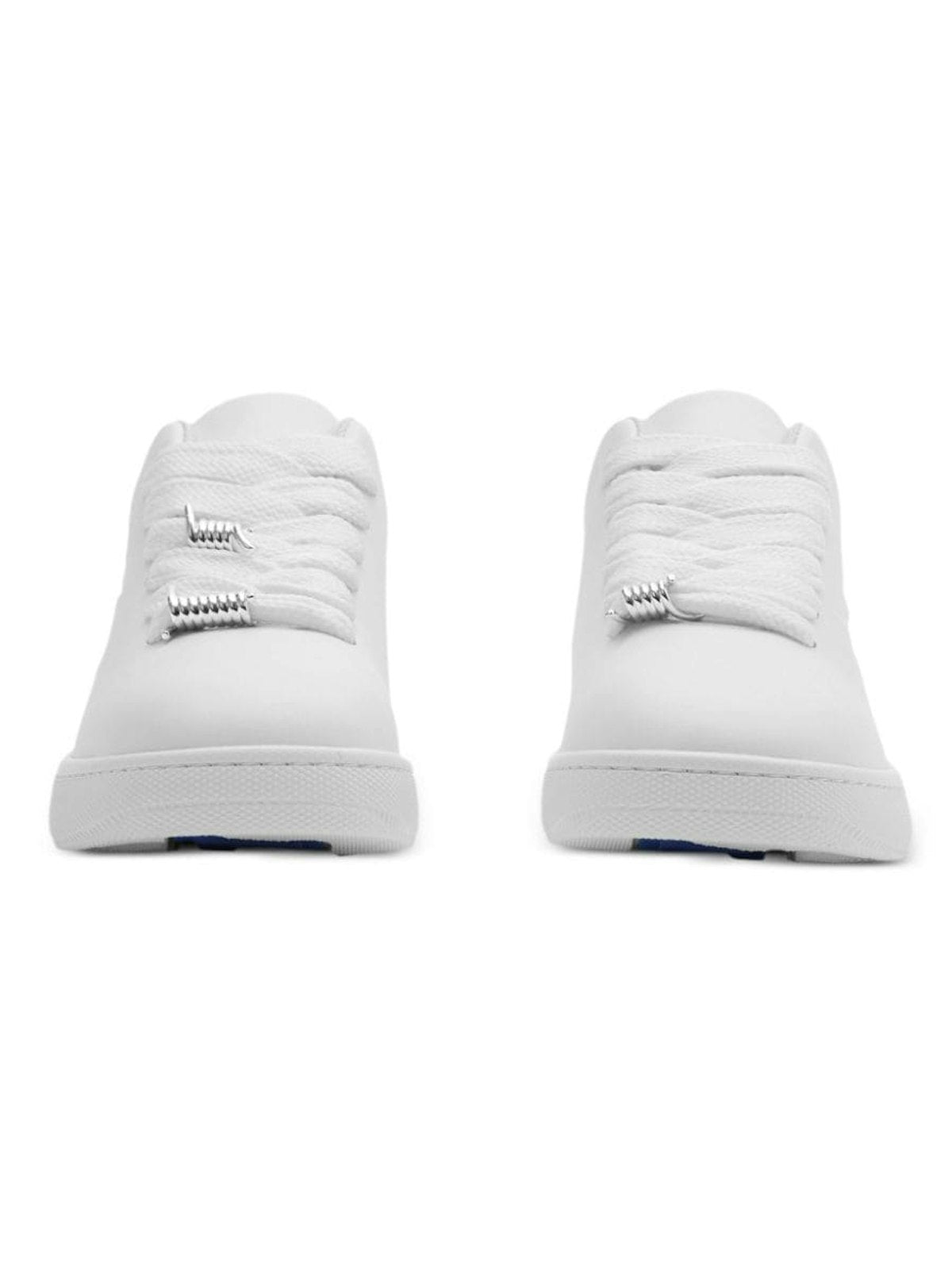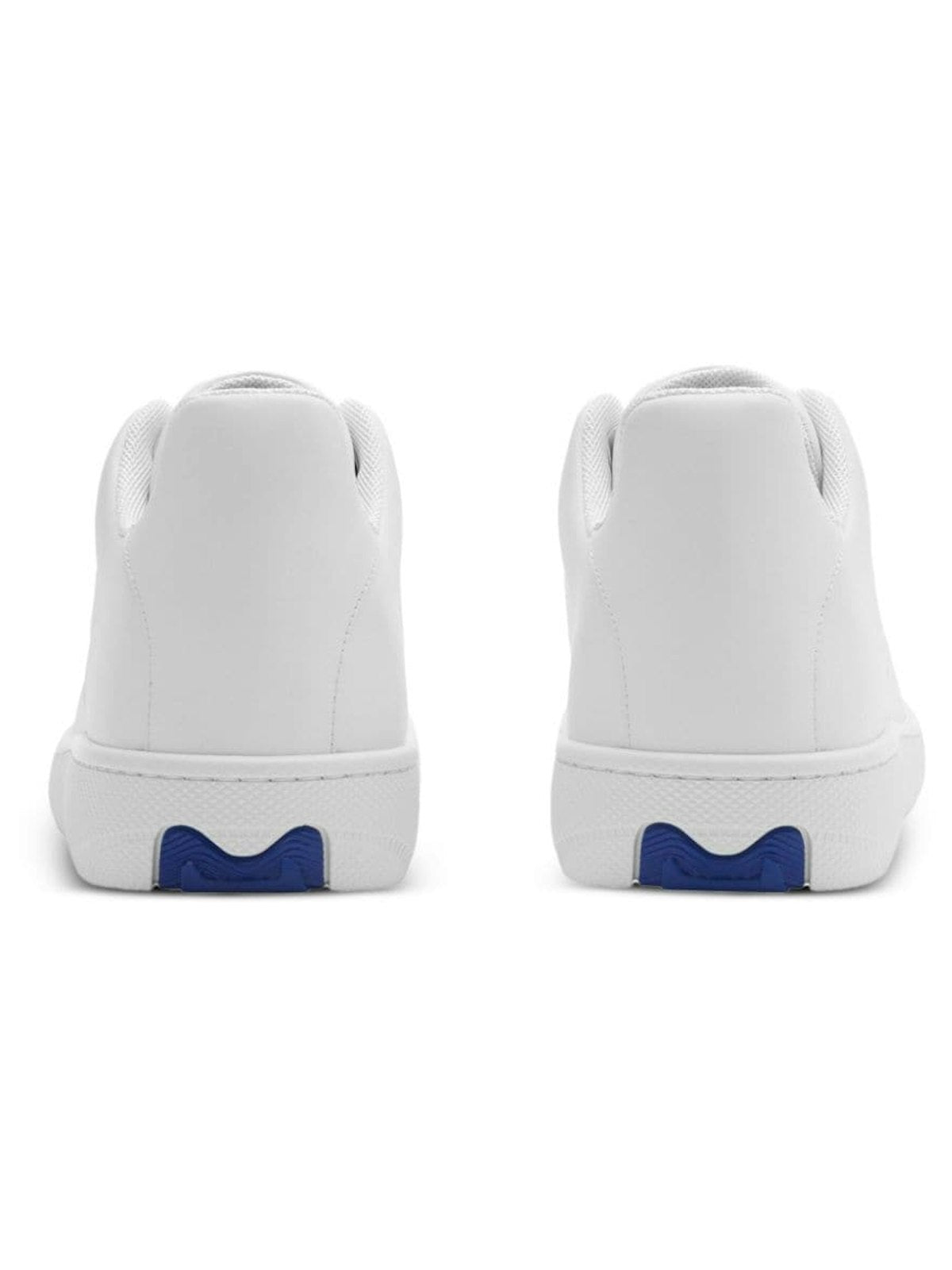 BURBERRY'S SNEAKERS BOX ARE MADE OF SMOOTH LEATHER AND EMBELLISHED WITH AN EMBOSSED EQUESTRIAN KNIGHT DESIGN ON THE SIDE, AS WELL AS A BARBED WIRE DETAIL ON THE LACES. THEY FEATURE A SQUARE TOE, A MESH-LINED INTERIOR WITH A REMOVABLE CHECK INSOLE, AND A MOLDED RUBBER SOLE WITH A CONTRASTING OVERSIZED LOGO.