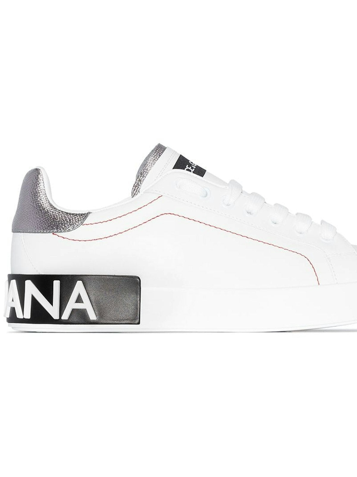 WHITE/SILVER-TONE/RED CALF LEATHER METALLIC-EFFECT HEEL COUNTER LOGO PATCH AT THE TONGUE EMBOSSED RUBBER LOGO TO THE REAR CONTRAST STITCHING ROUND TOE FRONT LACE-UP FASTENING FLAT RUBBER SOLE