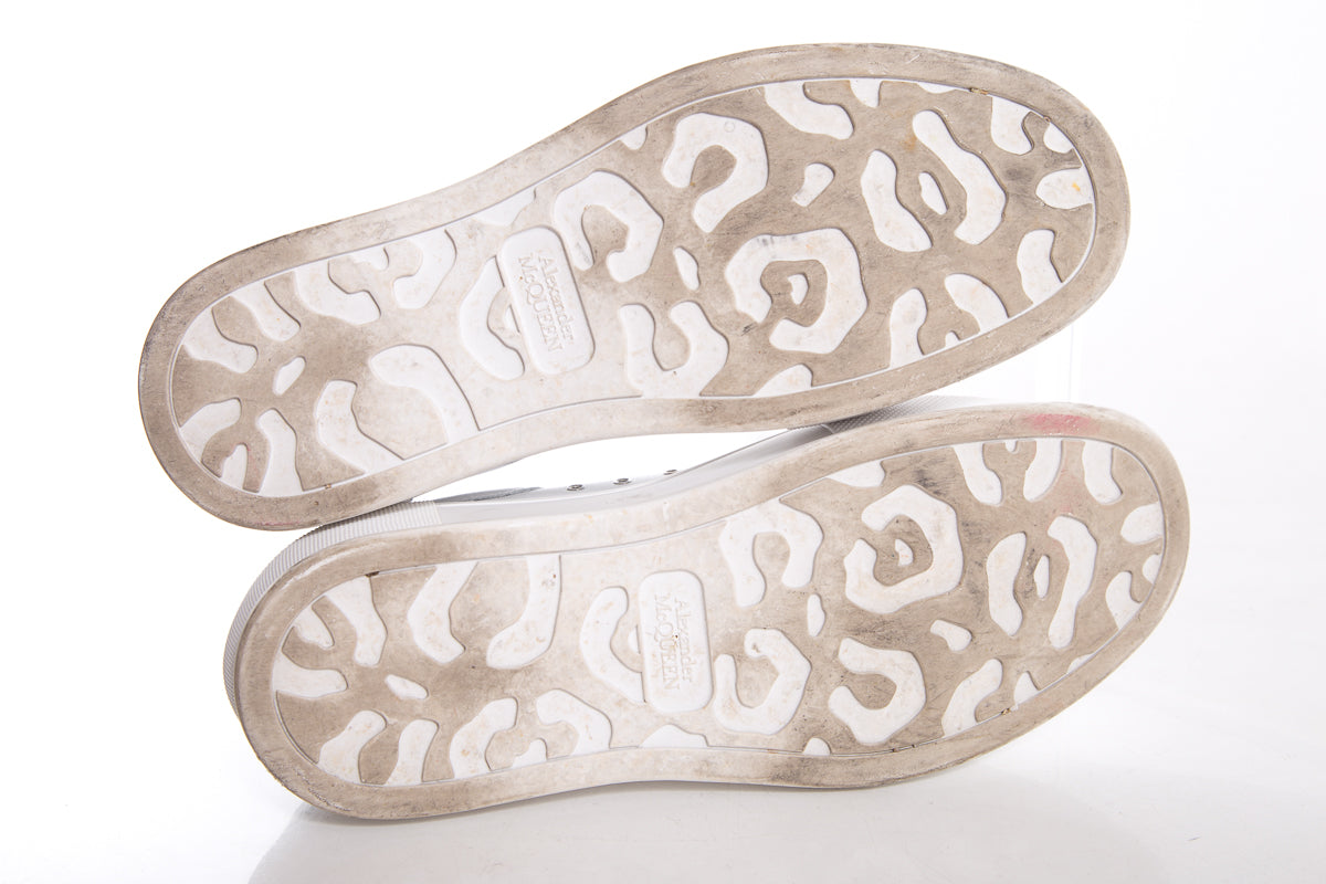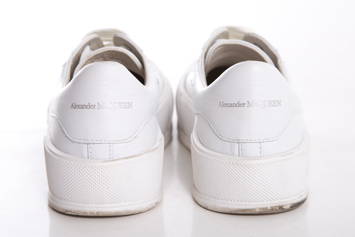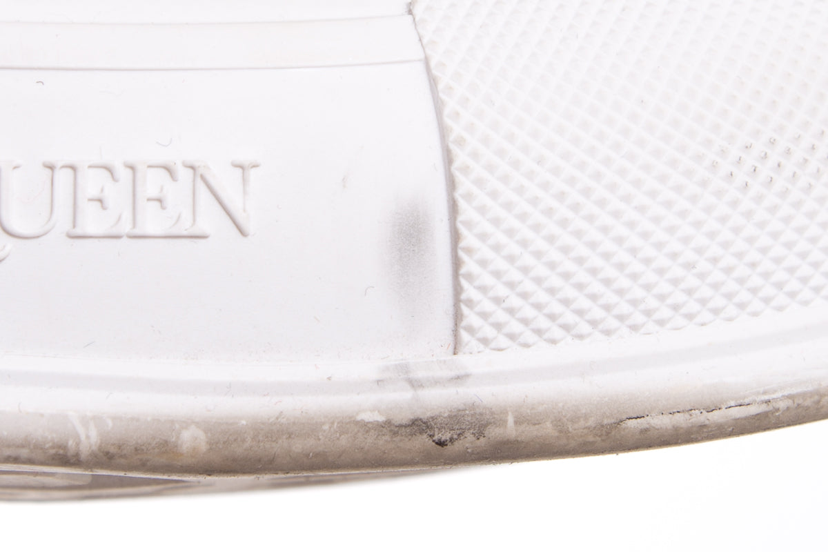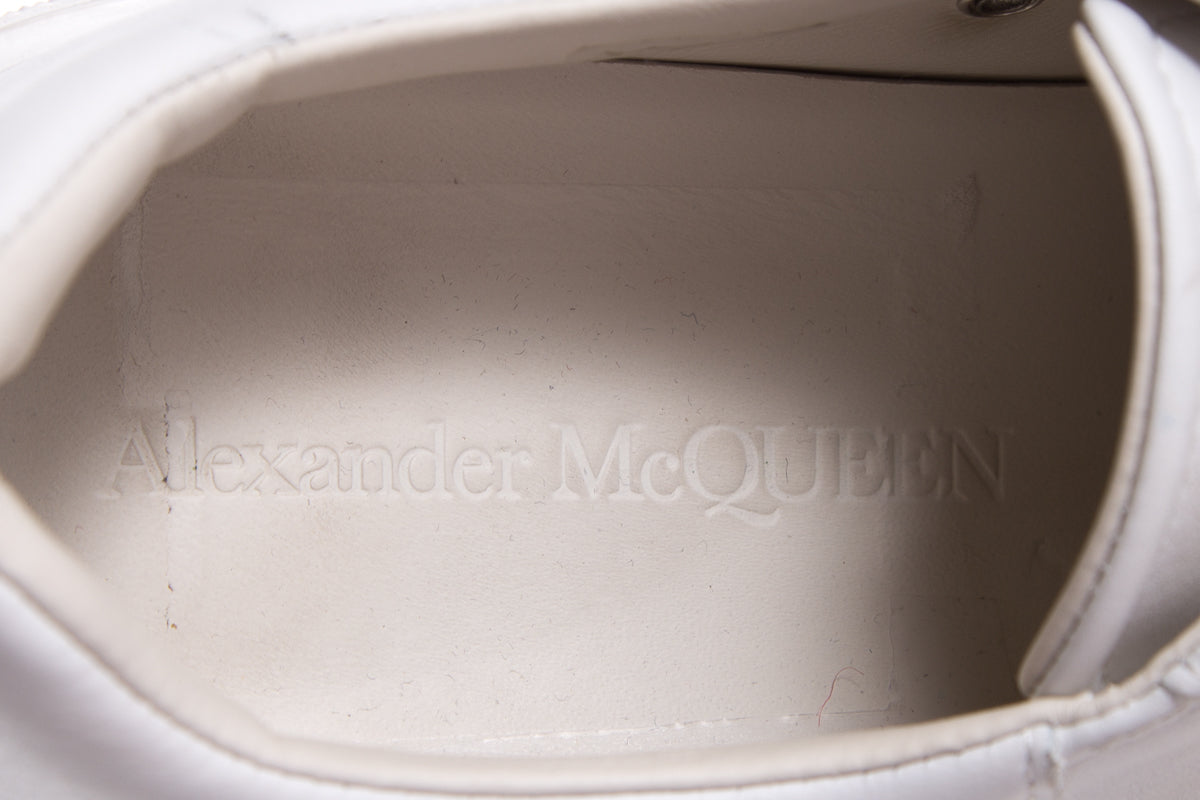 Alexander McQueen White Leather Sneakers and rubber bottom and lace up. This item is gently loved with some wear to soles and some marks throughout.