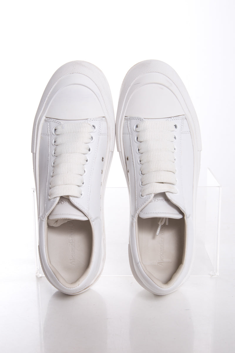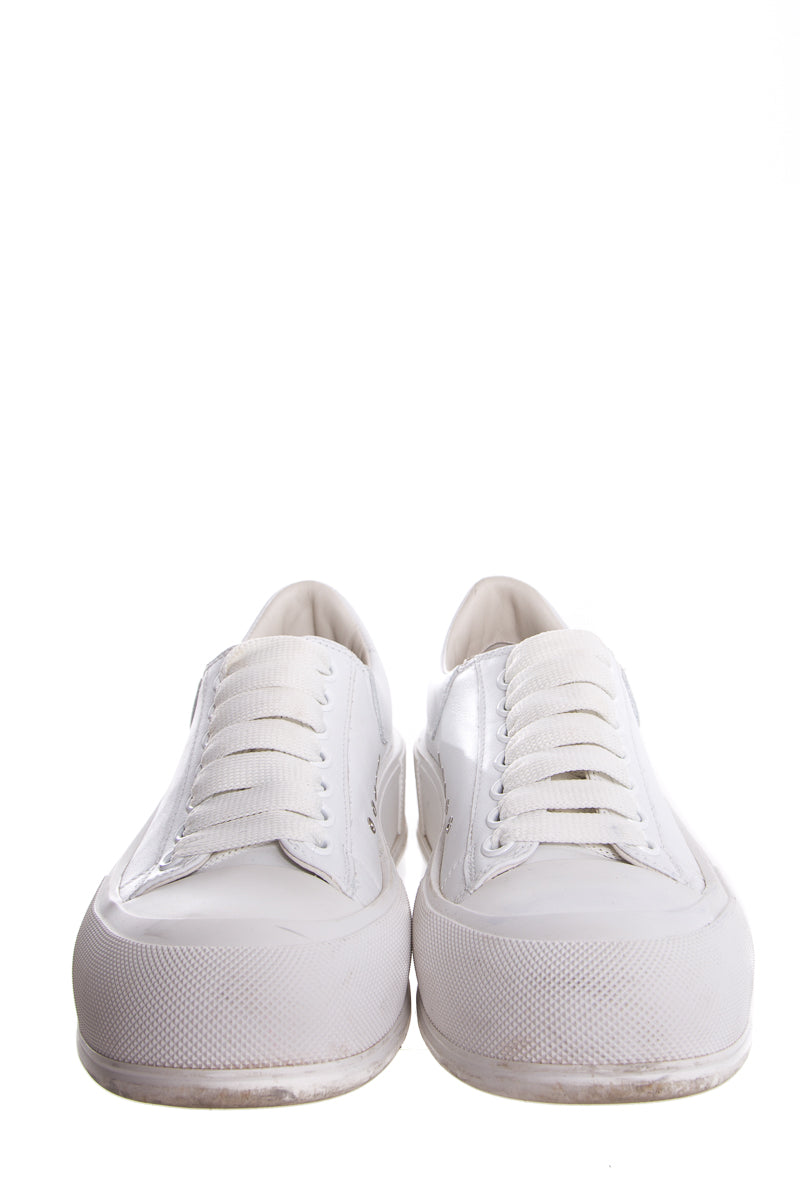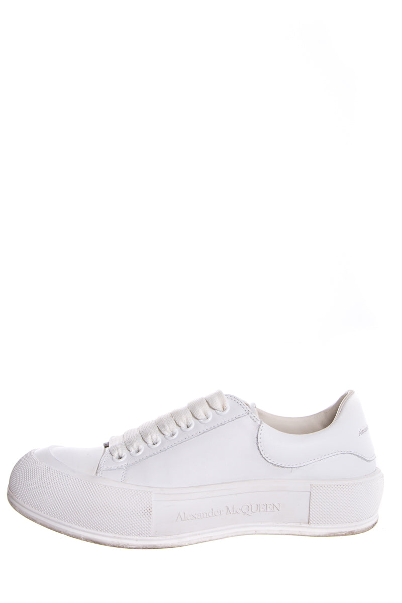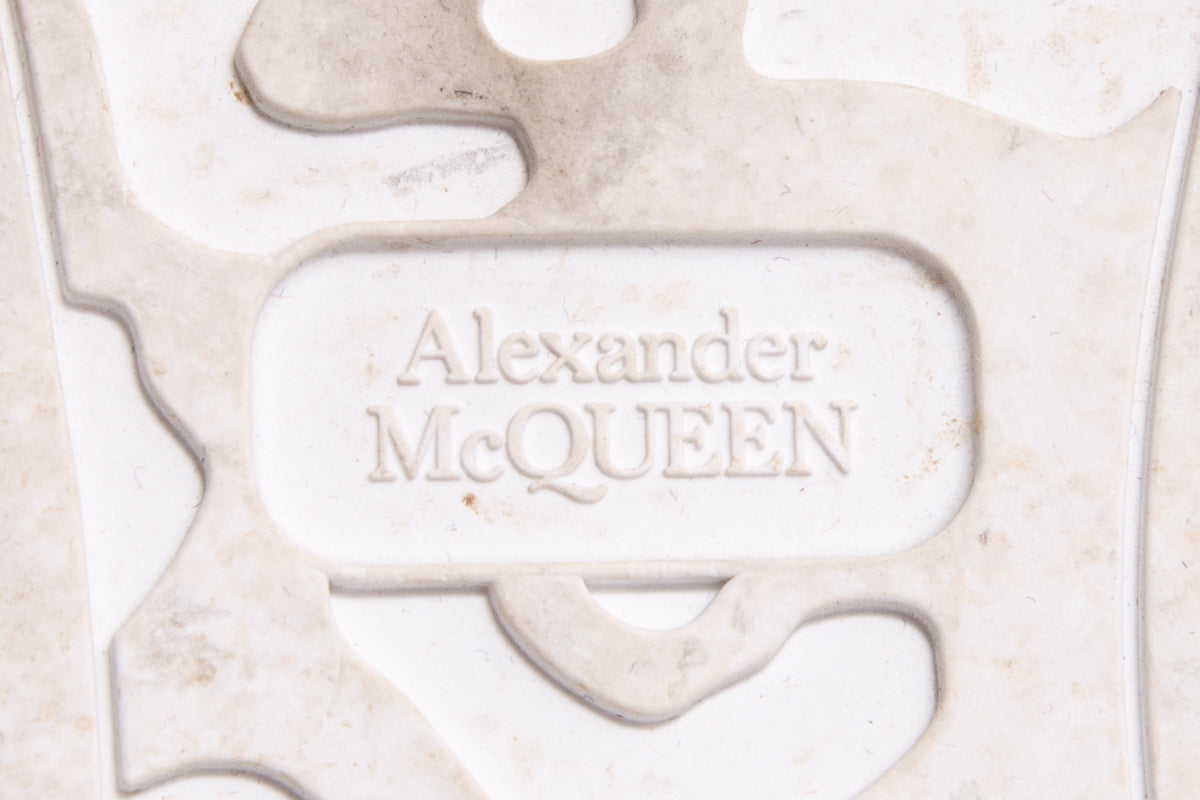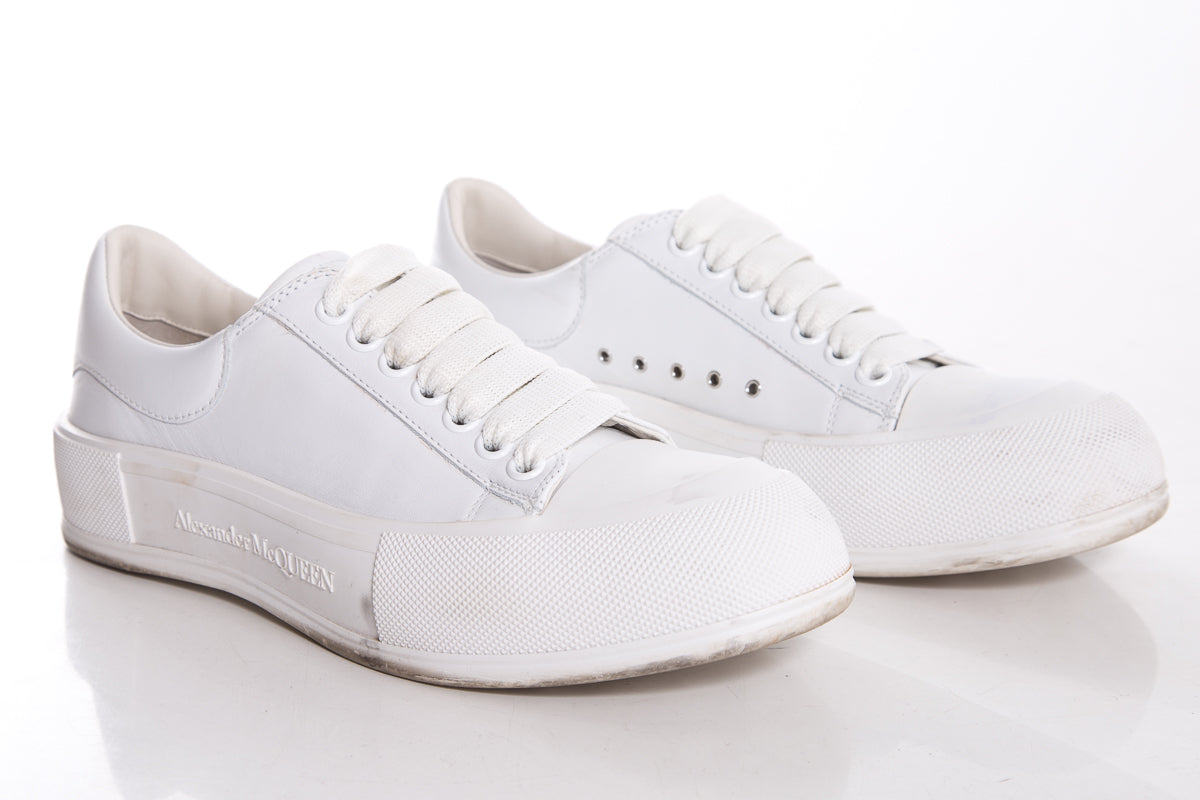 Alexander McQueen White Leather Sneakers and rubber bottom and lace up. This item is gently loved with some wear to soles and some marks throughout.