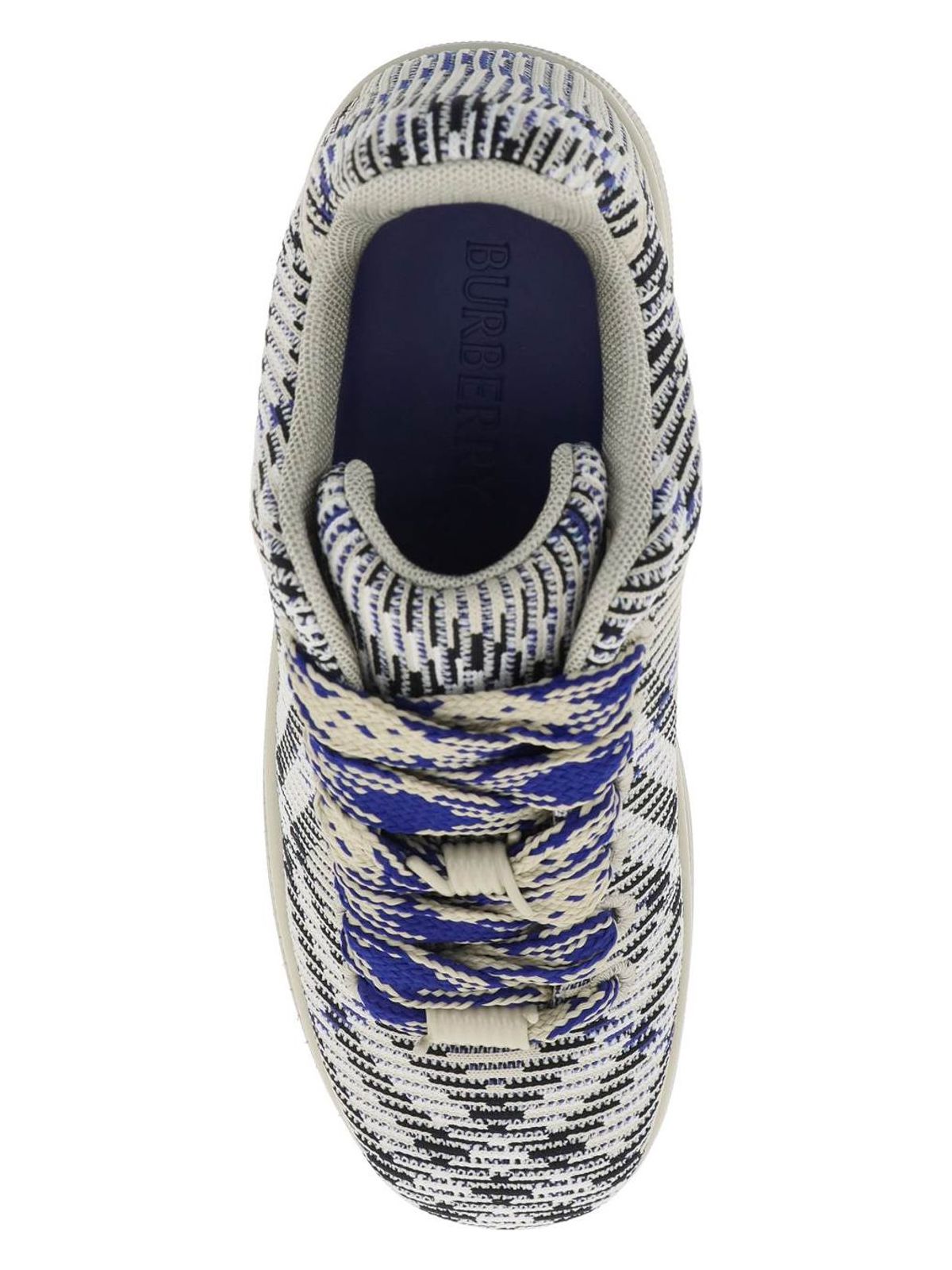 Step up your sneaker game with these stretch nylon Burberry sneakers featuring a knitted check pattern and oversized laces with enamel-coated barbed wire details. The mesh lining, removable leather insole, and iconic Burberry archive lettering on the molded rubber sole make these a stylish and comfortable choice for any occasion.